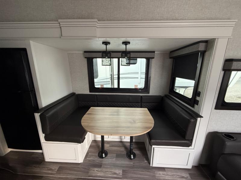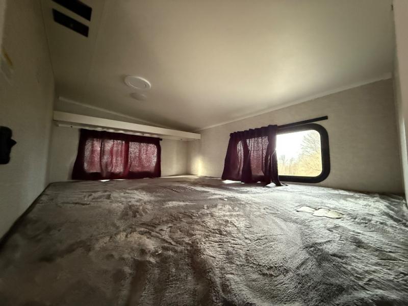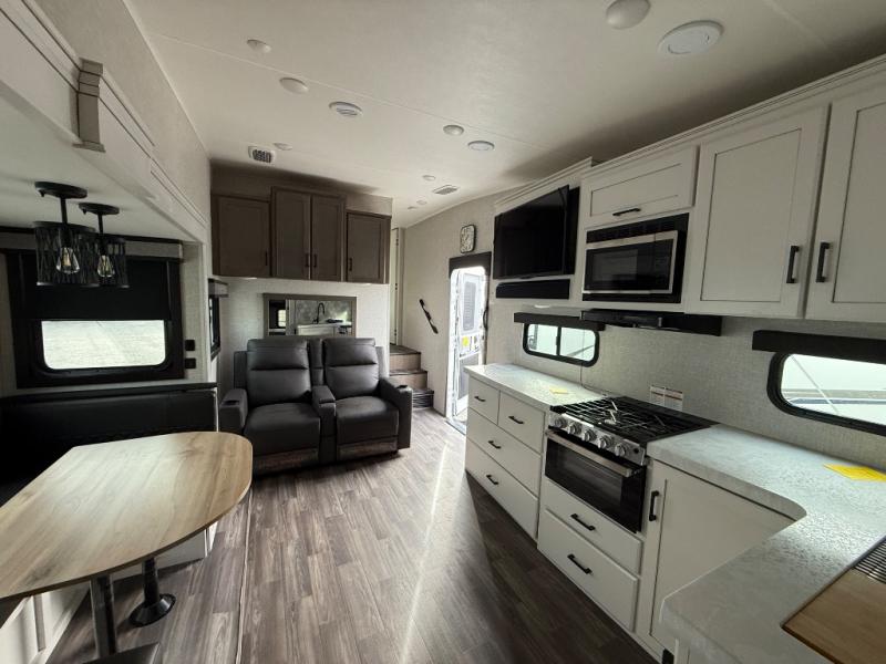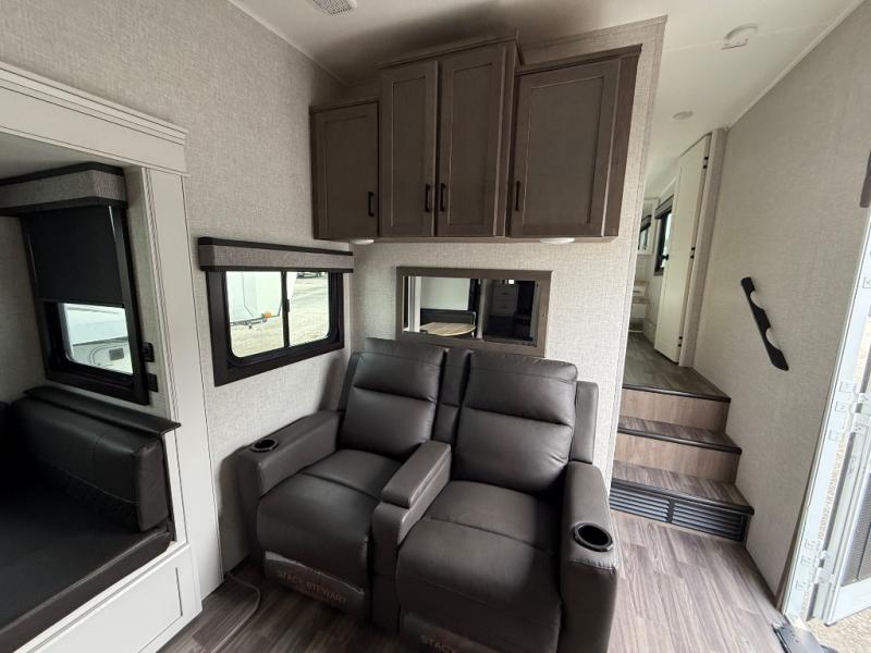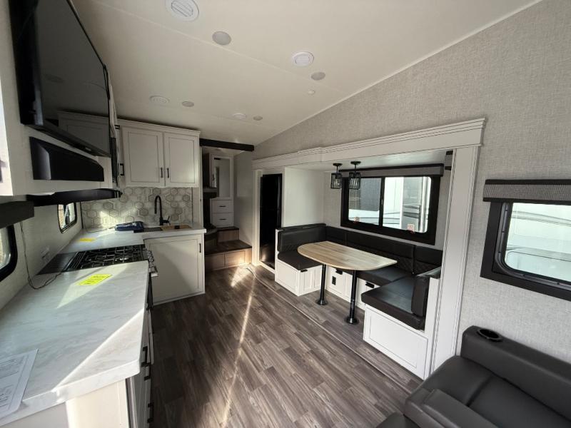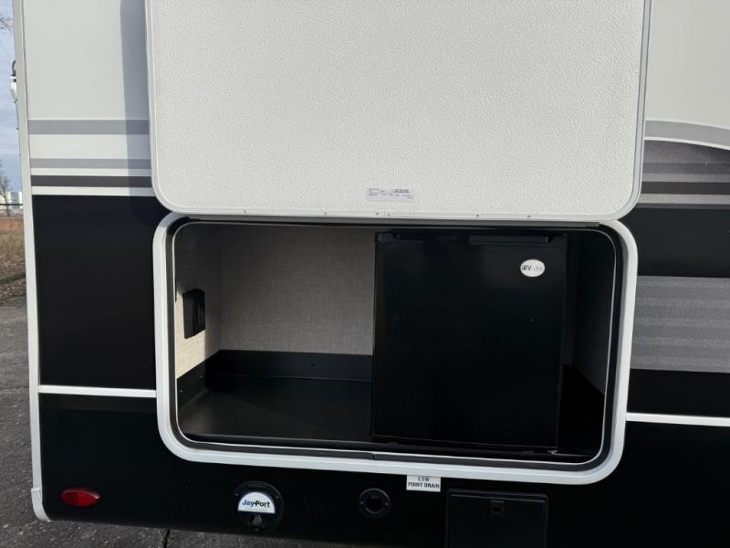 If you're needing a fifth wheel with more sleeping space, this unit will be perfect for you! There are double-size bunks in the back with a wardrobe for your guests' things and TV prep if you want to add a TV here. The front private bedroom up front will have you feeling right at home with its queen bed and dual wardrobes, and any additional guests you have can sleep on the U-shaped dinette within the slide out. There is also a theater seat here where you can relax with a good book in the evenings. The Jayport with LP Quick Connect outside will let you add the optional griddle, and the 19' power awning will provide shade during the day!