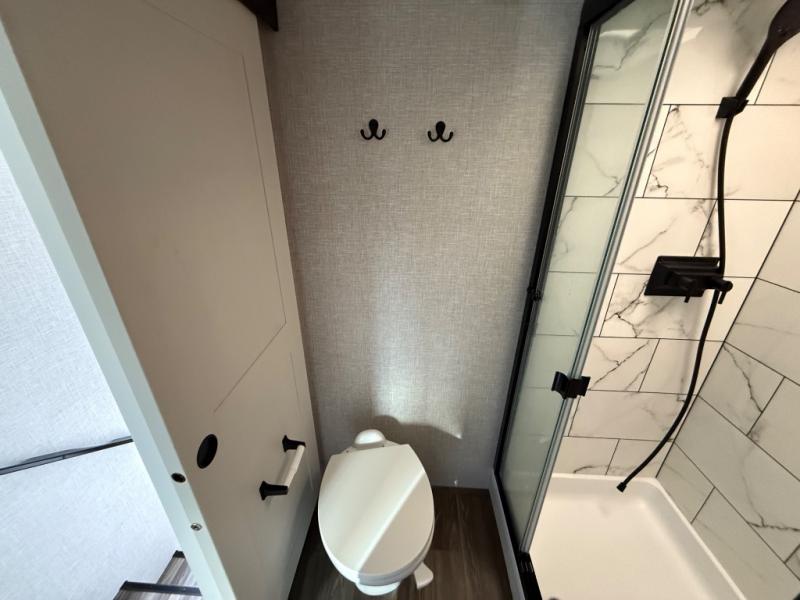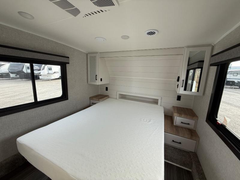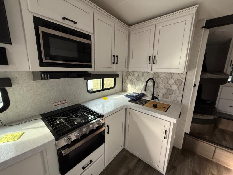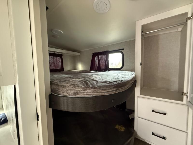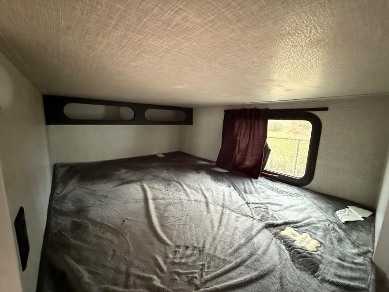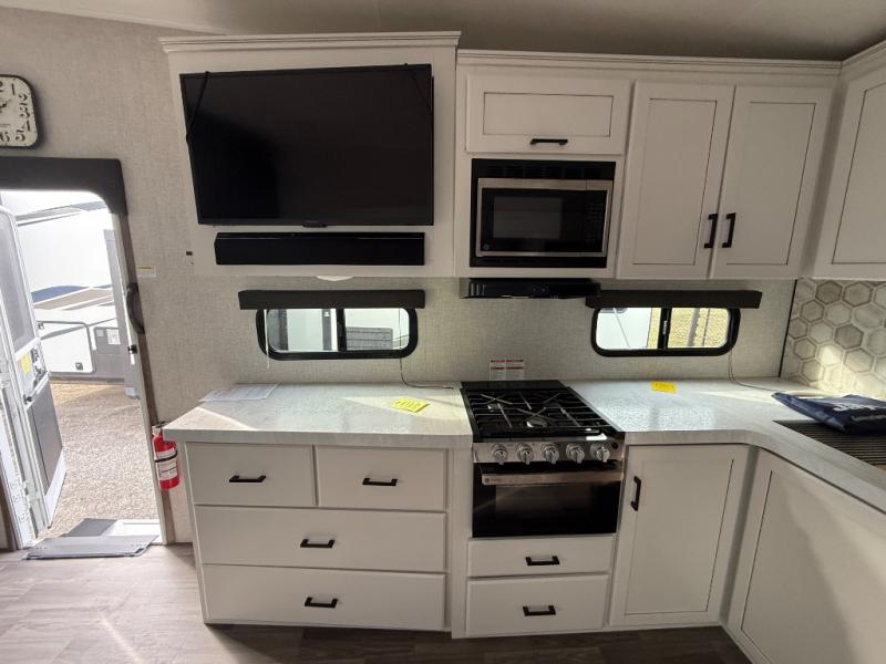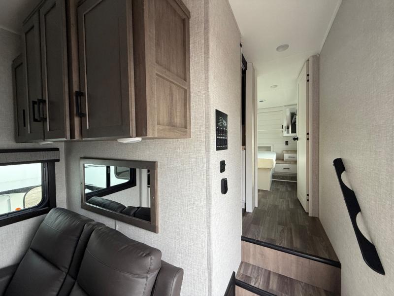 If you're needing a fifth wheel with more sleeping space, this unit will be perfect for you! There are double-size bunks in the back with a wardrobe for your guests' things and TV prep if you want to add a TV here. The front private bedroom up front will have you feeling right at home with its queen bed and dual wardrobes, and any additional guests you have can sleep on the U-shaped dinette within the slide out. There is also a theater seat here where you can relax with a good book in the evenings. The Jayport with LP Quick Connect outside will let you add the optional griddle, and the 19' power awning will provide shade during the day!