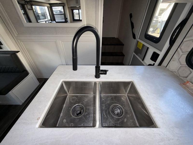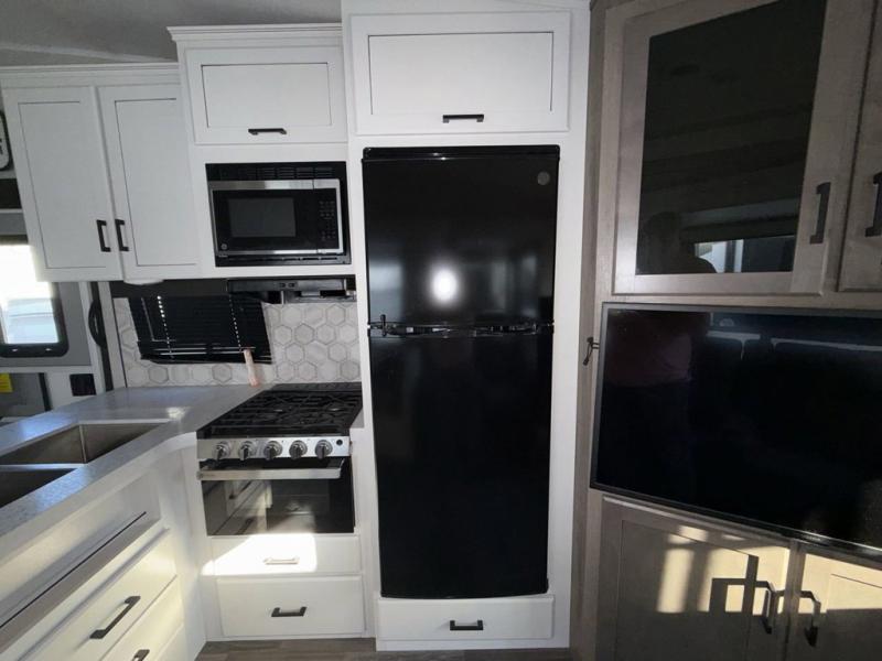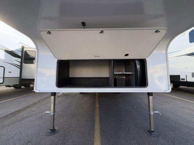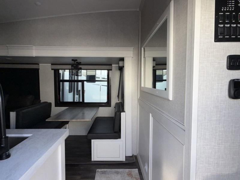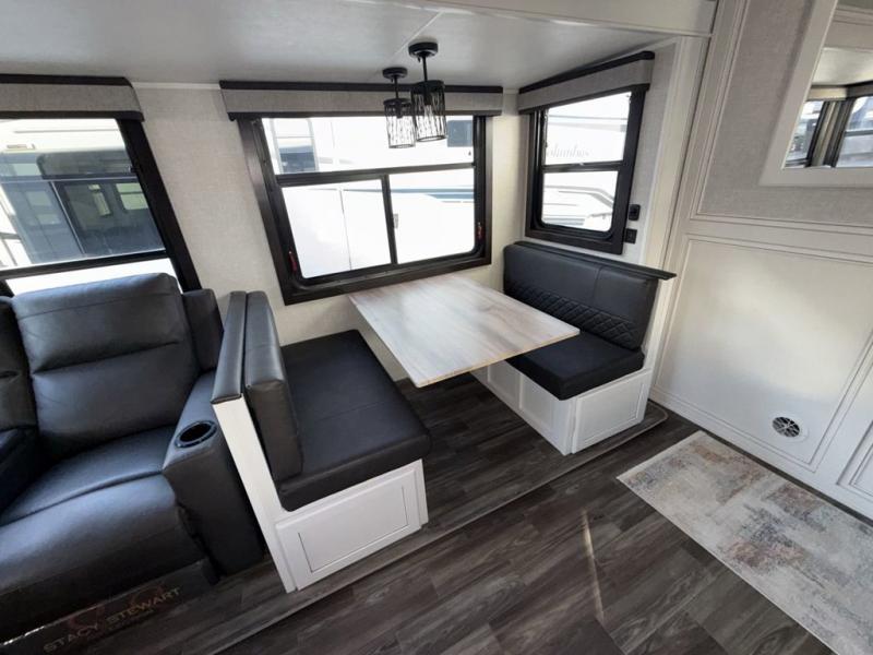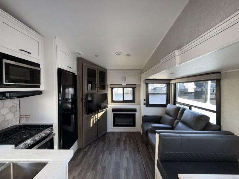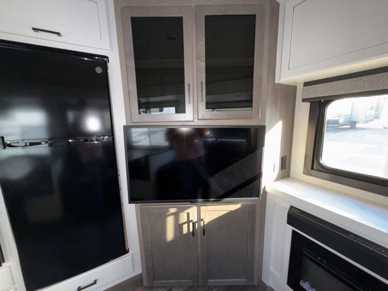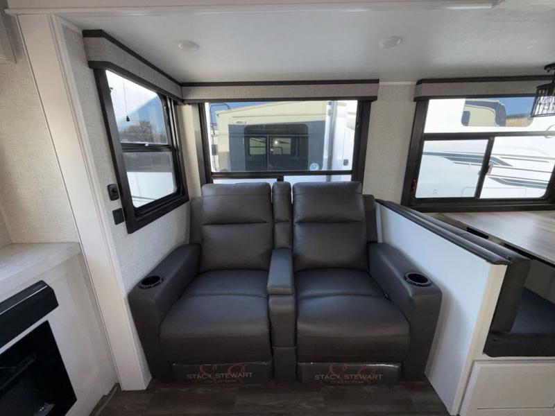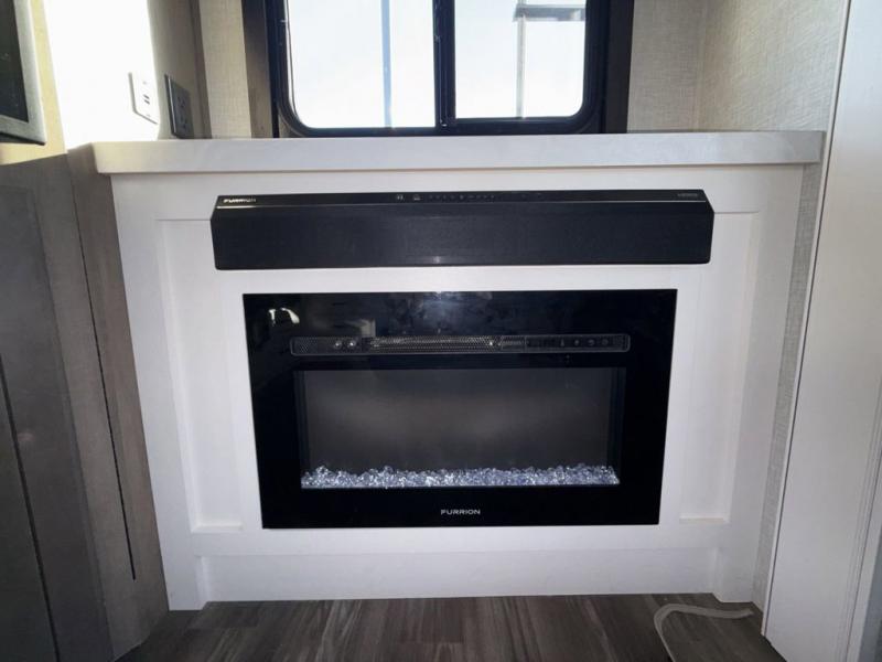 This is the perfect couple's fifth wheel since it features sleeping space for two up front! You can use the dual bedroom wardrobes to store your clothes in, and the full bath is close by so you can get ready each morning. After you've whipped up breakfast in the kitchen, you can dine at the table and chairs with bench seating, then relax with your coffee on the theater seat. There is an entertainment center across from the sofa for convenience, plus a hidden walk-in pantry behind the TV. You might even like to add the fireplace option to make it feel more like home!