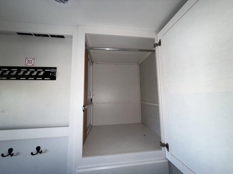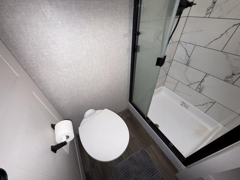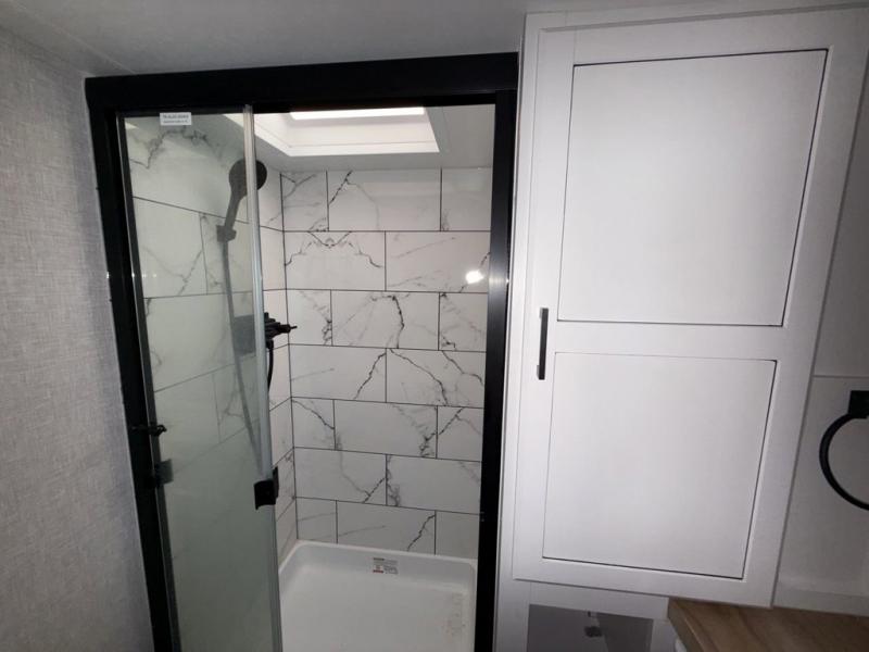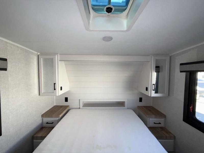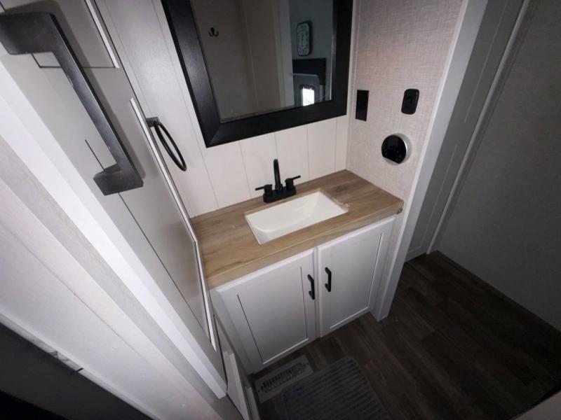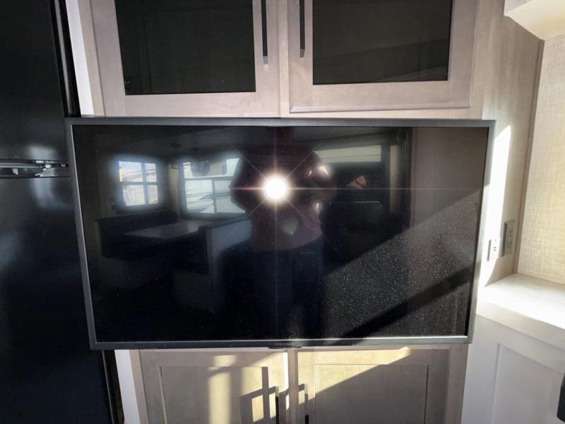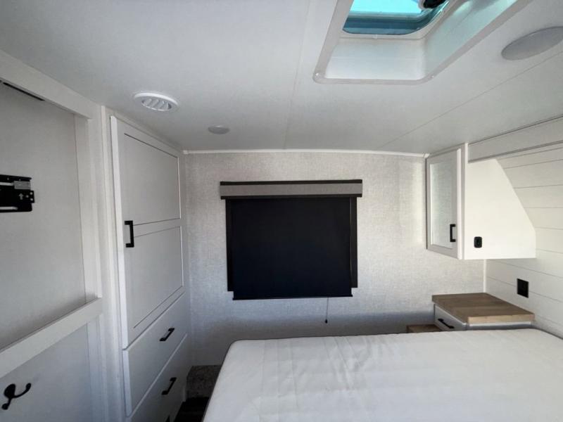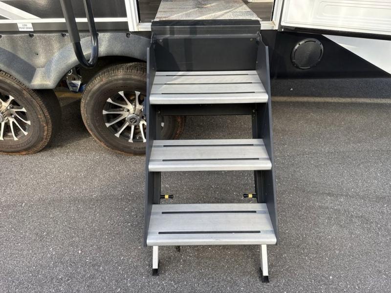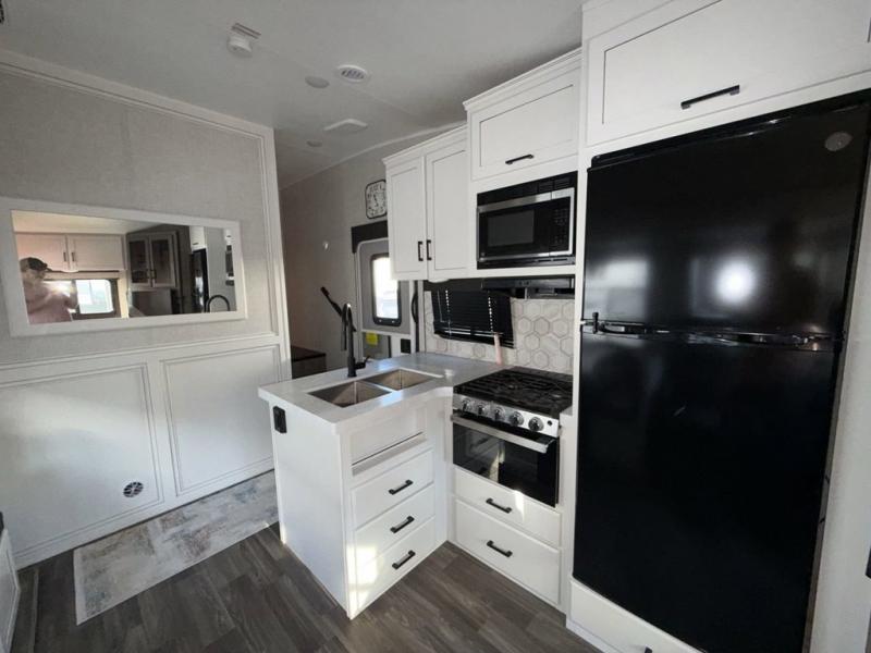 This is the perfect couple's fifth wheel since it features sleeping space for two up front! You can use the dual bedroom wardrobes to store your clothes in, and the full bath is close by so you can get ready each morning. After you've whipped up breakfast in the kitchen, you can dine at the table and chairs with bench seating, then relax with your coffee on the theater seat. There is an entertainment center across from the sofa for convenience, plus a hidden walk-in pantry behind the TV. You might even like to add the fireplace option to make it feel more like home!