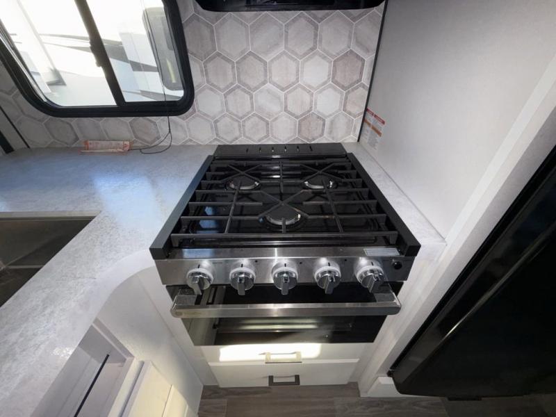 With any Eagle HT fifth wheel by Jayco you will enjoy a smooth drive thanks to the 4 Star Handling Package, Goodyear Endurance tires, and MORryde CRE-3000 rubberized suspension. The Customer Value Package includes amenities that are sure to make camping easier than ever, like the 60K on-demand water heater, Keyed-Alike lock system, electric awning with integrated LED lights, and more. Handcrafted and glazed door/drawer fronts will make your space feel more like home, along with residential vinyl flooring throughout, motion activated LED lights, and blackout roller shades with reflective side throughout to keep the sun out when you want to sleep in. The HELIX Cooling System features Jayco's exclusive insulated dual duct design, directional and closeable A/C vents, and larger return air vents with user friendly filters to keep your crew comfortable all summer long. Choose an entry-level Eagle HT fifth wheel today!