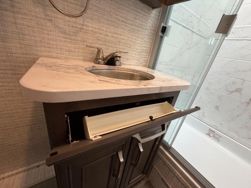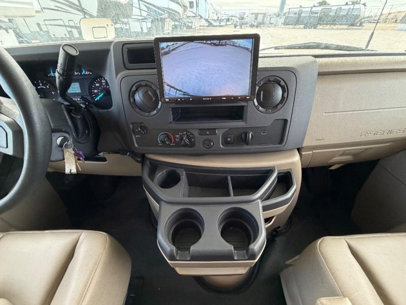 With any Greyhawk Class C gas motorhome by Jayco you will experience smooth sailing thanks to the JRIDE PLUS that comes with Koni shock absorbers, a computer-balanced driveshaft, Hellwig helper springs, and more. The Ford E-450 chassis with a 7.3L V8 325 HP engine will power your excursions, and you'll appreciate the added safety features for your peace of mind. Each model features a Sony infotainment center with Apple CarPlay and Android Auto, backup and side-view cameras, and a tire pressure monitor system the driver is sure to appreciate. Durable construction begins with Stronghold VBL roof, floor and sidewalls, bead-foam insulation, and a one-piece seamless fiberglass front cap. Head inside to find blackout night roller shades, LED-lit pressed countertops, an 84" interior ceiling height, and hardwood cabinet doors and drawers.