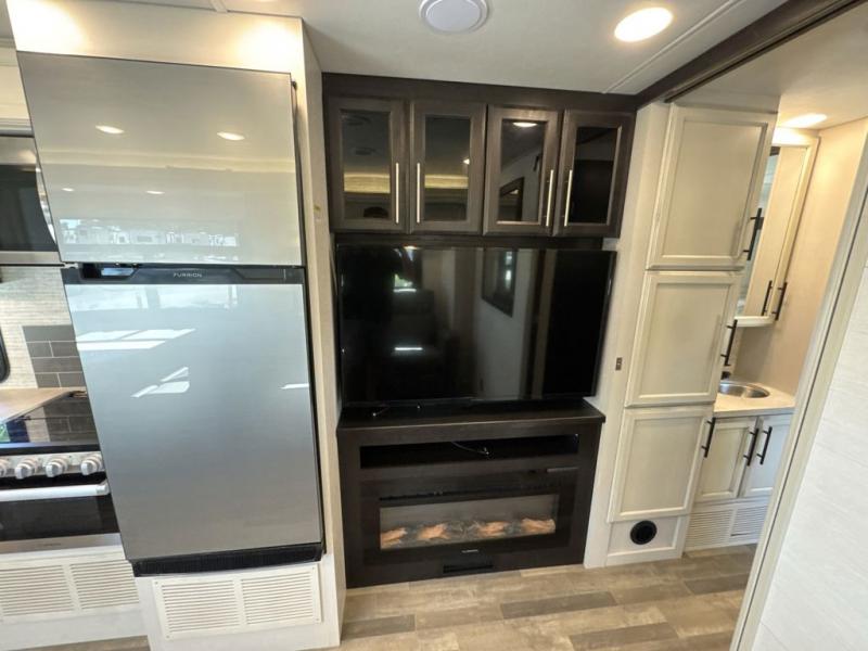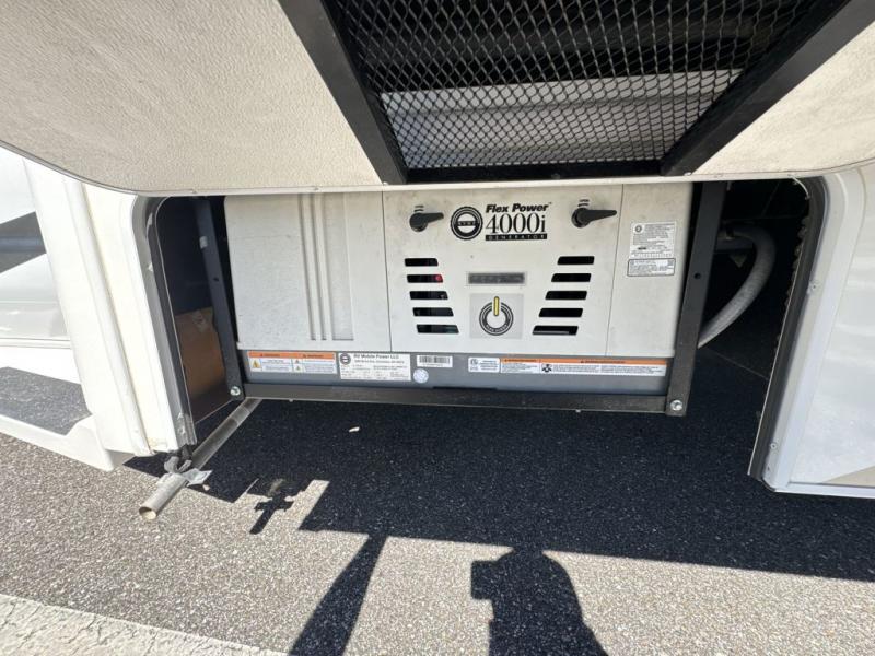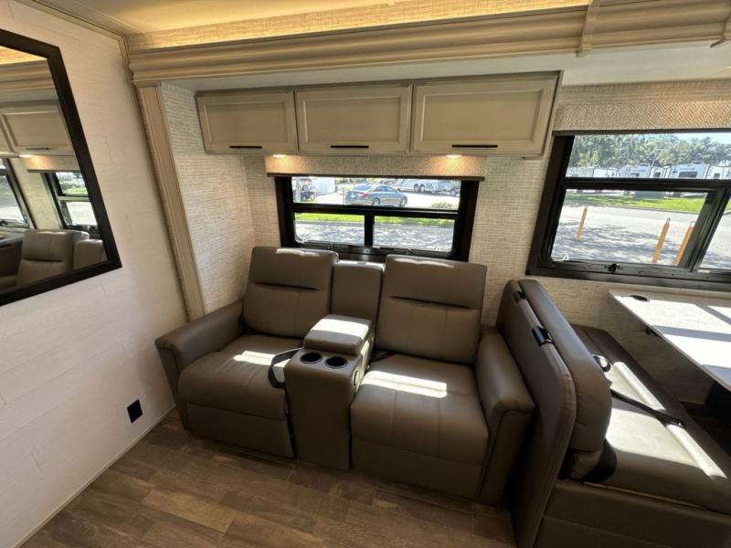 Pack your bags and head to your favorite camping spot in this spacious motorhome for six to seven. The little ones will love the cab-over bunk, and you'll have your own private bedroom in the back. There is also 72" theater seating and a 42" x 70" booth dinette that will serve as seating and sleeping space as well. This model will feel more like home with its fireplace, entertainment center with a 50" TV, and spacious living area. There is also a private toilet and shower, with the sink across the hall for convenience.