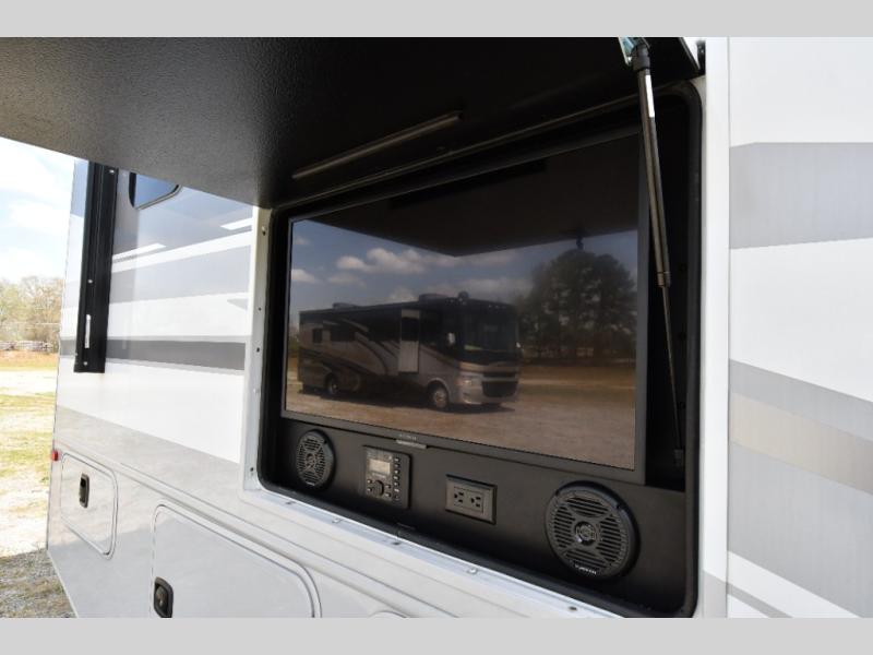 Inside, this motorhome blends residential comfort with smart travel functionality. The private rear bedroom features a spacious king bed slide, giving you a relaxing retreat after a full day on the road. Up front, the bunk over the cab provides extra sleeping space or convenient storage, while the jackknife sofa and booth dinette create additional seating and sleeping flexibility for family or guests. The fully equipped kitchen makes meal prep simple with a Furrion all-in-one cooktop and oven, a large 10 cu. ft. refrigerator, and generous counter space for preparing everything from quick breakfasts to full dinners. When it’s time to relax, extend the 20' electric awning and enjoy the outdoor entertainment center for movie nights or game day at the campsite.