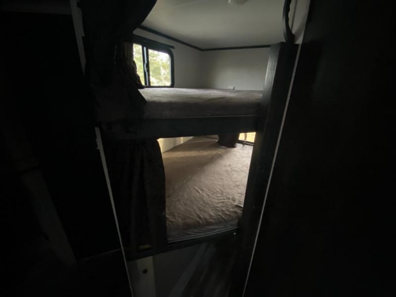 Pack up the family and head to your local state park in this cozy travel trailer for eight. The little ones will love the double-size bunks, and the full bath is close by for convenience. There is a Murphy bed up front that you can fold up each morning to relax on the sofa. If you have any other guests, they can sleep on the U-shaped dinette within the slide out. This model includes a three burner cooktop and a microwave oven, plus an outside kitchen to give the chef a choice where to cook. The 15' power awning will provide shade while the meal is being made, and there is exterior storage for your camp chairs.