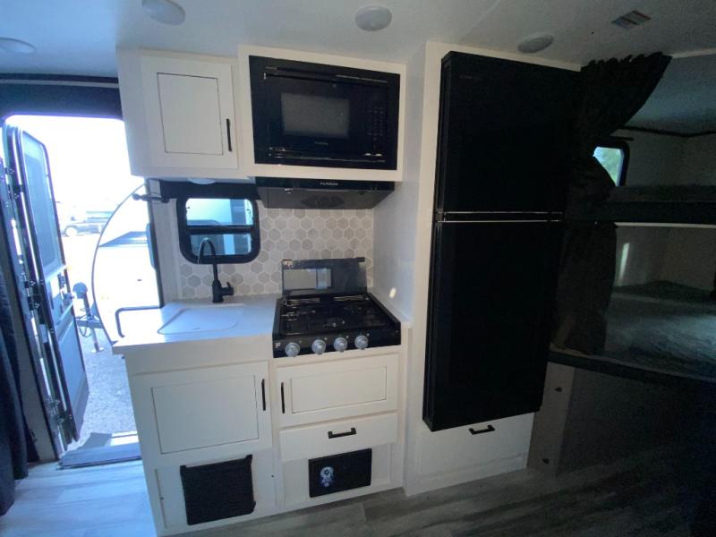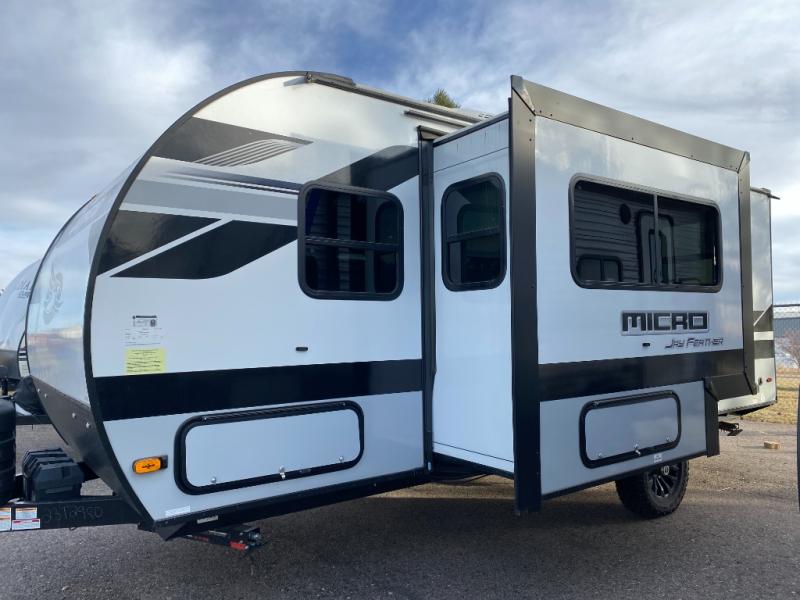 Jayco's lightest travel trailer, the Jay Feather Micro is ready for adventure at the drop of a hat! The Climate Shield weather protection will let you camp well into the colder months and the Stronghold VBL with double-sized Azdel is ultra durable. The Jay Pro Package includes 16-inch American-made Goodyear off-road tires with self-adjusting brakes, a rear-mounted roof ladder, and the Overlander 1 Solar Package with a 200W solar panel. Additional exterior features include marine grade exterior speakers with blue LED accent lighting, a swing-out entry door assist handle, a power tongue jack, and more! Inside, you will love the 4-inch high-density dinette cushions with vinyl backing for easy cleaning, along with the handcrafted hardwood door/drawer fronts, residential style kitchen countertops, and decorative roller shades with a reflective barrier for better insulation.