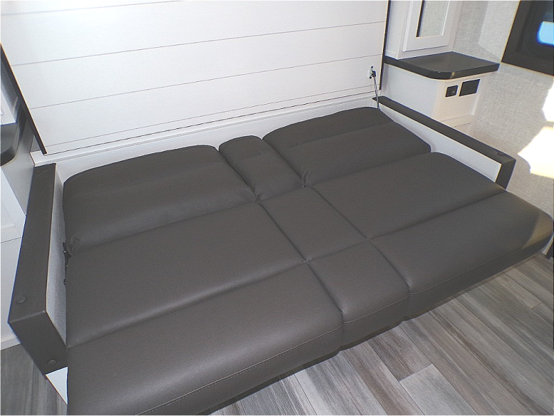 This travel trailer offers a lot of possibilities! During the day, relax in the spacious front living area with a jackknife sofa plus a pair of theater seats, both positioned for a great view of the entertainment center. A fully equipped kitchen with dual sinks, microwave, and three-burner range makes meals easy, and the theater seats have swing-out trays for you to dine. At night, pull down the 60" x 75" Murphy bed for a great night's sleep! wardrobes on either side of the bed provide plenty of storage for your clothing. The rear corner bath is convenient and private, and offers a linen closet plus a medicine cabinet for additional storage capability. Outside you will be sheltered from the sun beneath the 15' awning, and there is an exterior griddle for pancakes in the morning!