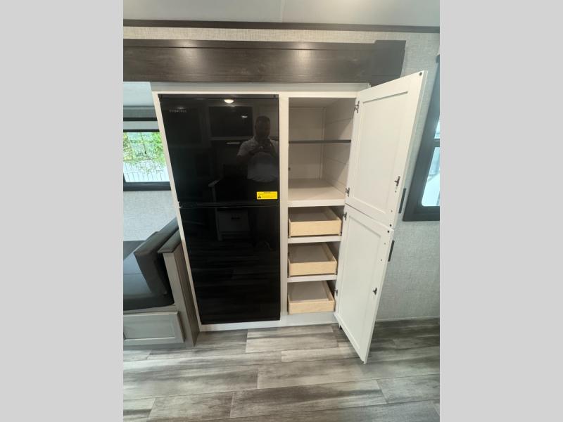 You will experience a smooth flow of traffic in and out of this travel trailer with dual entry doors! The front private bedroom has one of these entrances and a 60" x 80" queen bed with wardrobes on either side to keep your clothes looking nice. The full bathroom has a shower for you to freshen up in each morning and a linen closet to keep your towels close. You will appreciate all of the countertop space to prepare your meal and cook it on the three burner cooktop then enjoy it at the booth dinette. If there happen to be any leftovers then you can store them inside the 10 cu. ft. 12V refrigerator. The rear theater seating comes with trays to set your bowl of popcorn or you can choose to switch it out for the optional tri-fold sofa so an extra guest could stay the night.
