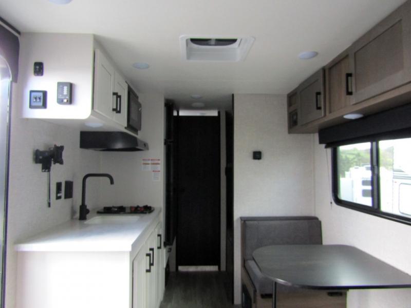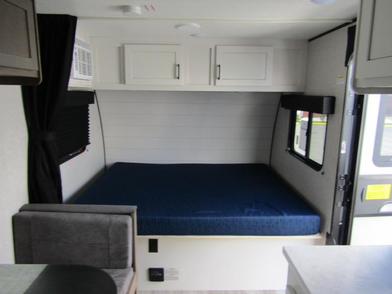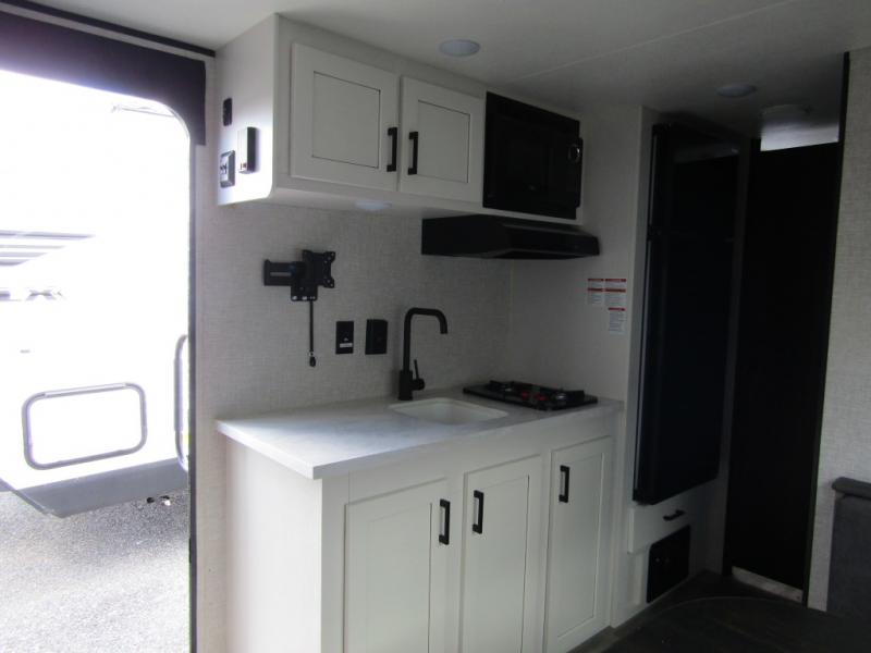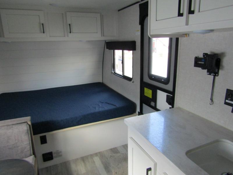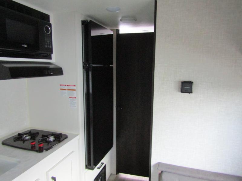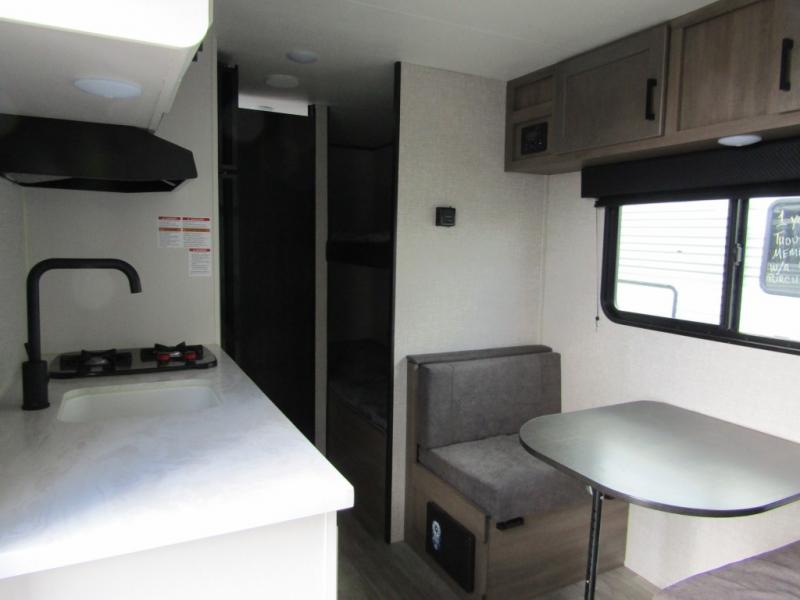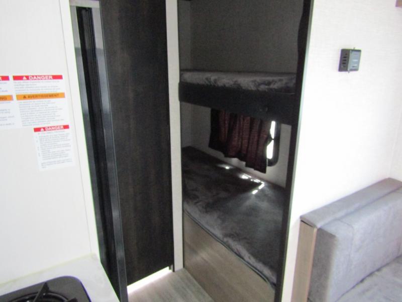 This Jay Flight SLX travel trailer offers you a queen-size bed for sleeping at night, and there is even a privacy curtain that you can draw to separate the bed from the rest of the trailer too. The 29" x 75" bunk beds are another sleeping location, and you can even create a bed for one more person by transforming the booth dinette. Overhead cabinets will help you keep your belongings organized, and the kitchen has a two-burner range, 8 cu.ft. 12V refrigerator, microwave oven, and a high-rise faucet at the sink to help you prepare meals.