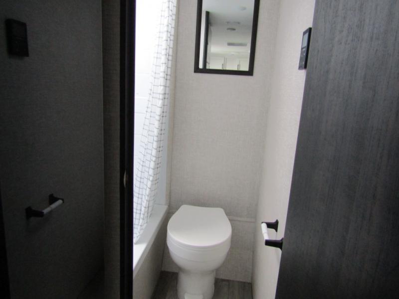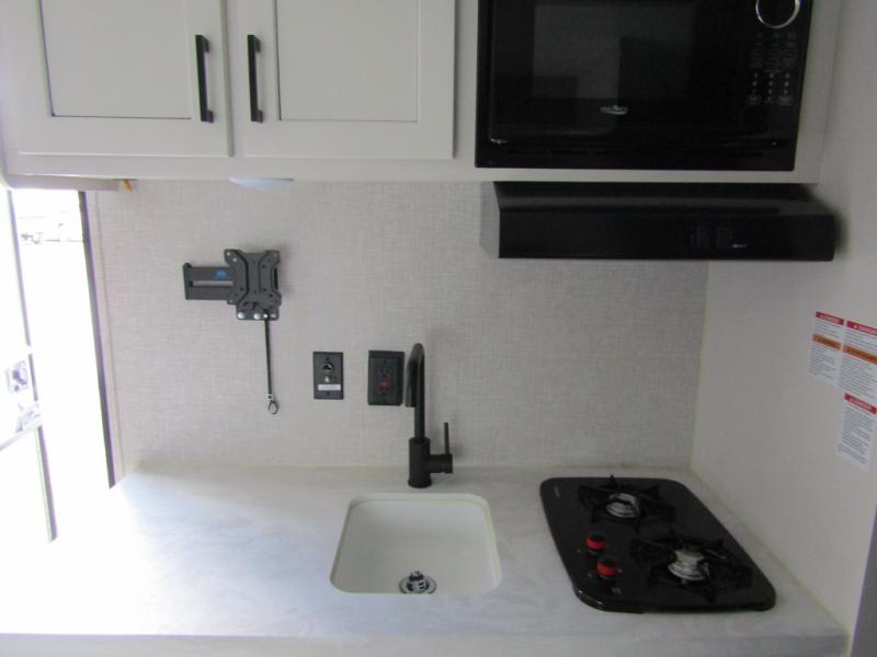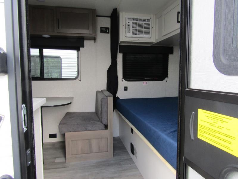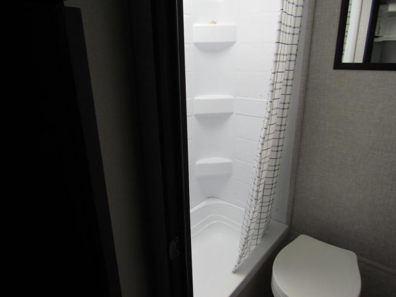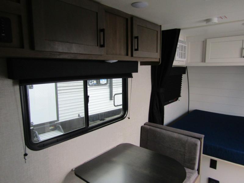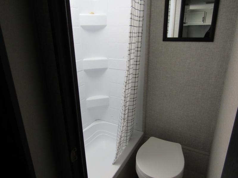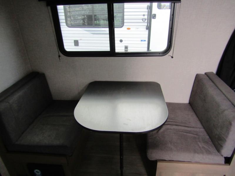 This Jay Flight SLX travel trailer offers you a queen-size bed for sleeping at night, and there is even a privacy curtain that you can draw to separate the bed from the rest of the trailer too. The 29" x 75" bunk beds are another sleeping location, and you can even create a bed for one more person by transforming the booth dinette. Overhead cabinets will help you keep your belongings organized, and the kitchen has a two-burner range, 8 cu.ft. 12V refrigerator, microwave oven, and a high-rise faucet at the sink to help you prepare meals.