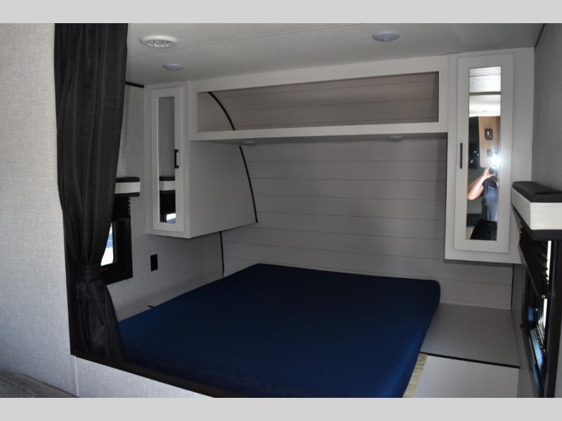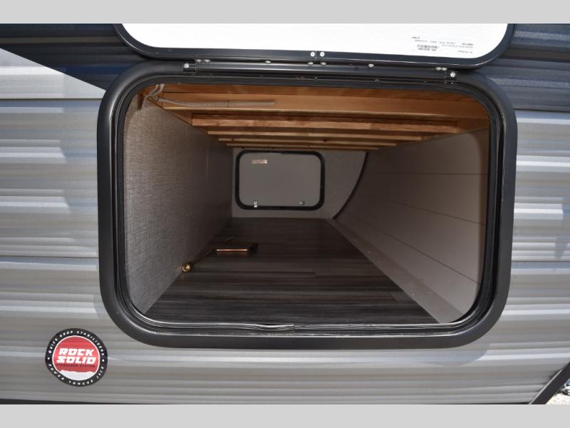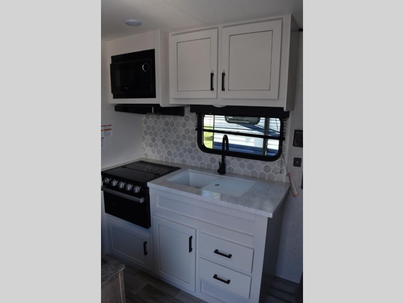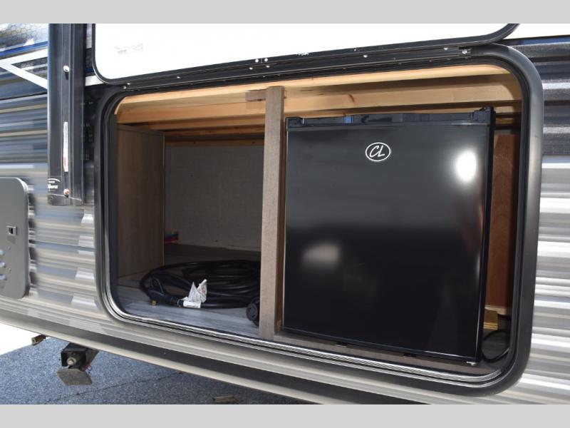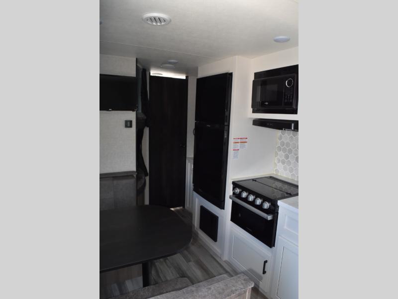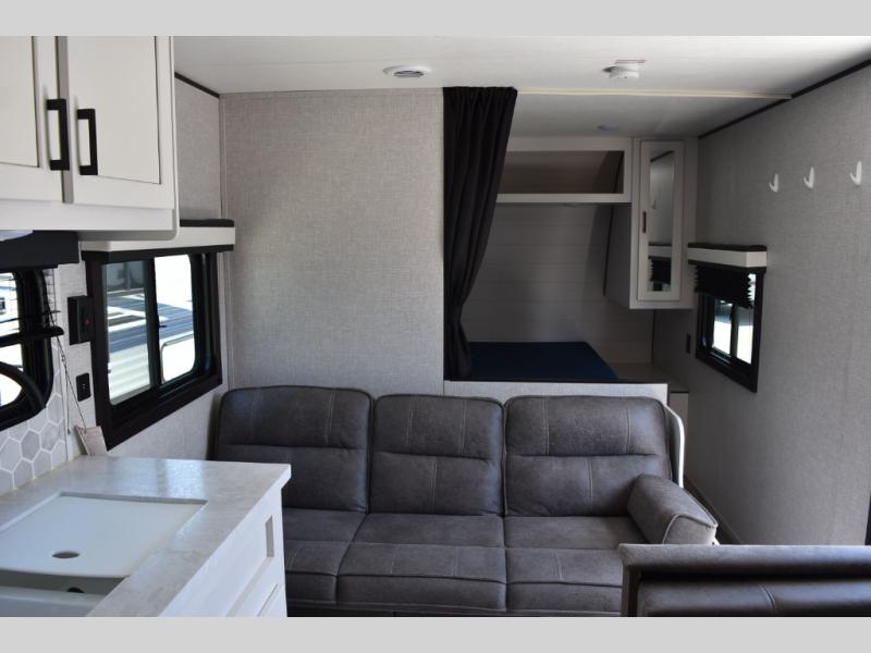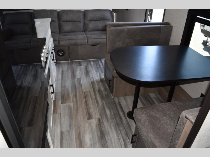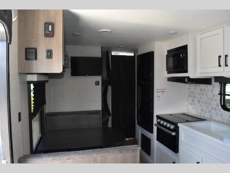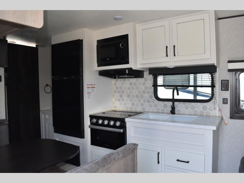 This easy to setup trailer offers a semi-private bedroom up front with a queen bed, semi-private double size bunks in the rear thanks to the curtains, and a private toilet and tub/shower room. The bathroom sink is just outside the door allowing two people to get ready for bed at once. The galley kitchen offers full amenities, and two can dine at the booth dinette and some can relax on the jackknife sofa. Both furnishings offer extra sleeping space. And you might like to add the Chil N' Stor option which adds a fridge and counter space along the exterior to serve meals outside and store extra beverages.
