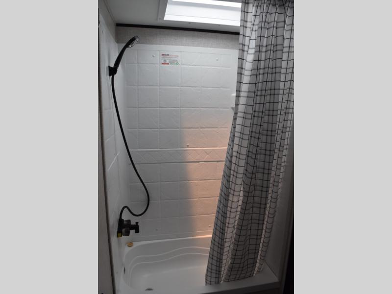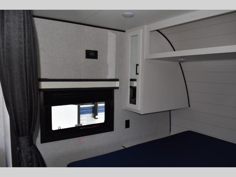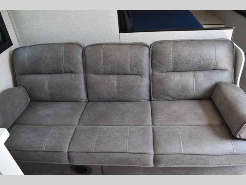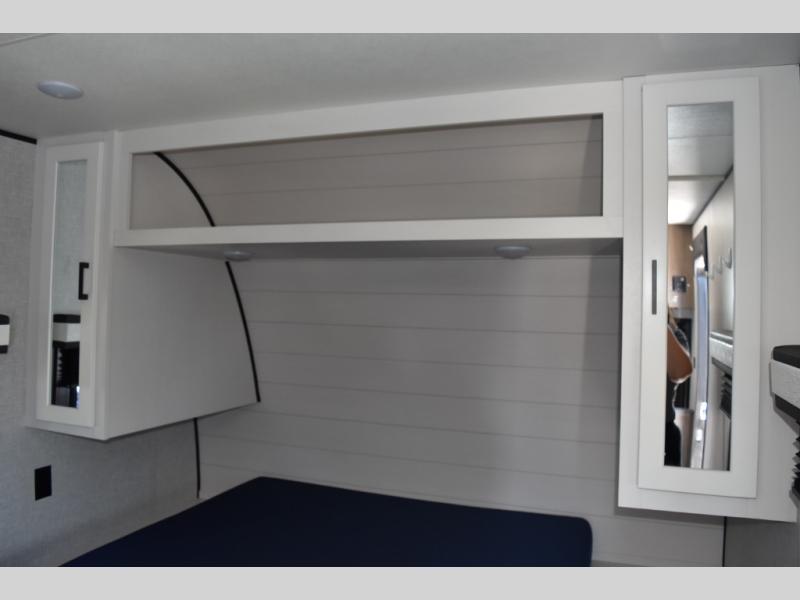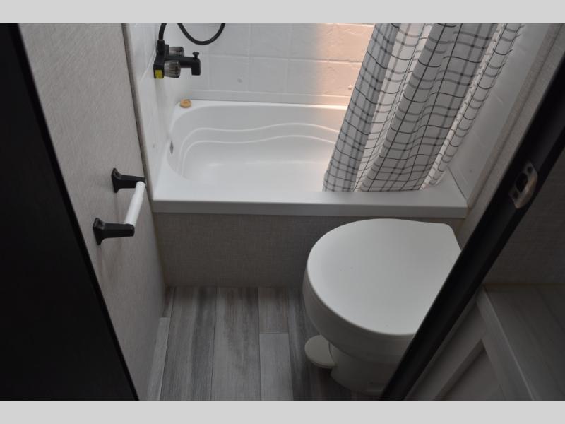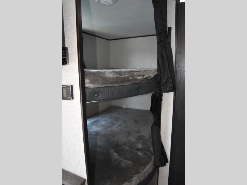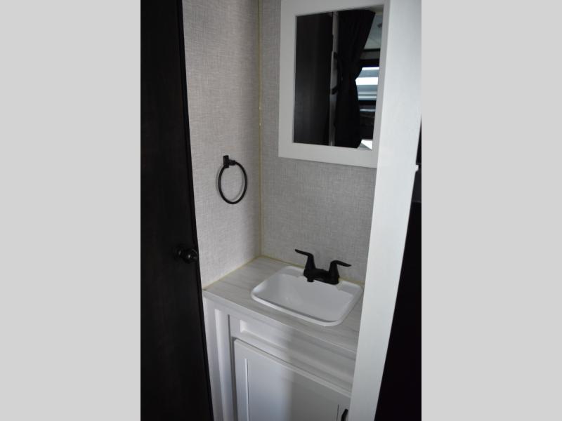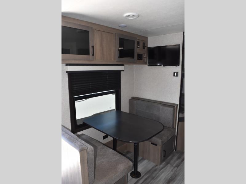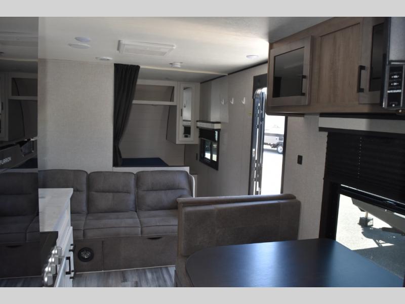 This easy to setup trailer offers a semi-private bedroom up front with a queen bed, semi-private double size bunks in the rear thanks to the curtains, and a private toilet and tub/shower room. The bathroom sink is just outside the door allowing two people to get ready for bed at once. The galley kitchen offers full amenities, and two can dine at the booth dinette and some can relax on the jackknife sofa. Both furnishings offer extra sleeping space. And you might like to add the Chil N' Stor option which adds a fridge and counter space along the exterior to serve meals outside and store extra beverages.
