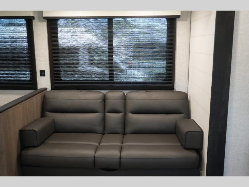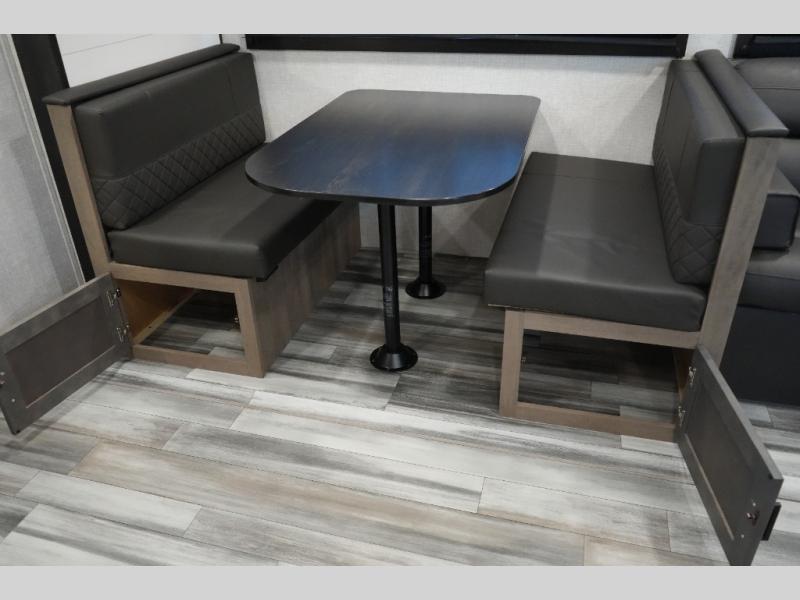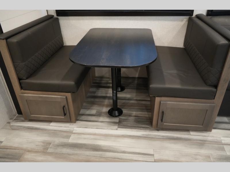 Roomy Living Area: A large U-shaped dinette and jackknife sofa create the perfect space to relax, dine, or host game nights on the road.