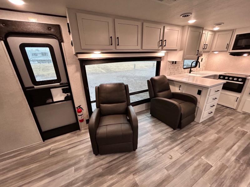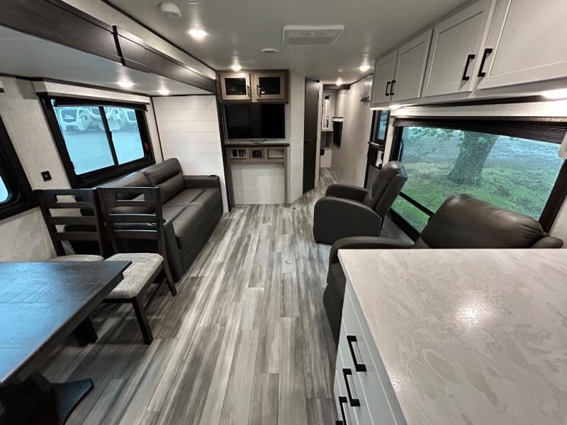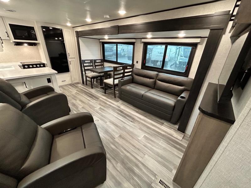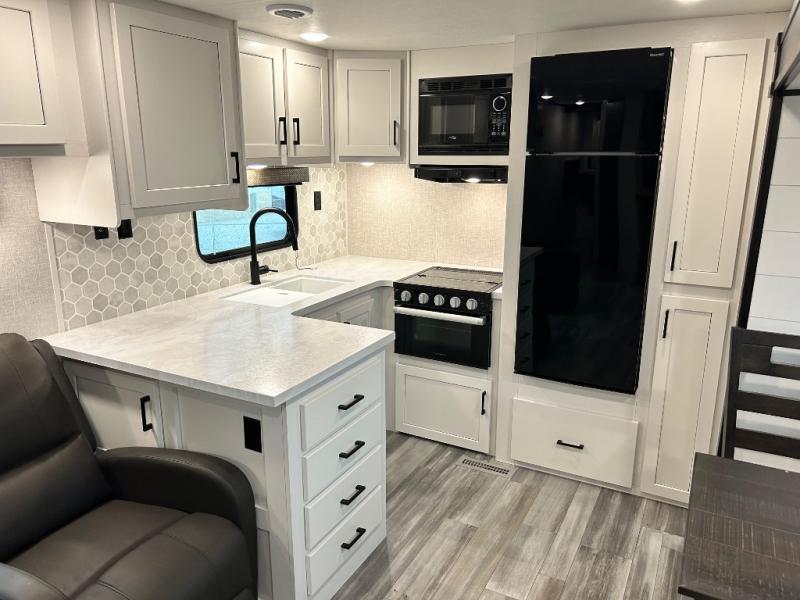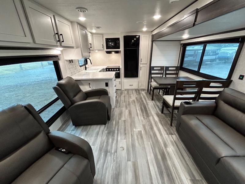 Enjoy all of your camping trips with this Jay Flight in tow! You will find ample seating throughout with dual recliners in the living area opposite a jackknife sofa and booth dinette slide. Not only can you easily entertain company, but the jack-knife sofa and dinette will also allow you to sleep added family or friends. The rear kitchen layout has everything you need to prepare your favorite home classics or camp favorites with a range top plus oven, and microwave as well. The U-shaped counter provides added prep space and you will also find plenty of storage in the overhead cabinets and storage drawers and cupboards below. A dual entry bath makes it easy to access from the hall or from the private bedroom where you will get a great night's rest after each full day of adventure!