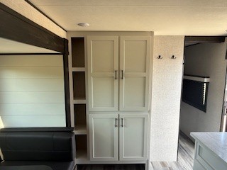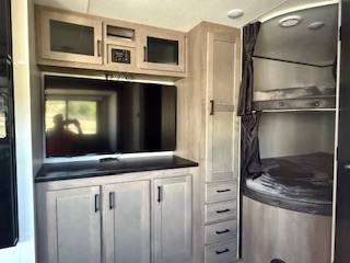 Loads of fun like hiking, fishing, and playing outdoor camping games are waiting for you to make that reservation, hitch up and head out! This trailer allows the owners to sleep in privacy behind the space saving sliding door on a 60" x 75" queen bed. And the kids or grandkids can sleep on the double size bunks in the rear next to the full bathroom including a tub/shower. They even have a wardrobe nearby for their things. The slide out jackknife sofa and U-shaped dinette offers more floor space, a place to relax and dine, plus you can play games at the dinette. The kitchen includes full amenities at your fingertips, plus you all can enjoy the entertainment center with TV when inside. When you want to be outdoors, relax under the 16' power awning after grabbing your camping chairs, and you can grab a beverage from the outside fridge!