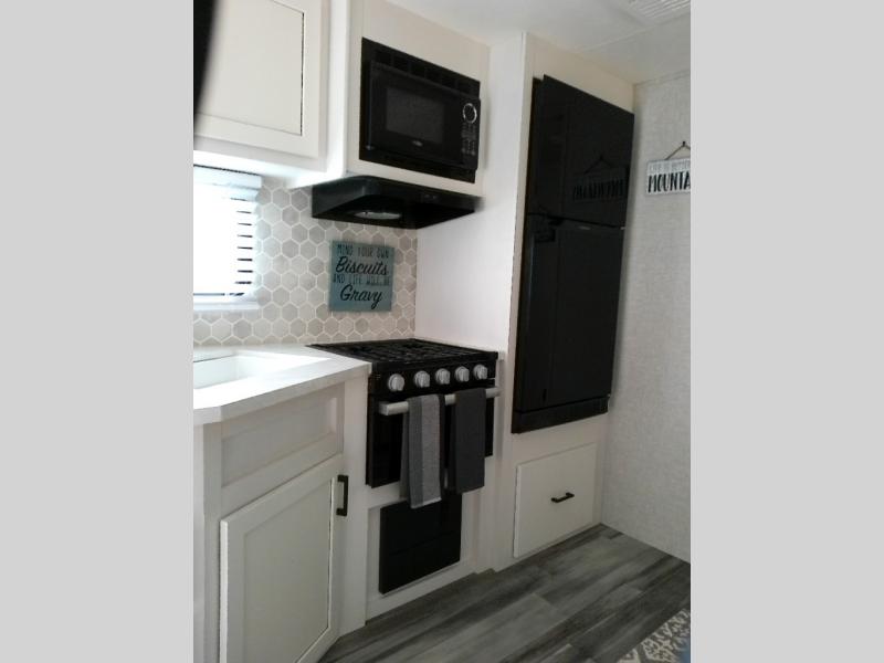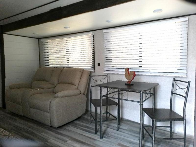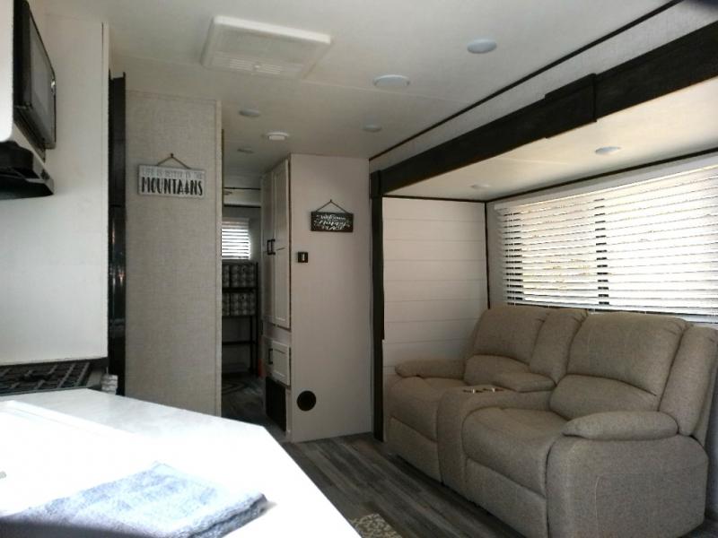 Spacious, accommodating, comfortable... start camping in this trailer that offers something for everyone! The popular bunkhouse room that has been converted and csn be used for a bedroom or office and a cargo door for easy access. The kitchen provides full amenities to make delicious home cooked meals. The Dining table and dual recliner slide give you more floor space to stretch out and provide extra floor room And the large pantry will hold all the goodies for the big group. The front bedroom gives privacy, dual wardrobes and an overhead shelf to place your clothing and things, plus a space saving door to close for privacy.