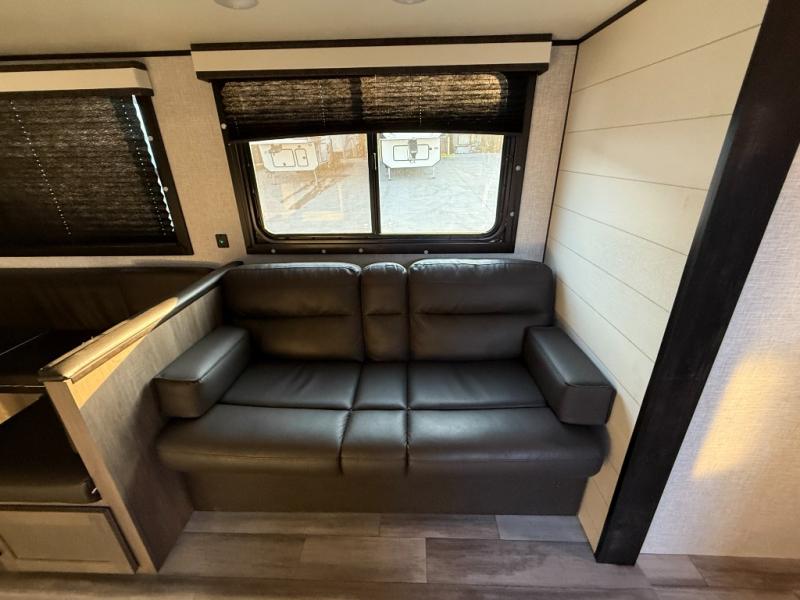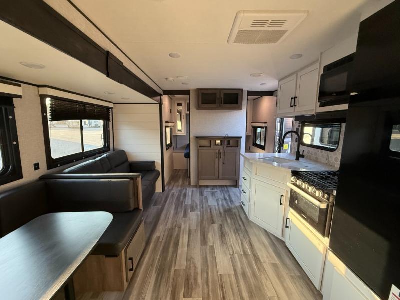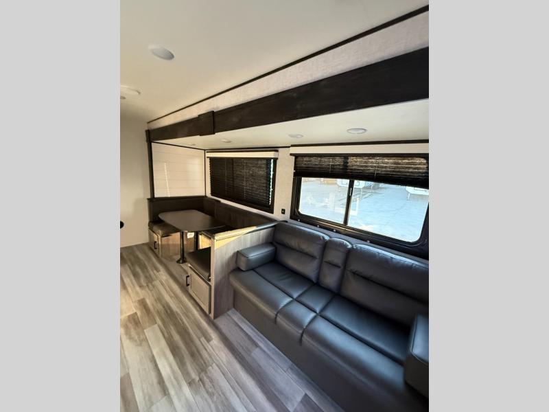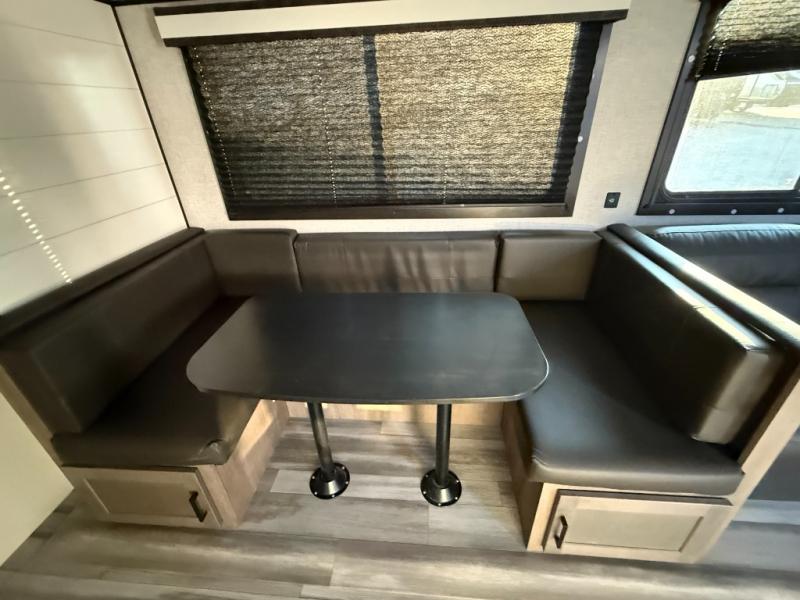Get ready for a whole lot of memories being made when you have this trailer at the campgrounds! From the kids telling stories at night while they sleep on the three bunks and the booth dinette in the rear bunkhouse to you relaxing on the jackknife sofa and U-shaped dinette. Both furnishings offer more sleeping space when the whole family joins you. And the slide out gives you more floor space! The full bathroom has an interior and exterior entry for convenience, and the inside kitchen offers full amenities while the outside kitchen gives you more choices when cooking for everyone. You will also appreciate privacy in the front bedroom with dual access, two wardrobes and windows for views of the scenery.