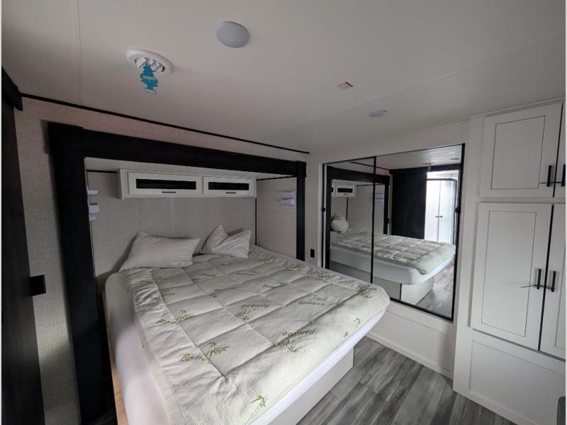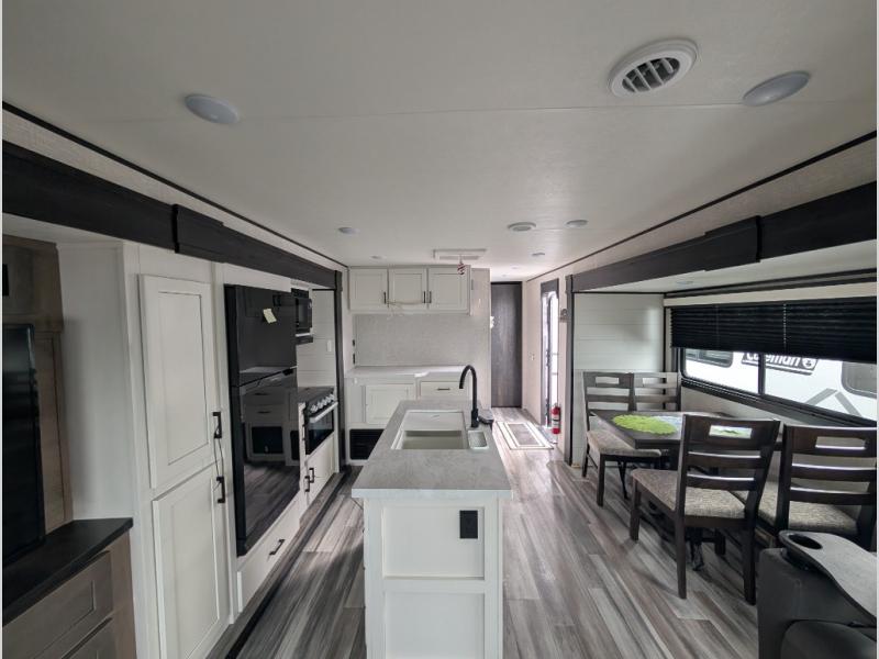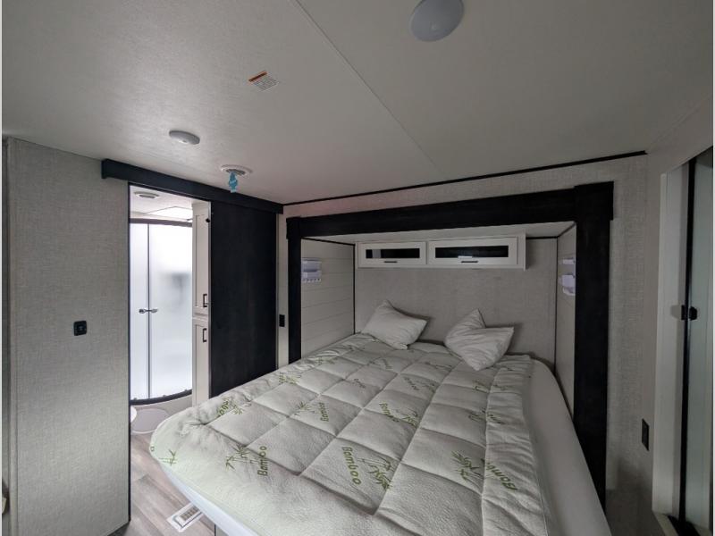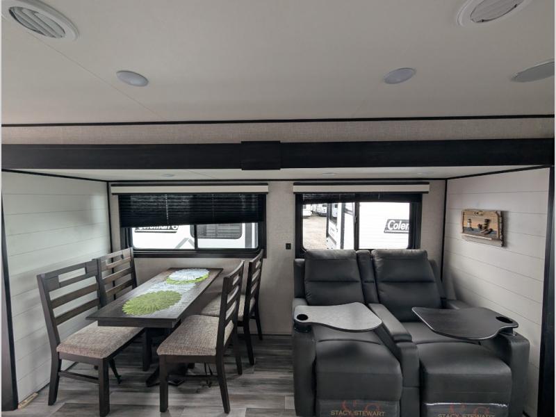 Enjoy a relaxing weekend getaway in this travel trailer! The dual entry bathroom with radius shower creates a front master suite with a queen bed slide, a dresser, and a front large wardrobe with storage space next to it that is prepped to add an optional washer and dryer. The chef will have an easy time preparing their best home cooked meals with the kitchen island, hutch, three burner cooktop, and 12V refrigerator. Enjoy your meals at the booth dinette then play a card game or transform it into an extra sleeping space. The rear living area has a rear jackknife sofa for a quick afternoon nap and theater seating across from the entertainment center with a fireplace for the perfect spot on movie night!