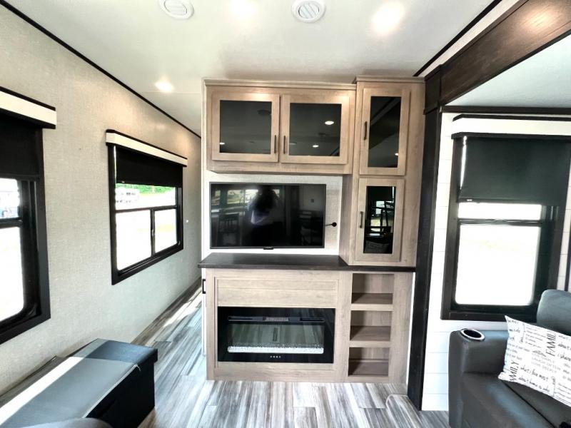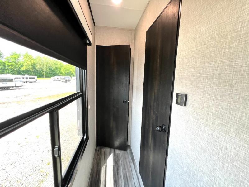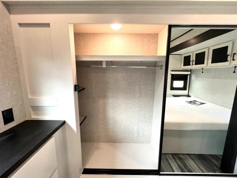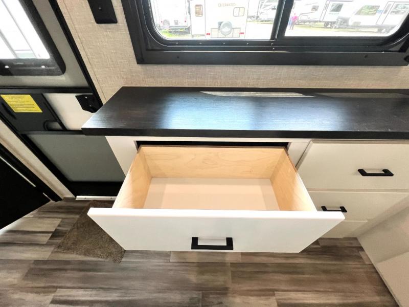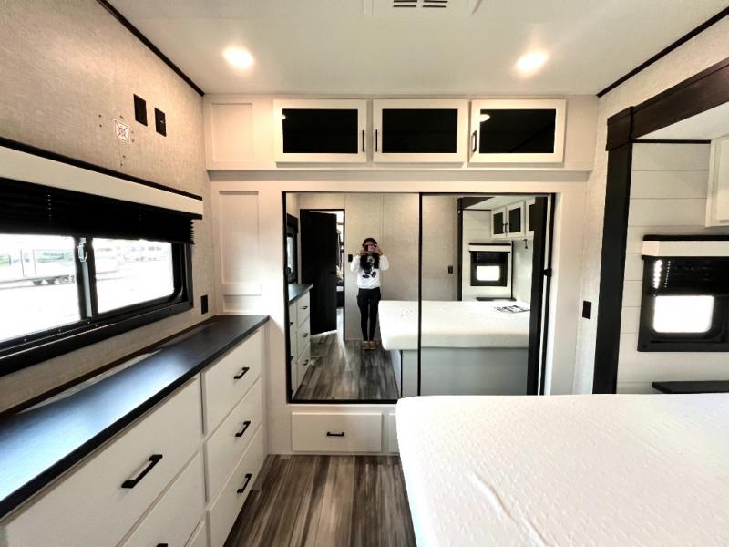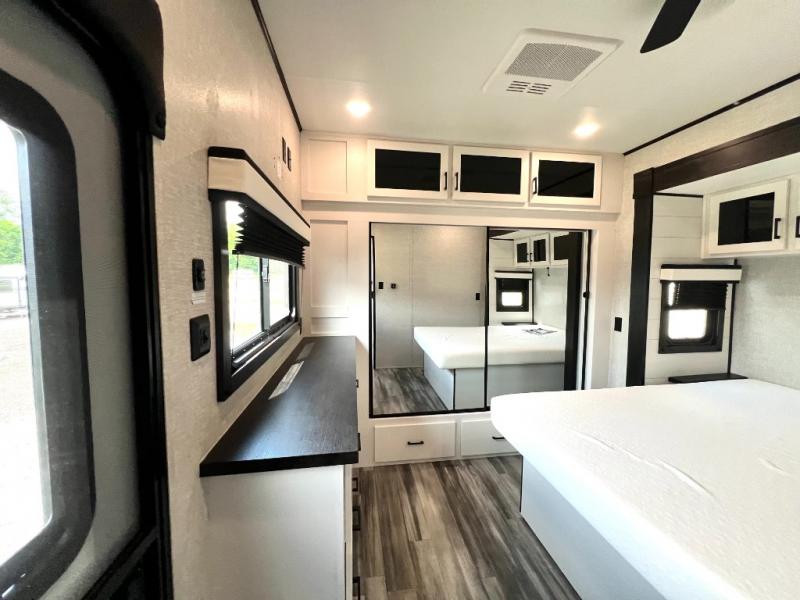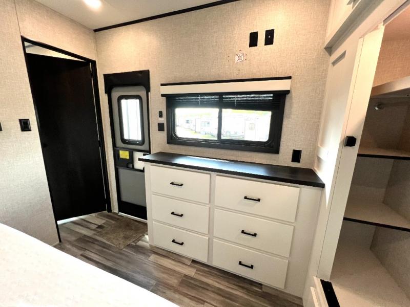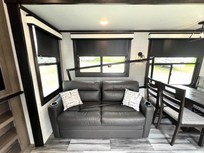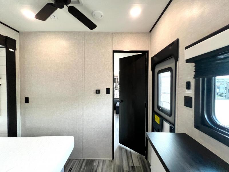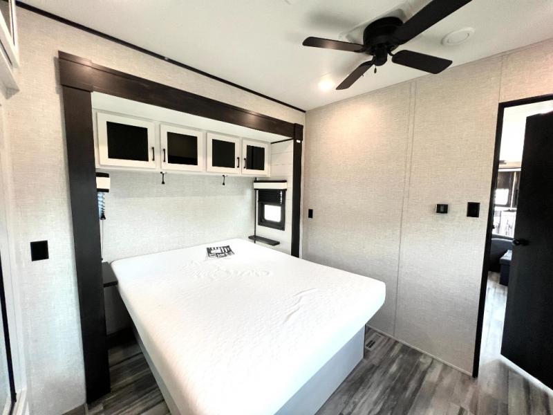 This dual entry travel trailer will allow you to enter in through the rear bedroom or the main living area for convenience. The front kitchen features ample counter space, plus a bar area with stools where you can enjoy your morning coffee at. A tri-fold sofa with an ottoman will provide additional seating and sleeping space, plus there is a lounge chair perfect for reading. This model includes a full bath with a shower skylight and a power vent, plus there is a space with washer and dryer prep if you plan to go full-time. And don't overlook the rear bedroom with its queen bed slide out, full-length rear wardrobe, and ceiling fan to keep the air moving.