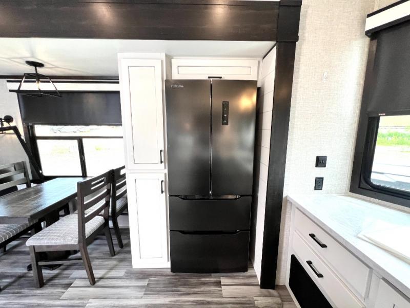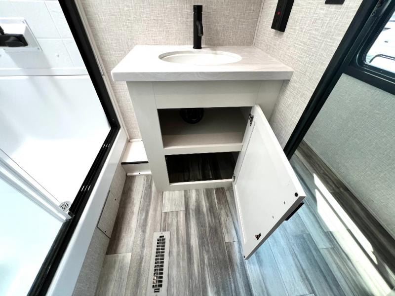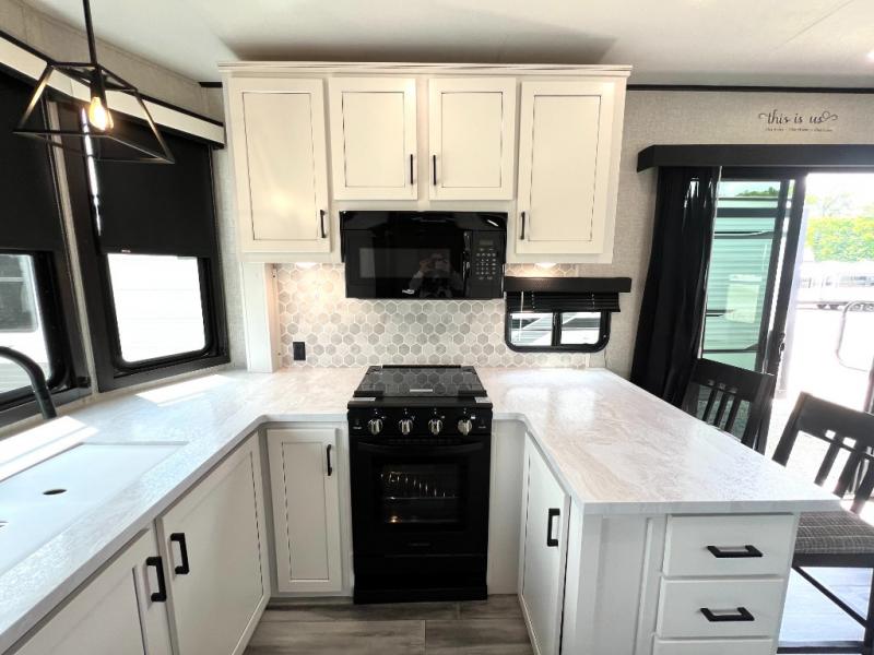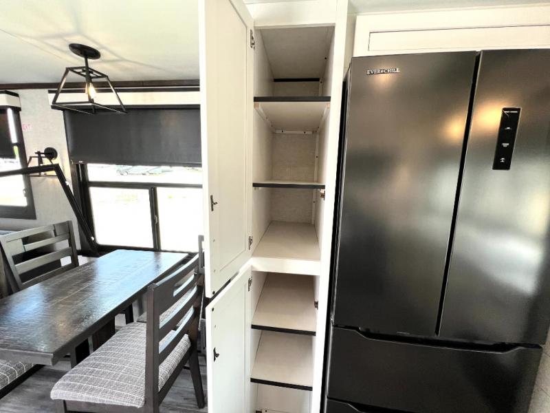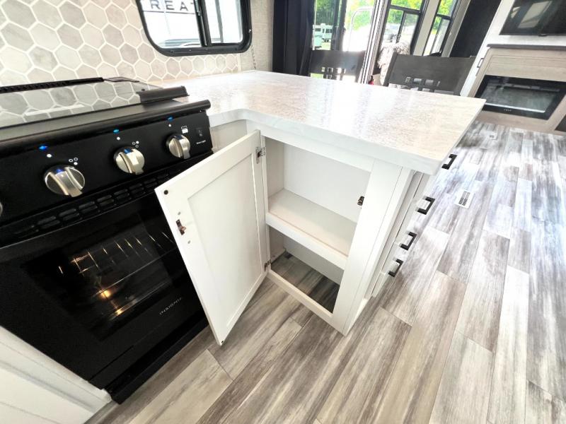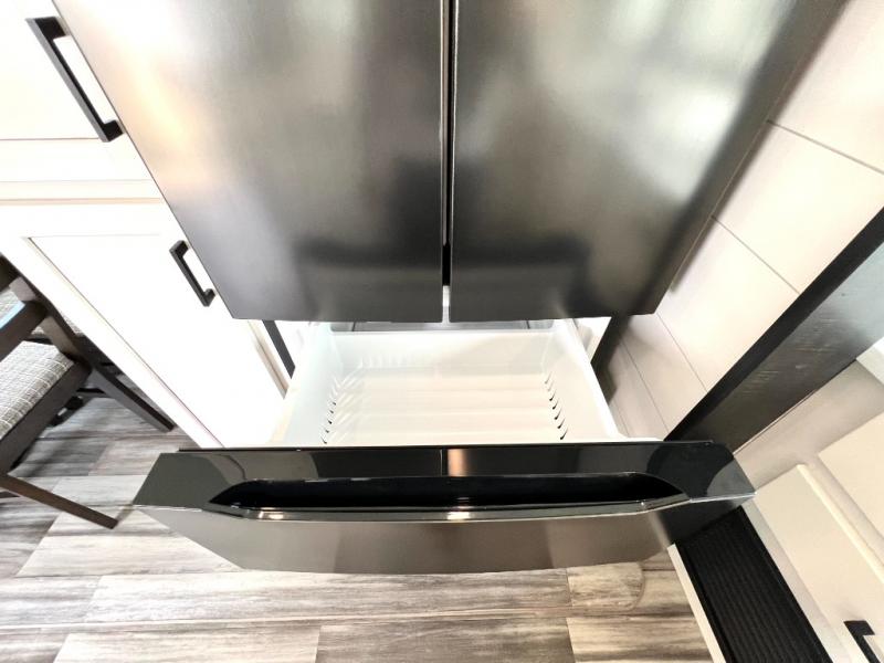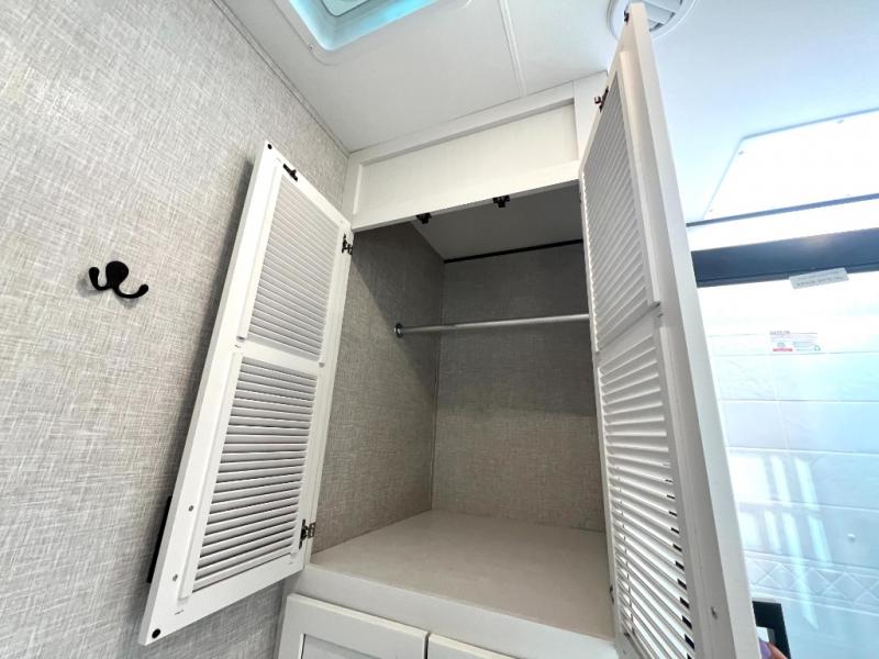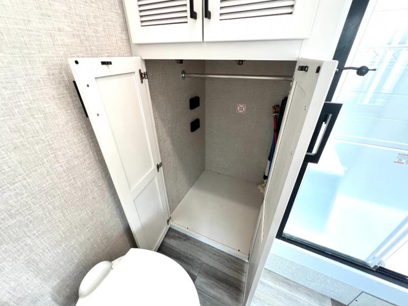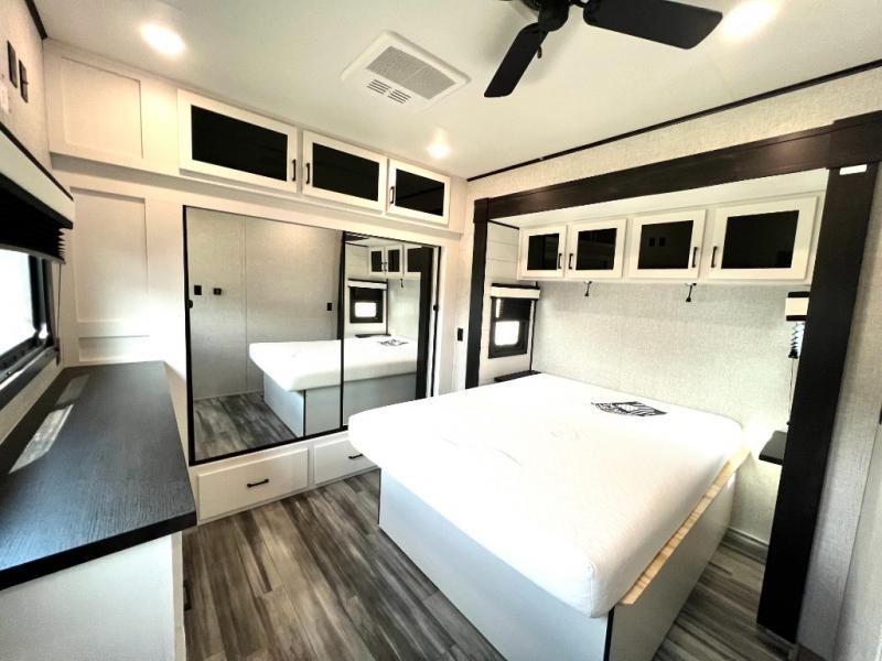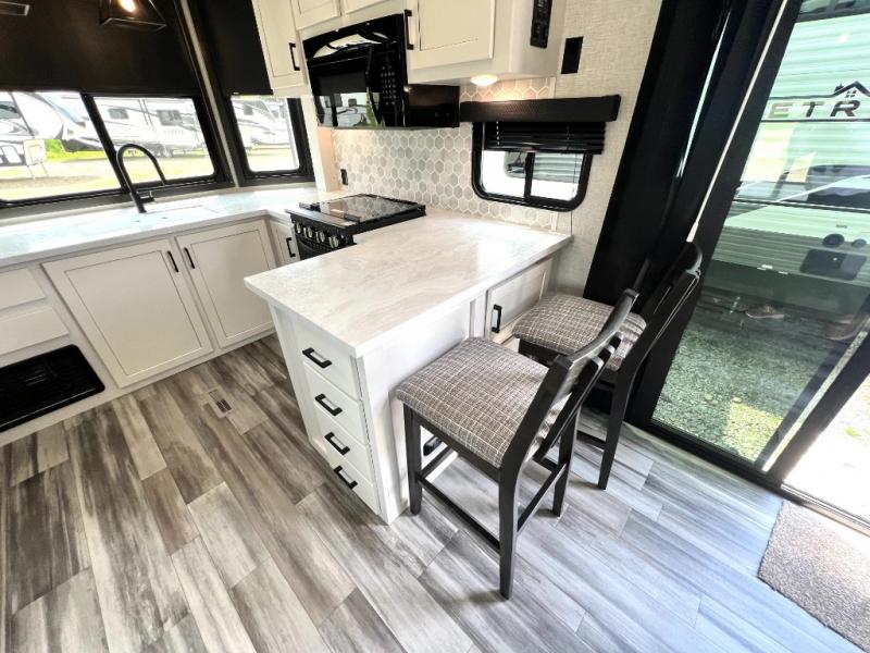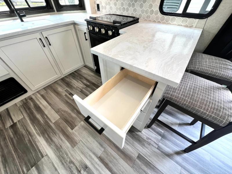 This dual entry travel trailer will allow you to enter in through the rear bedroom or the main living area for convenience. The front kitchen features ample counter space, plus a bar area with stools where you can enjoy your morning coffee at. A tri-fold sofa with an ottoman will provide additional seating and sleeping space, plus there is a lounge chair perfect for reading. This model includes a full bath with a shower skylight and a power vent, plus there is a space with washer and dryer prep if you plan to go full-time. And don't overlook the rear bedroom with its queen bed slide out, full-length rear wardrobe, and ceiling fan to keep the air moving.