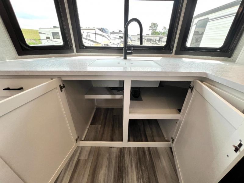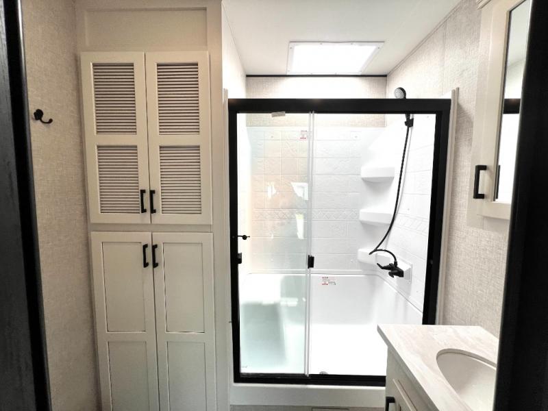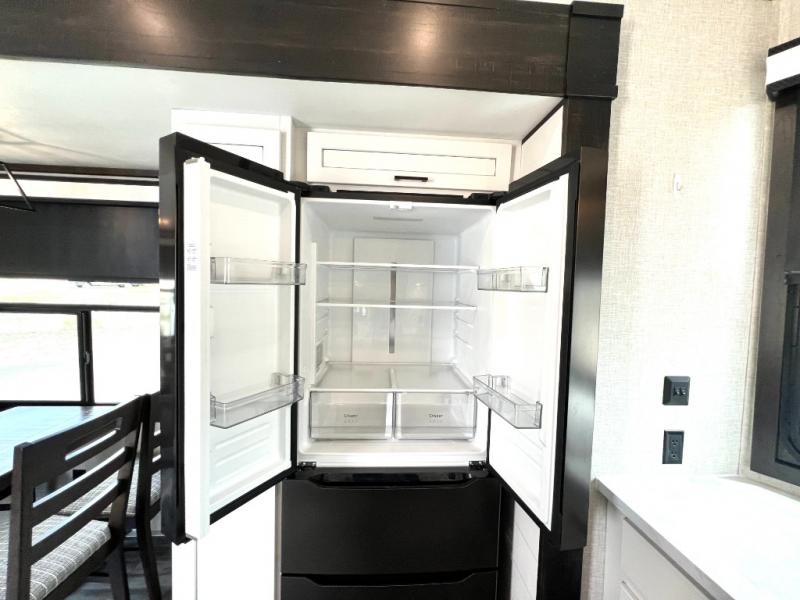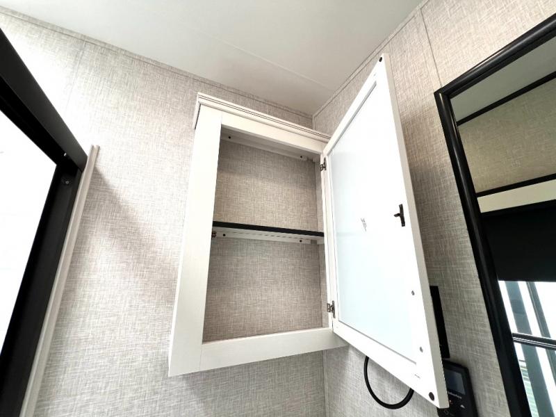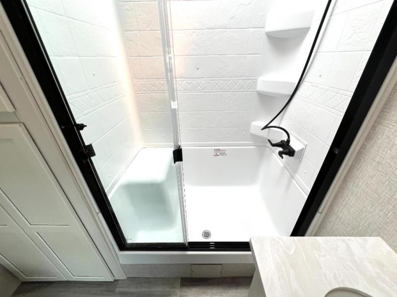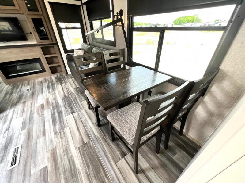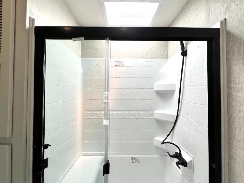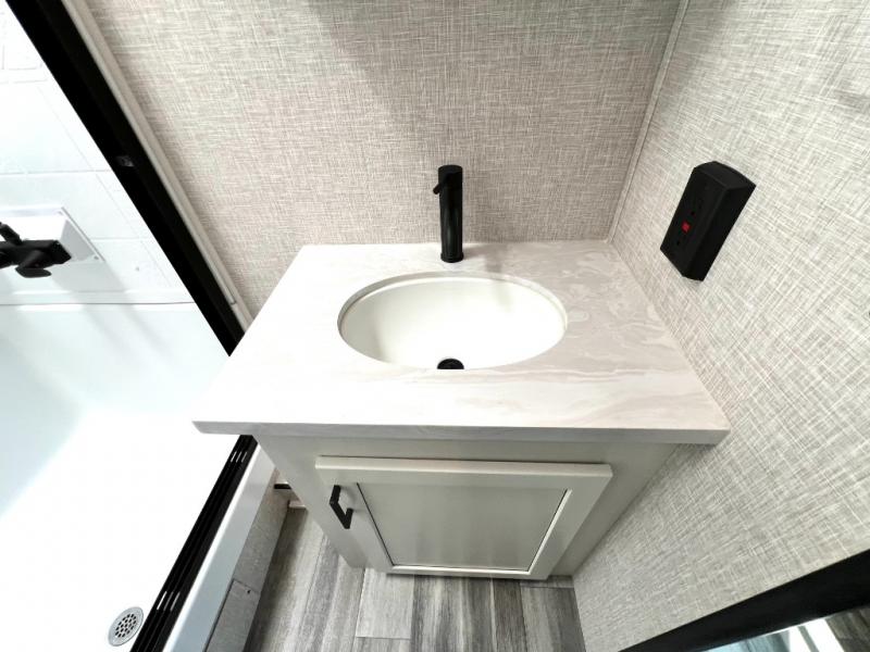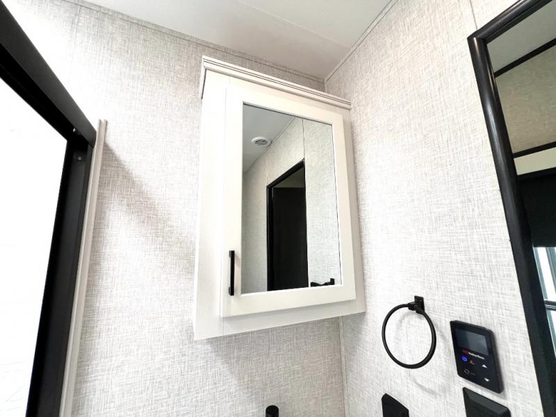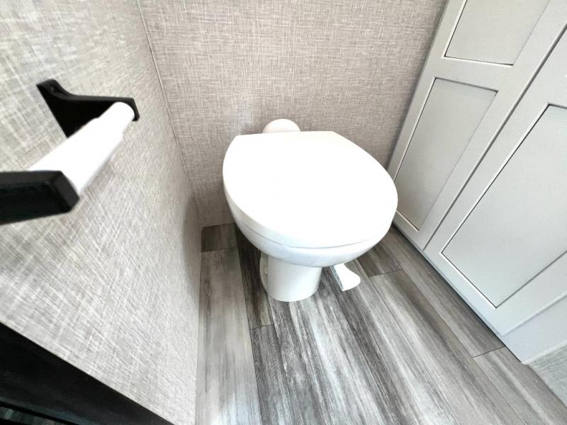 This dual entry travel trailer will allow you to enter in through the rear bedroom or the main living area for convenience. The front kitchen features ample counter space, plus a bar area with stools where you can enjoy your morning coffee at. A tri-fold sofa with an ottoman will provide additional seating and sleeping space, plus there is a lounge chair perfect for reading. This model includes a full bath with a shower skylight and a power vent, plus there is a space with washer and dryer prep if you plan to go full-time. And don't overlook the rear bedroom with its queen bed slide out, full-length rear wardrobe, and ceiling fan to keep the air moving.