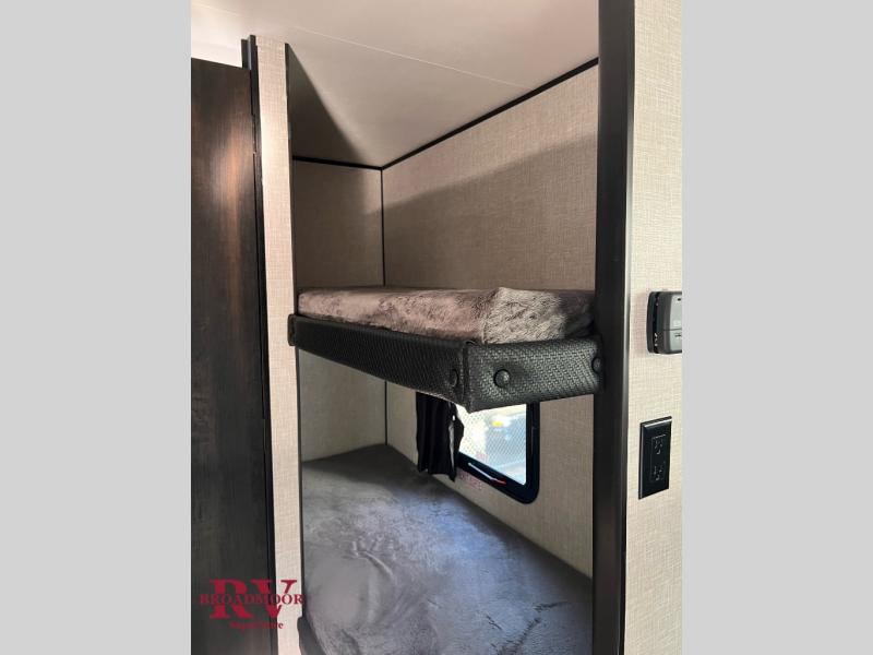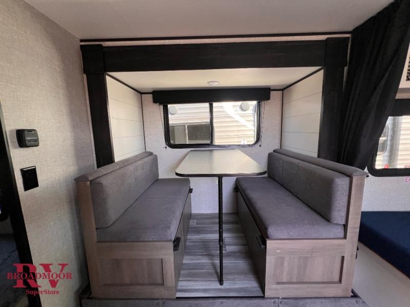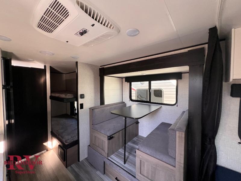 There is room to sleep up to six people in this Jay Flight SLX travel trailer with the 29" x 75" bunk beds, a booth dinette once converted, and on the queen bed. There is also added living space thanks to the single slide, and the private bathroom adds convenience for everyone with its tub/shower and toilet. The kitchen has all of the necessities for you to create delicious meals, like an 8 cu. ft. 12V refrigerator, microwave oven, and two-burner range, and you also have overhead cabinets to use for keeping your items organized.