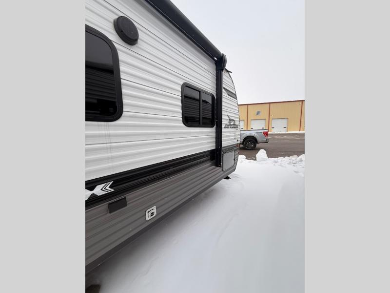 Gain some freedom to travel with this Jay Flight SLX travel trailer! You can rest comfortably each night on an RV queen bed that can be sectioned off into a semi-private bedroom with a privacy curtain. There is a private bathroom with a tub/shower and toilet so that you can stay clean, and the kitchen has a two-burner range and microwave oven for all of your inside cooking needs. Outside, there is a 13' power awning to protect you from too much sun, and you can also store extra gear in the exterior storage compartment which is quite handy.