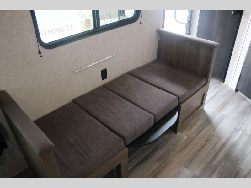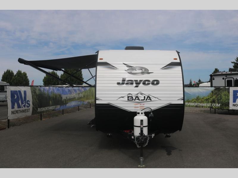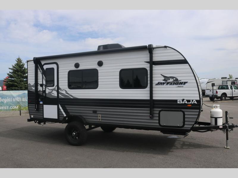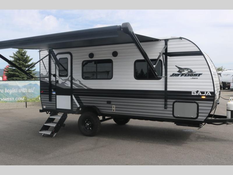 Gain some freedom to travel with this Jay Flight SLX travel trailer! You can rest comfortably each night on an RV queen bed that can be sectioned off into a semi-private bedroom with a privacy curtain. There is a private bathroom with a tub/shower and toilet so that you can stay clean, and the kitchen has a two-burner range and microwave oven for all of your inside cooking needs. Outside, there is a 13' power awning to protect you from too much sun, and you can also store extra gear in the exterior storage compartment which is quite handy.