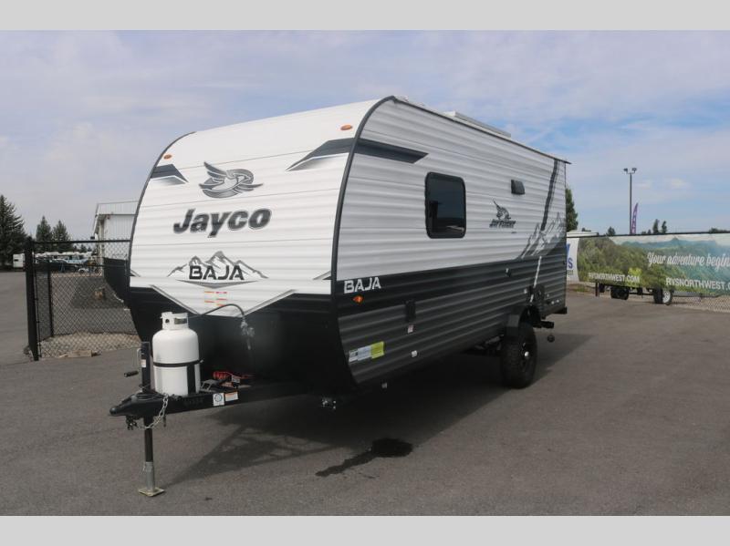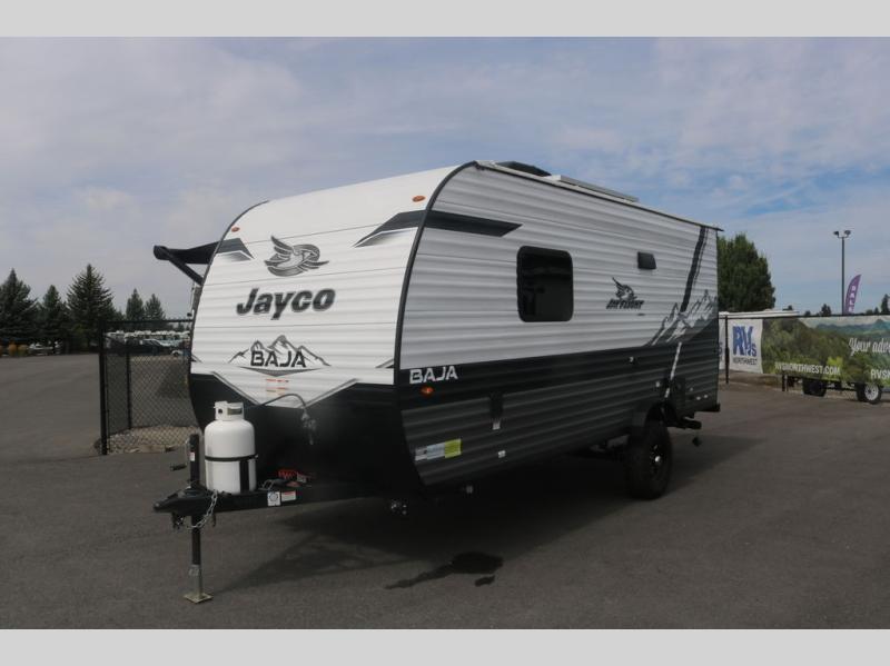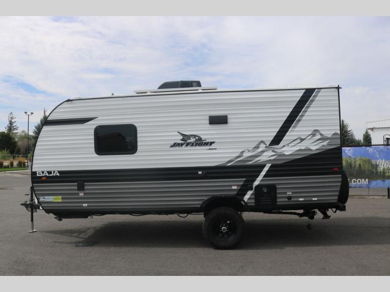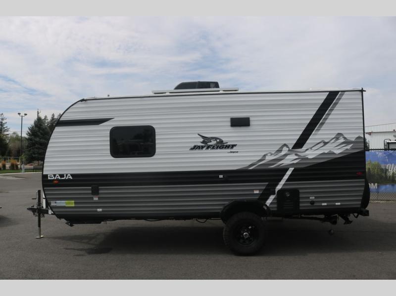 The Jayco Jay Flight SLX travel trailer is quite easy to own because it is lightweight, and it comes with a single axle. Built on a fully integrated A-frame with galvanized-steel, impact-resistant wheel wells, the Jay Flight SLX has quality at its very foundation. That quality continues on to the electric self-adjusting brakes, easy-lube hubs, Magnum Truss roof system, and LP quick connect. Some of what the mandatory Customer Value Package includes backup camera prep, Keyed-Alike entry and baggage doors, marine grade exterior speakers, and an on-demand tankless water heater. The optional STX Edition for Indiana built units only and the optional Baja Package built for Idaho units only includes Goodyear off-road tires, an enclosed underbelly, a deluxe graphics package, and a wide-stance axle to name a few features.