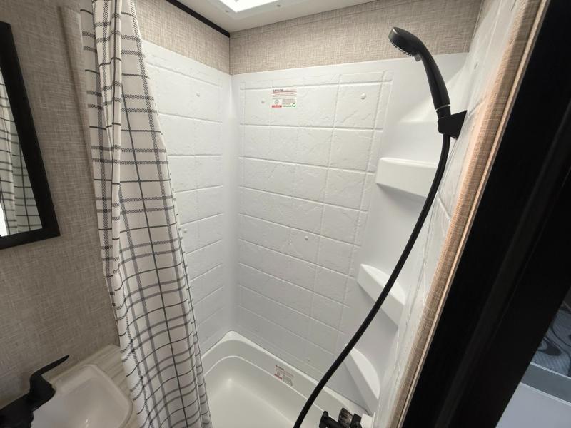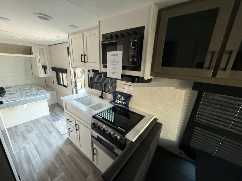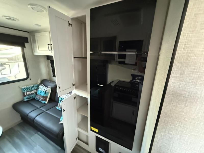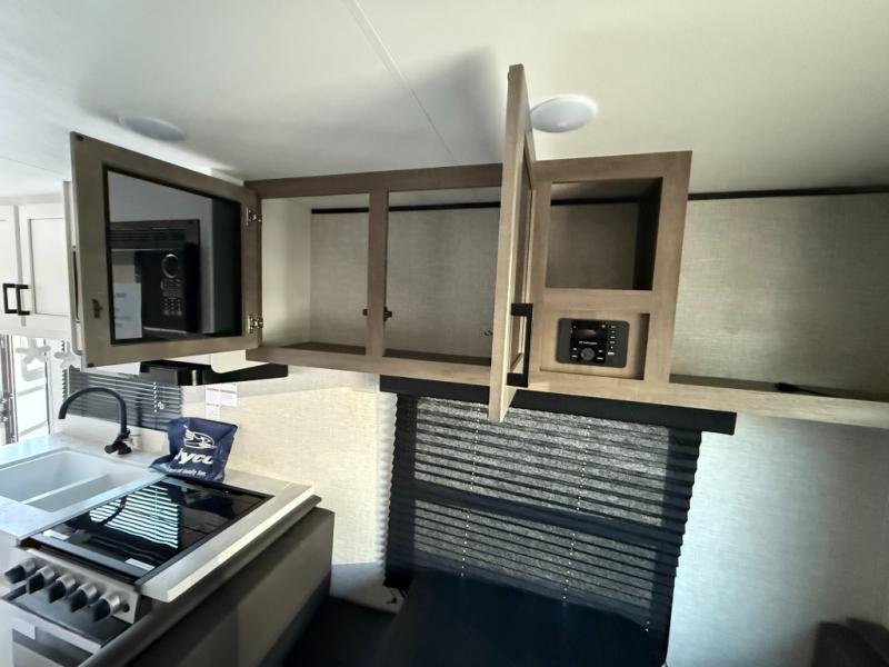 Camping in the woods is just what the doctor ordered and this trailer will provide all the interior comforts you need! There is a three burner cooktop and a microwave oven to prepare meals each day, plus an 8 cu. ft. 12V refrigerator for cold items. After your meal is made, you can dine at the booth dinette or relax on the jack-knife sofa, and these areas can become sleeping space for two to three guests at night. The full bath with a tub/shower means you won't have to use the camp's facilities and the 16' power awning will provide protection from the sun as you visit with other campers!