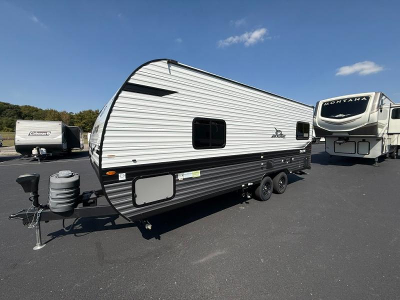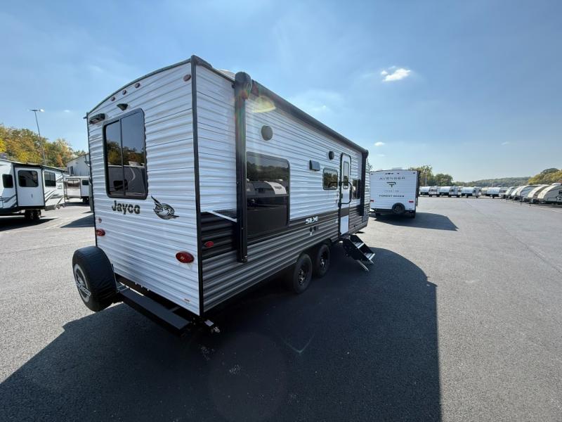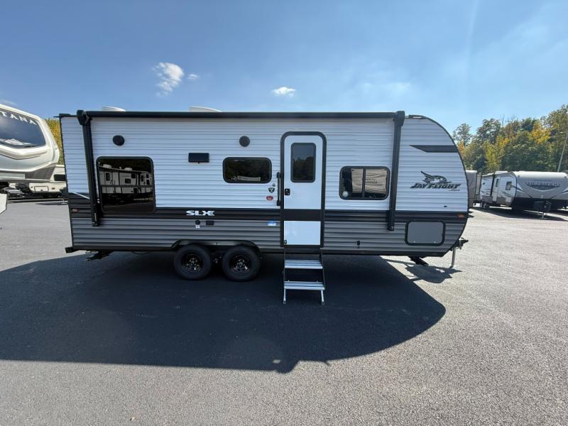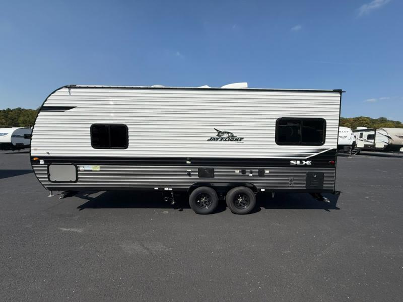 The Jayco Jay Flight SLX travel trailer is quite easy to own because it is lightweight for an easier towing experience. Built on a fully integrated A-frame with galvanized-steel, impact-resistant wheel wells, the Jay Flight SLX has quality at its very foundation. That quality continues on to the electric self-adjusting brakes, easy-lube hubs, Magnum Truss roof system, and LP quick connect. Some of what the mandatory Customer Value Package includes backup camera prep, Keyed-Alike entry and baggage doors, marine grade exterior speakers, and an on-demand tankless water heater. The optional STX Edition for Indiana built units only and the optional Baja Package built for Idaho units only includes Goodyear off-road tires, an enclosed underbelly, a deluxe graphics package, and a wide-stance axle to name a few features.