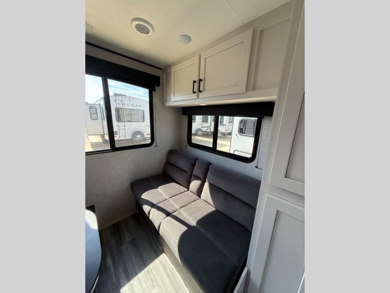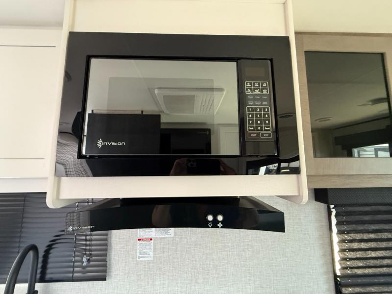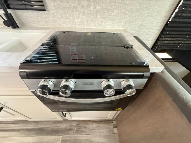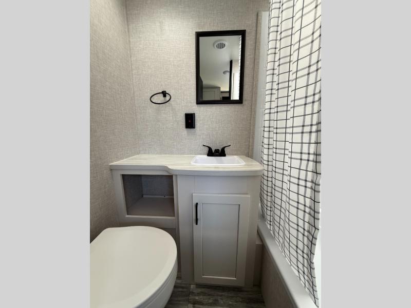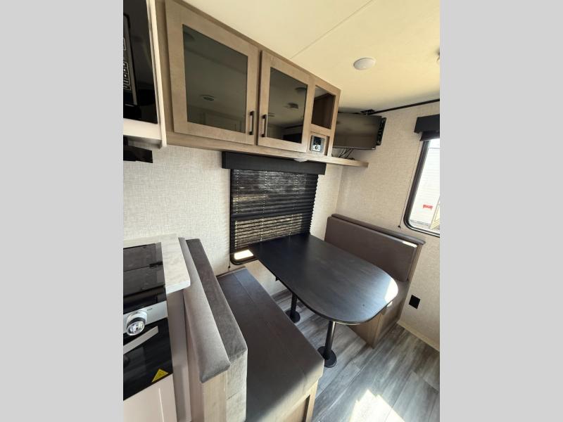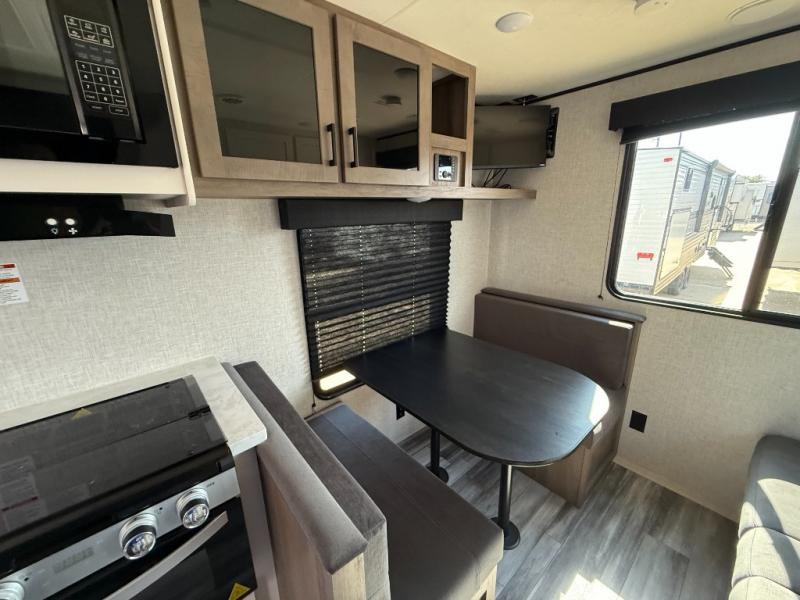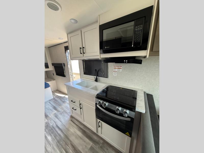 Camping in the woods is just what the doctor ordered and this trailer will provide all the interior comforts you need! There is a three burner cooktop and a microwave oven to prepare meals each day, plus an 8 cu. ft. 12V refrigerator for cold items. After your meal is made, you can dine at the booth dinette or relax on the jack-knife sofa, and these areas can become sleeping space for two to three guests at night. The full bath with a tub/shower means you won't have to use the camp's facilities and the 16' power awning will provide protection from the sun as you visit with other campers!
