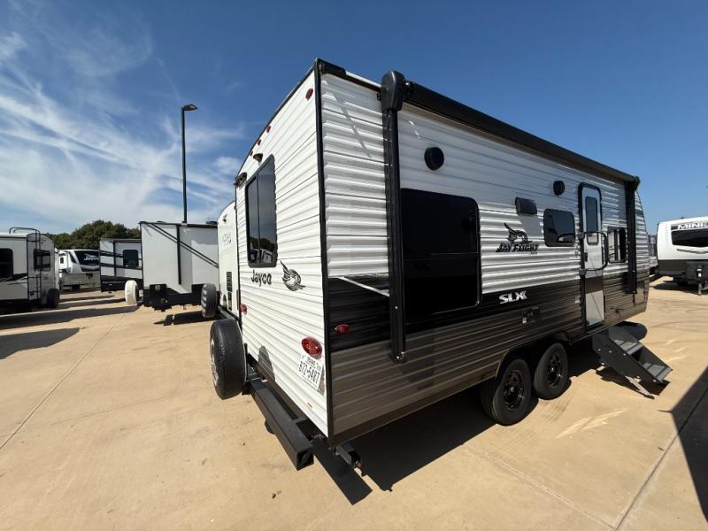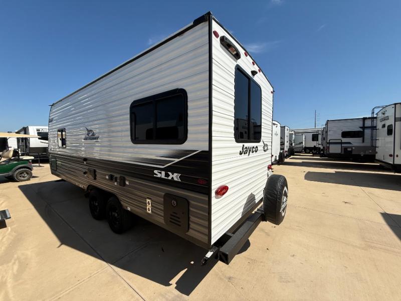 The Jayco Jay Flight SLX travel trailer is quite easy to own because it is lightweight for an easier towing experience. Built on a fully integrated A-frame with galvanized-steel, impact-resistant wheel wells, the Jay Flight SLX has quality at its very foundation. That quality continues on to the electric self-adjusting brakes, easy-lube hubs, Magnum Truss roof system, and LP quick connect. Some of what the mandatory Customer Value Package includes backup camera prep, Keyed-Alike entry and baggage doors, marine grade exterior speakers, and an on-demand tankless water heater. The optional STX Edition for Indiana built units only and the optional Baja Package built for Idaho units only includes Goodyear off-road tires, an enclosed underbelly, a deluxe graphics package, and a wide-stance axle to name a few features.