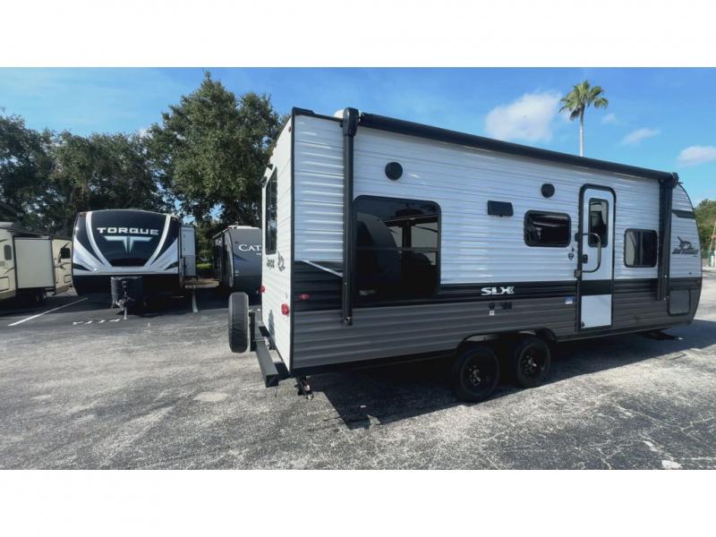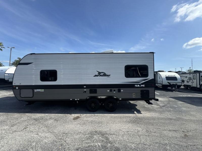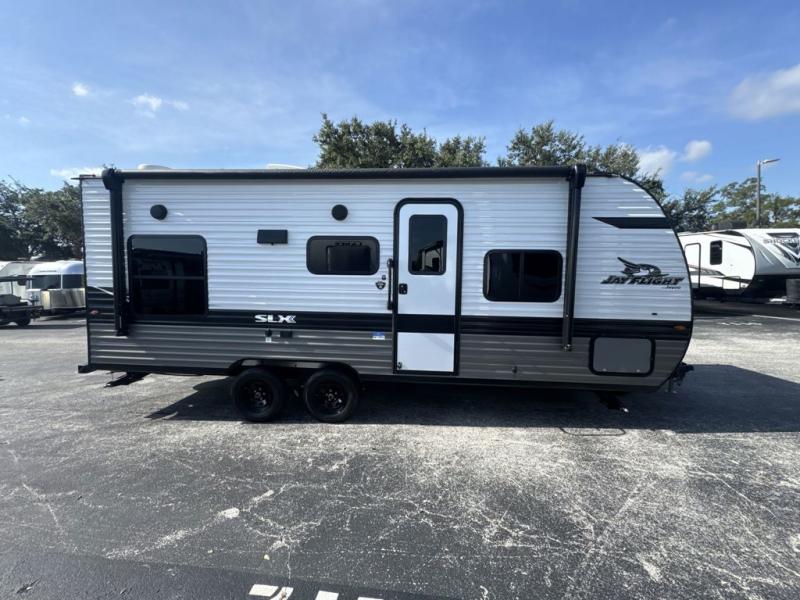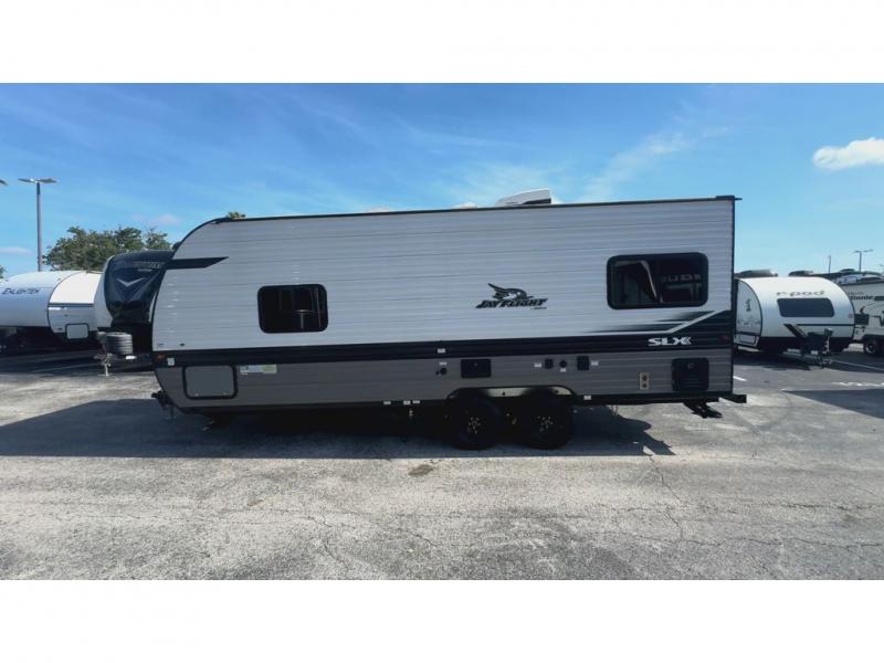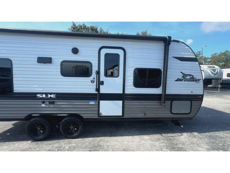 The Jayco Jay Flight SLX travel trailer is quite easy to own because it is lightweight for an easier towing experience. Built on a fully integrated A-frame with galvanized-steel, impact-resistant wheel wells, the Jay Flight SLX has quality at its very foundation. That quality continues on to the electric self-adjusting brakes, easy-lube hubs, Magnum Truss roof system, and LP quick connect. Some of what the mandatory Customer Value Package includes backup camera prep, Keyed-Alike entry and baggage doors, marine grade exterior speakers, and an on-demand tankless water heater. The optional STX Edition for Indiana built units only and the optional Baja Package built for Idaho units only includes Goodyear off-road tires, an enclosed underbelly, a deluxe graphics package, and a wide-stance axle to name a few features.