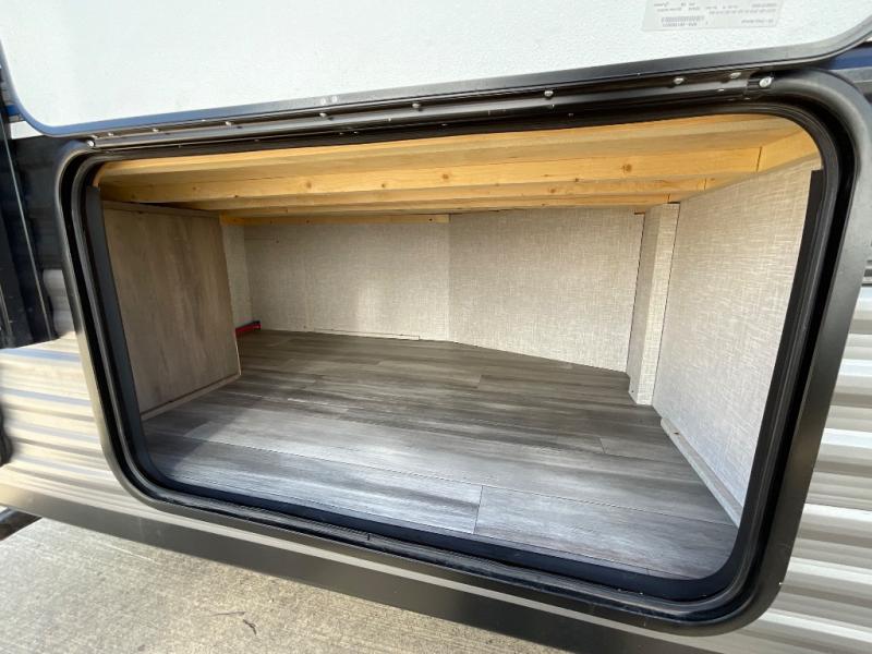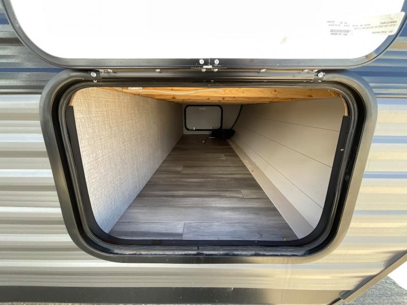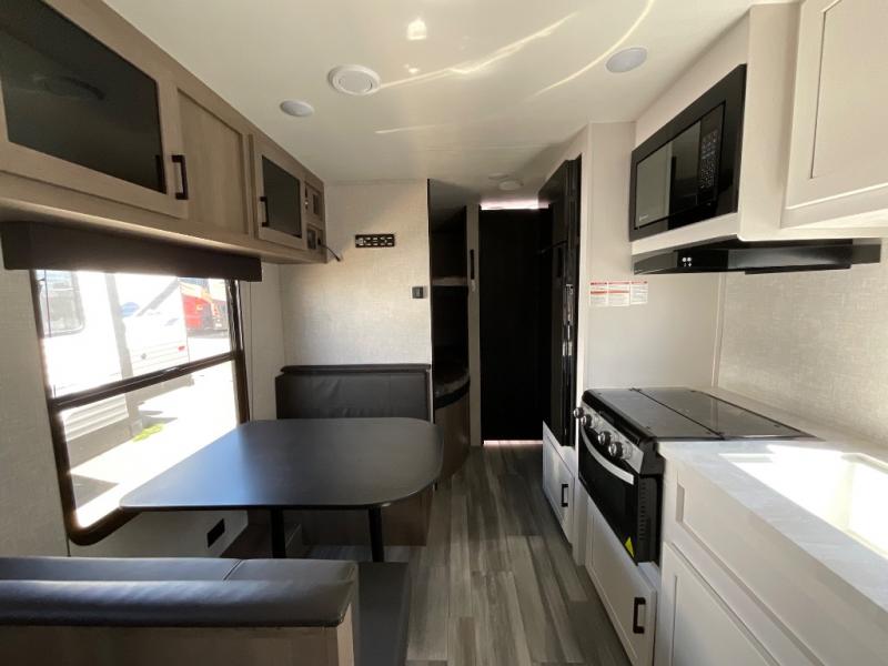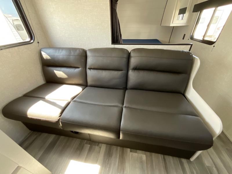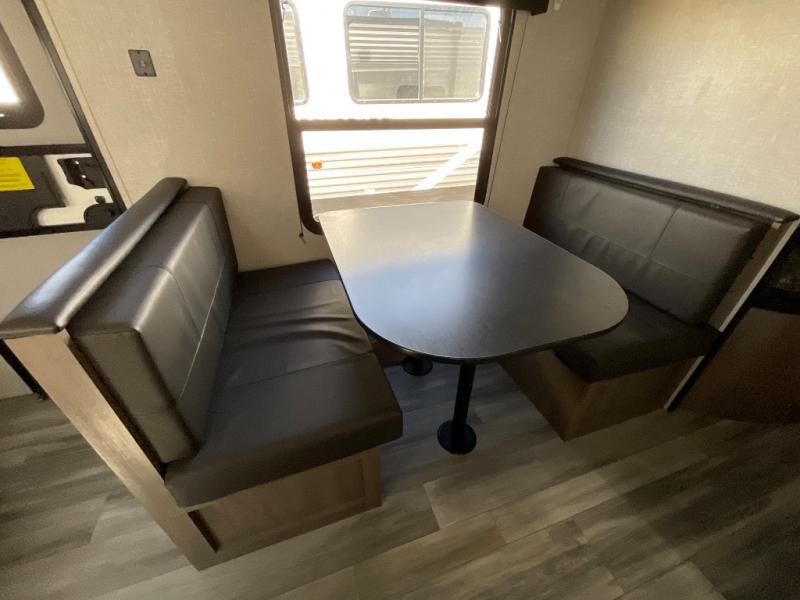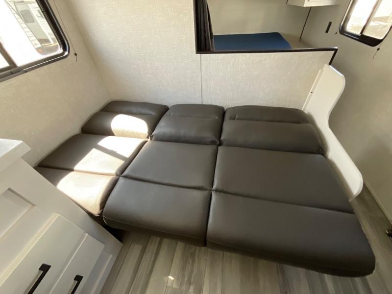 You can comfortably sleep up to 10 people in this trailer thanks to the double-size bunks, the RV queen bed in the front bedroom, plus the booth dinette and jack-knife sofa in the main living area! The chef of your crew will have a three burner cooktop and microwave oven to prepare meals, and everyone can store their favorite drinks in the 8 cu. ft. 12V refrigerator. The bathroom includes a tub/shower and a toilet, with the sink just outside of this room so others can brush their teeth if one is taking a shower before bed. The outside storage will let you bring along fishing poles and the 16' power awning with LED lights will create a nice place to gather in the evenings!