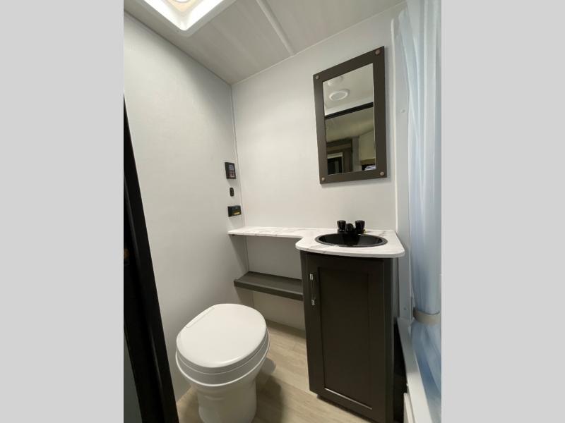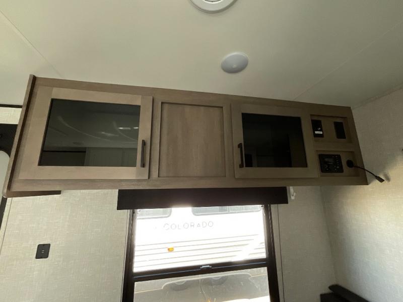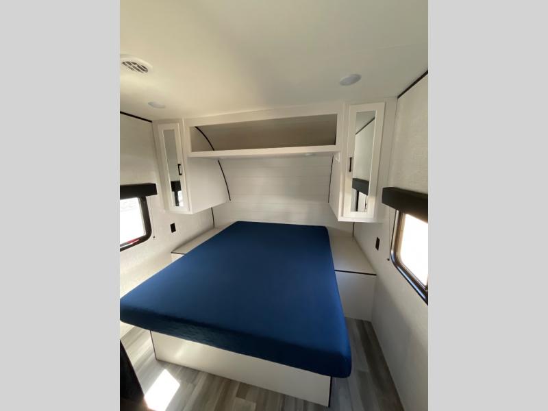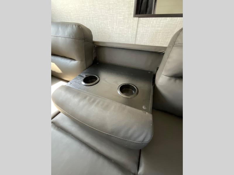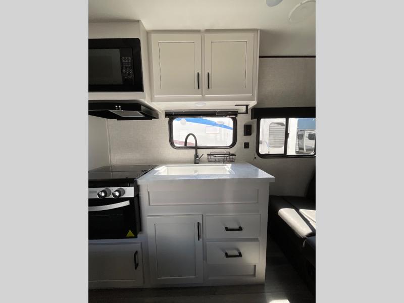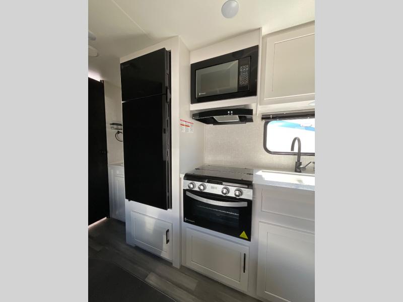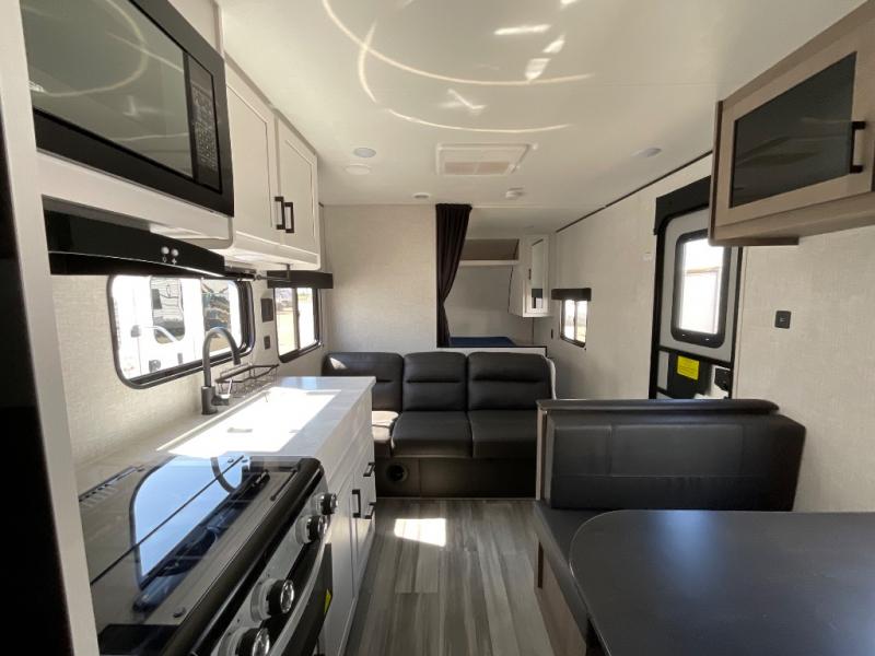 You can comfortably sleep up to 10 people in this trailer thanks to the double-size bunks, the RV queen bed in the front bedroom, plus the booth dinette and jack-knife sofa in the main living area! The chef of your crew will have a three burner cooktop and microwave oven to prepare meals, and everyone can store their favorite drinks in the 8 cu. ft. 12V refrigerator. The bathroom includes a tub/shower and a toilet, with the sink just outside of this room so others can brush their teeth if one is taking a shower before bed. The outside storage will let you bring along fishing poles and the 16' power awning with LED lights will create a nice place to gather in the evenings!