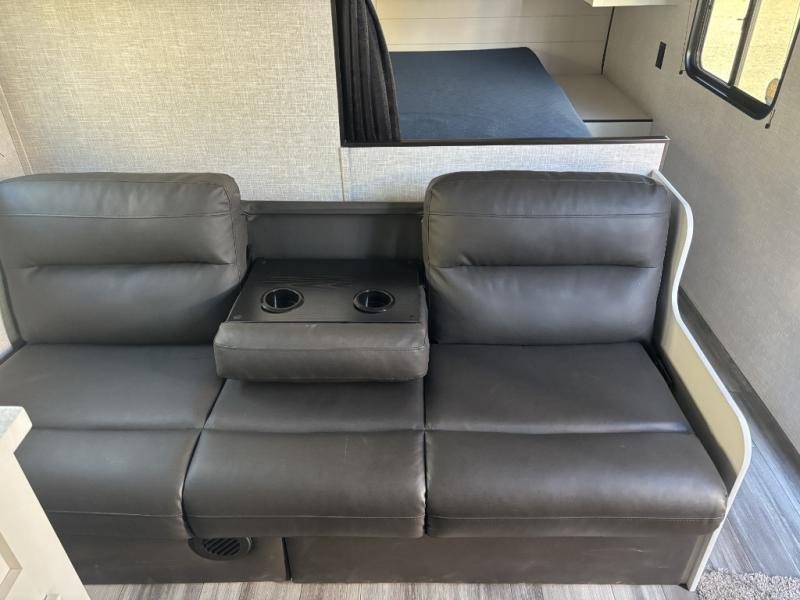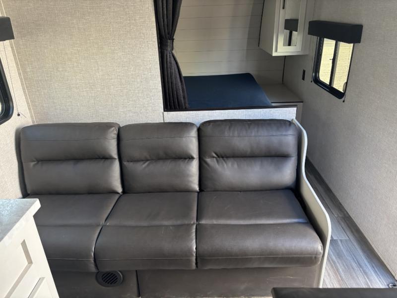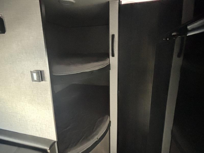 You can comfortably sleep eight to ten people in this trailer thanks to the double-size bunks, the RV queen bed in the front bedroom, plus the booth dinette and jack-knife sofa in the main living area! The chef of your crew will have a three burner cooktop and microwave oven to prepare meals, and everyone can store their favorite drinks in the 8 cu. ft. 12V refrigerator. The bathroom includes a shower and a toilet, with the sink just outside of this room so others can brush their teeth if one is taking a shower before bed. The outside storage will let you bring along fishing poles and the 16' power awning with LED lights will create a nice place to gather in the evenings!