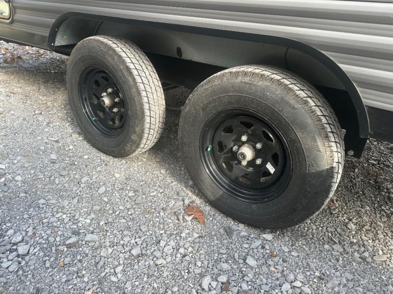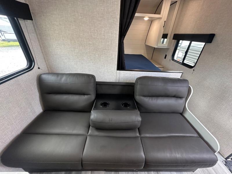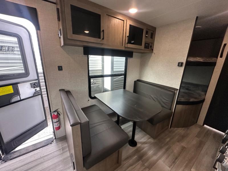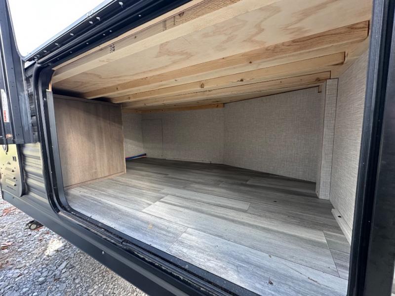 You can comfortably sleep up to 10 people in this trailer thanks to the double-size bunks, the RV queen bed in the front bedroom, plus the booth dinette and jack-knife sofa in the main living area! The chef of your crew will have a three burner cooktop and microwave oven to prepare meals, and everyone can store their favorite drinks in the 8 cu. ft. 12V refrigerator. The bathroom includes a tub/shower and a toilet, with the sink just outside of this room so others can brush their teeth if one is taking a shower before bed. The outside storage will let you bring along fishing poles and the 16' power awning with LED lights will create a nice place to gather in the evenings!