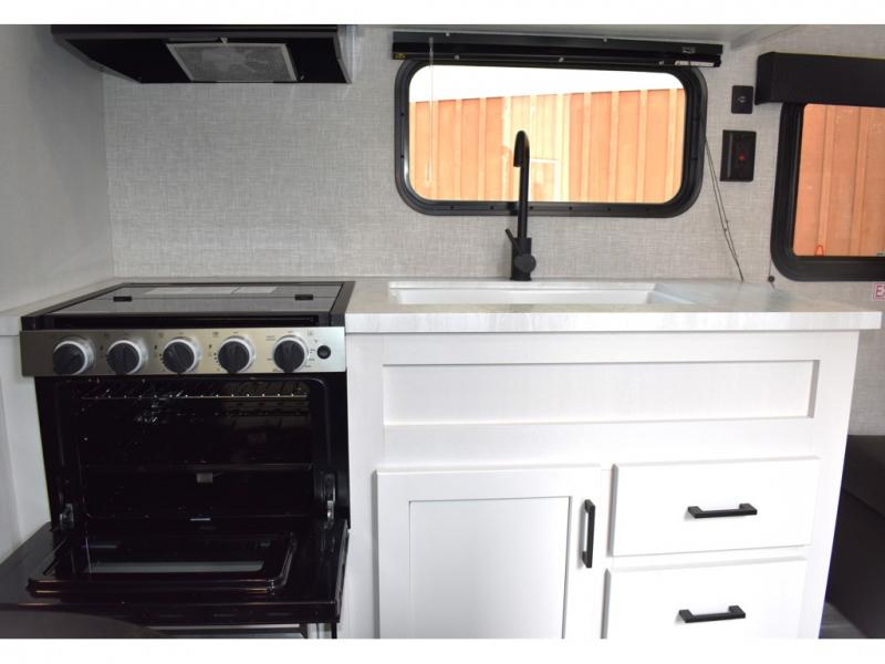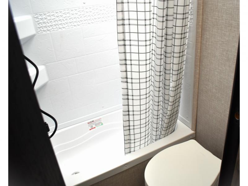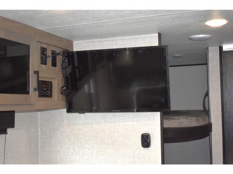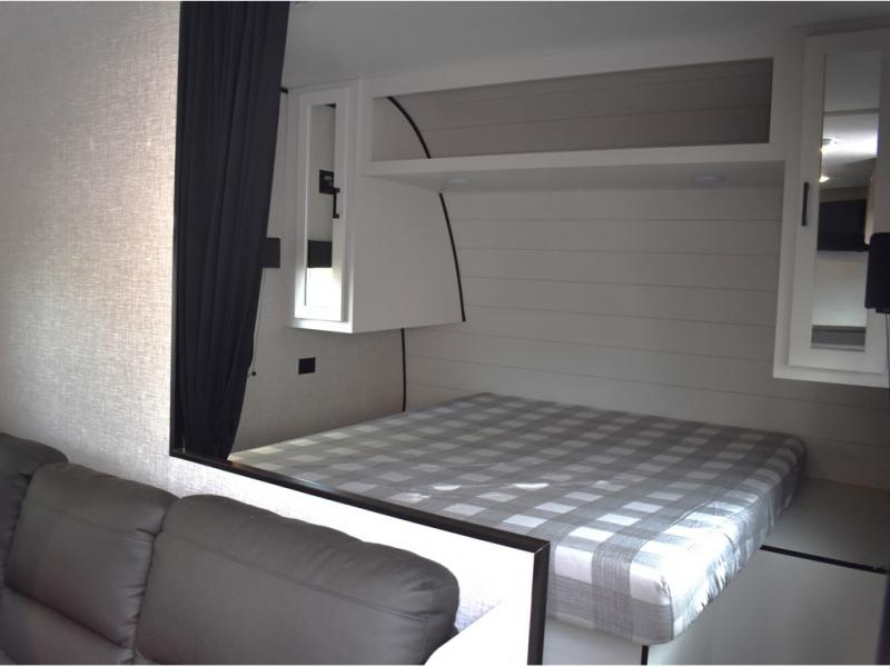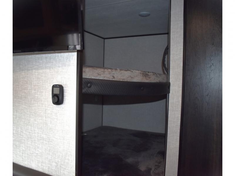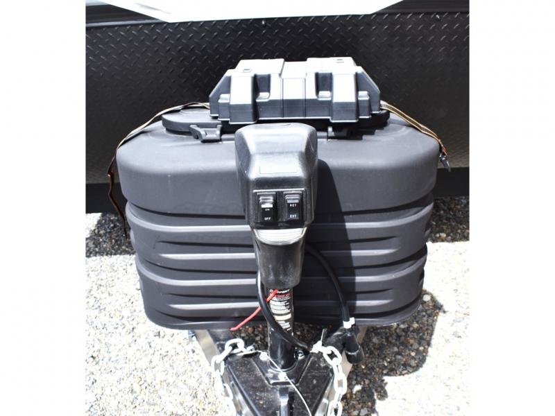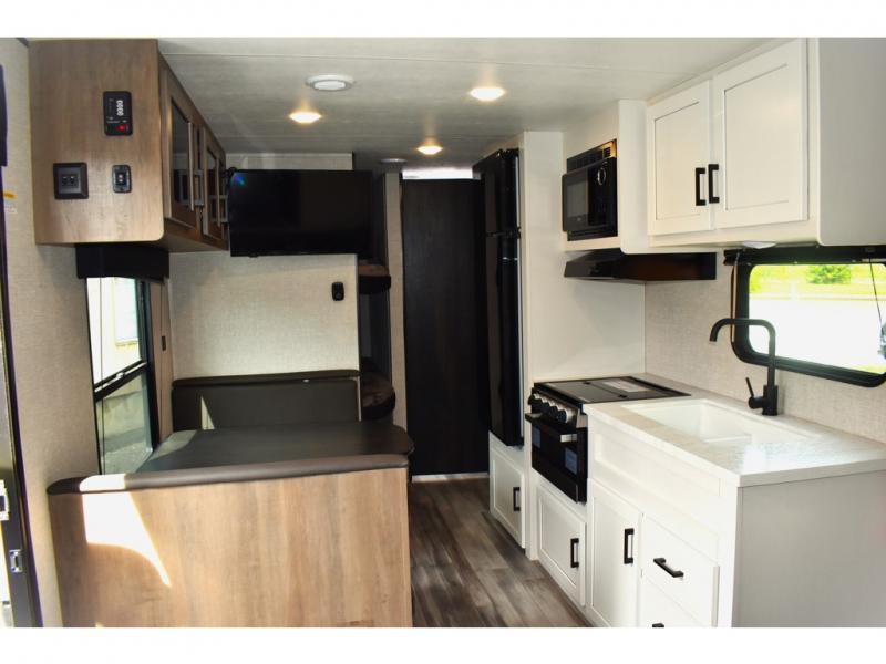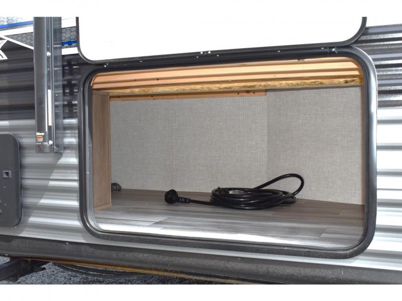 You can comfortably sleep up to 10 people in this trailer thanks to the double-size bunks, the RV queen bed in the front bedroom, plus the booth dinette and jack-knife sofa in the main living area! The chef of your crew will have a three burner cooktop and microwave oven to prepare meals, and everyone can store their favorite drinks in the 8 cu. ft. 12V refrigerator. The bathroom includes a tub/shower and a toilet, with the sink just outside of this room so others can brush their teeth if one is taking a shower before bed. The outside storage will let you bring along fishing poles and the 16' power awning with LED lights will create a nice place to gather in the evenings!