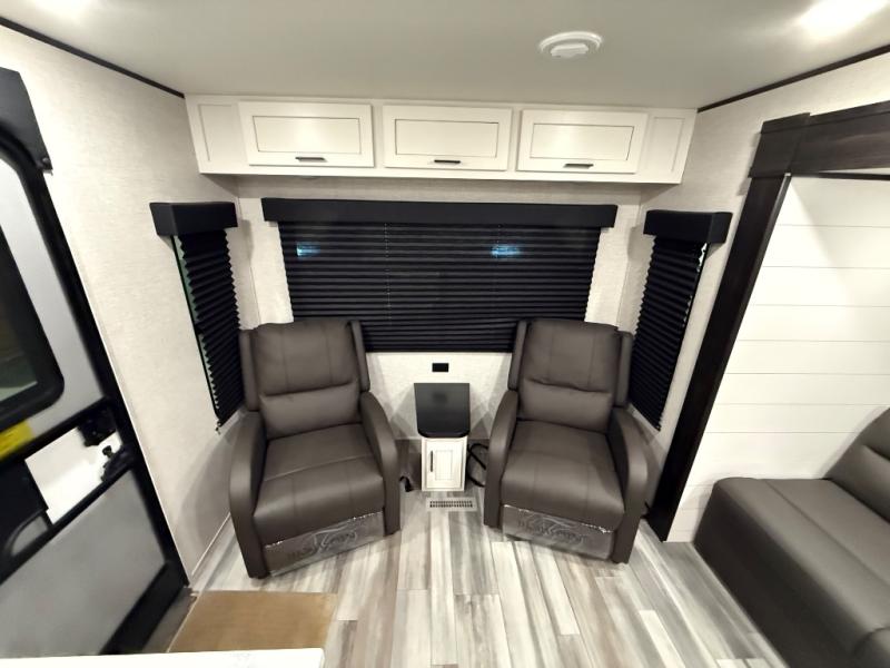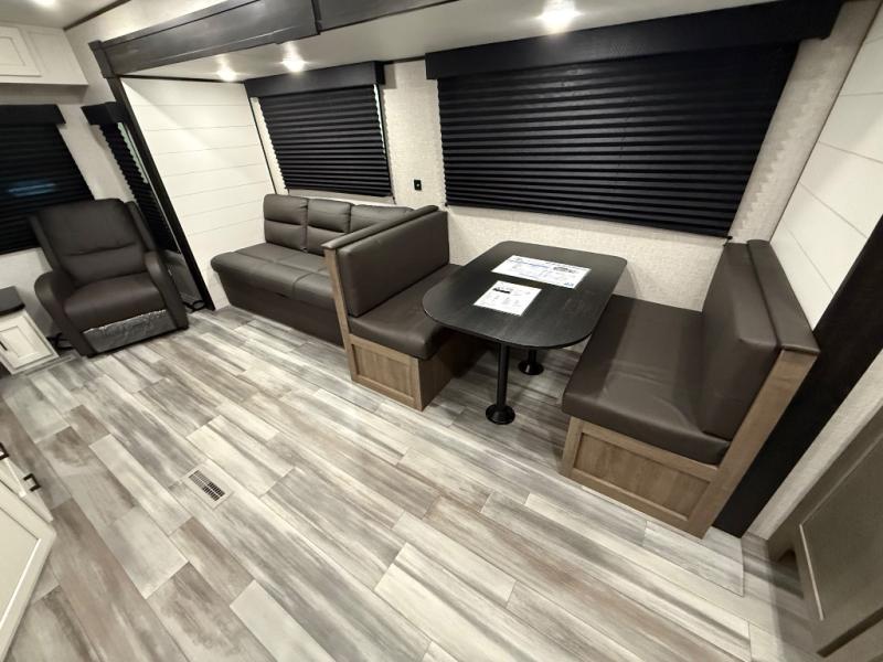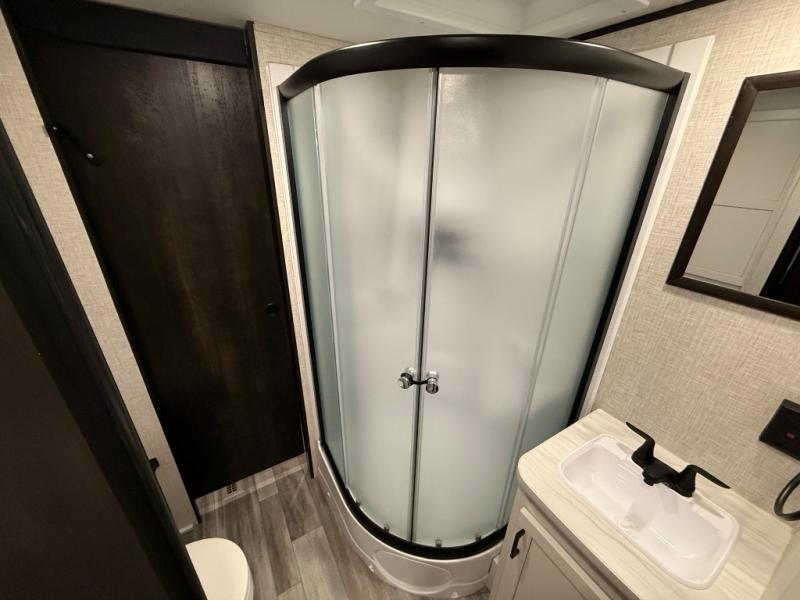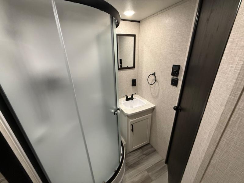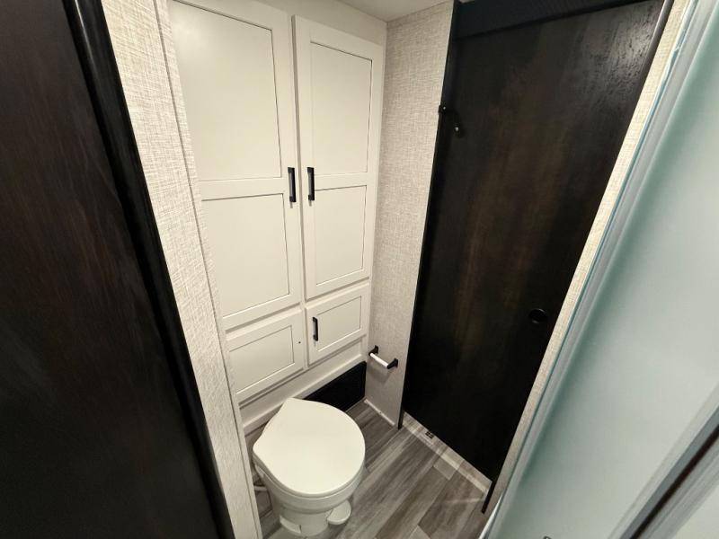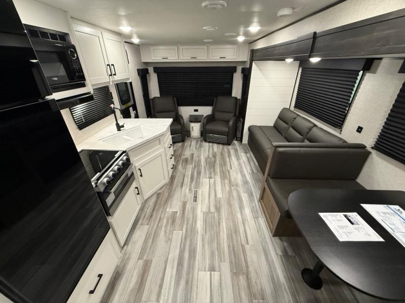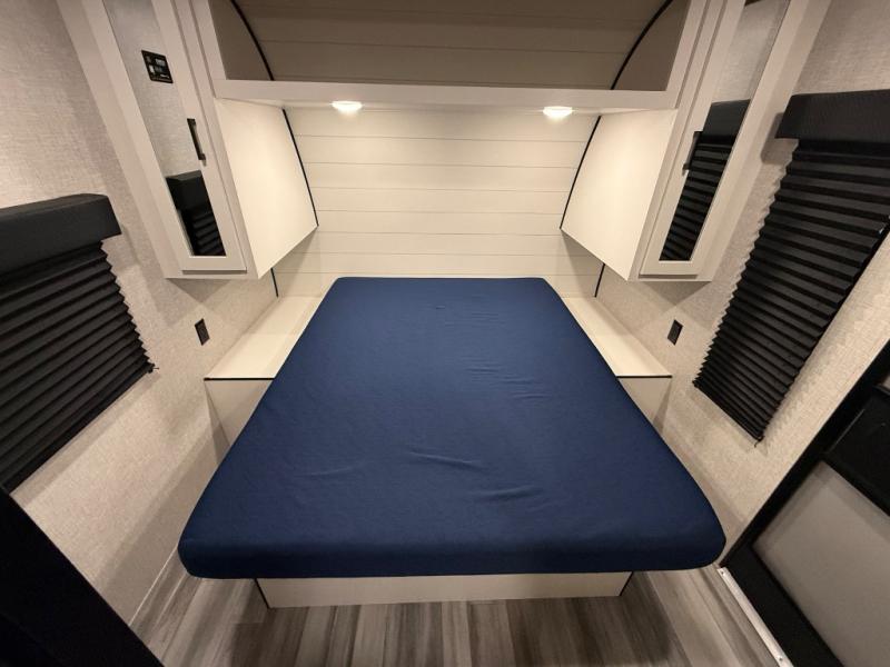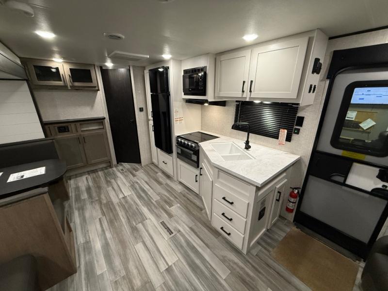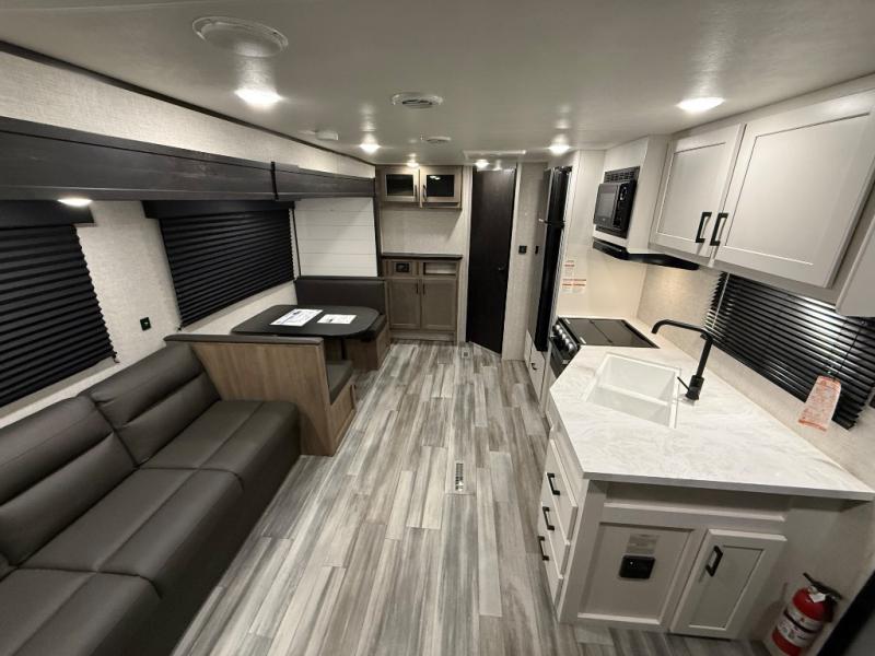 You can comfortably sleep up to six people in this trailer thanks to the RV queen bed in the front bedroom, plus the booth dinette and jack-knife sofa in the main living area! The chef of your crew will have a three burner cooktop and microwave oven to prepare meals, and everyone can store their favorite drinks in the 8 cu. ft. 12V refrigerator. The walk-through bath is spacious and includes a radius shower, toilet, a sink, and linen closet and is the full width of the unit. The outside storage will let you bring along camp chairs and games, fishing poles and more, plus the 18' 3" power awning with LED lights will create a nice place to gather in the evenings!
