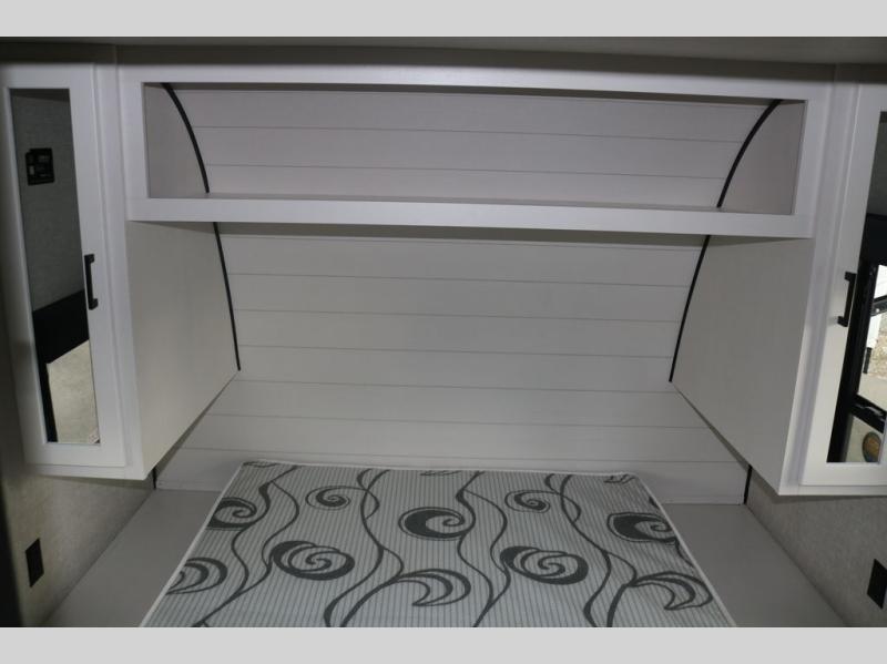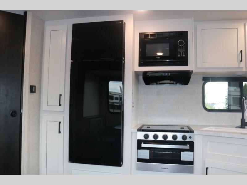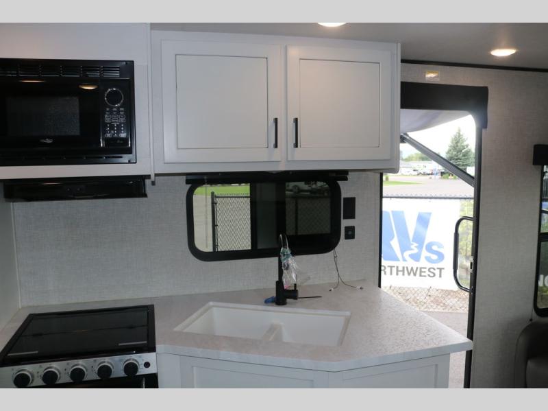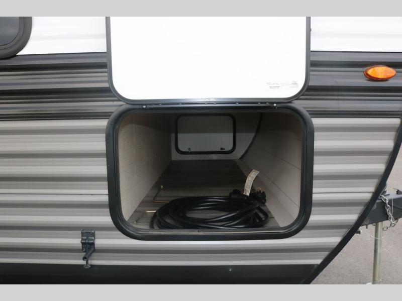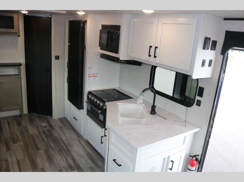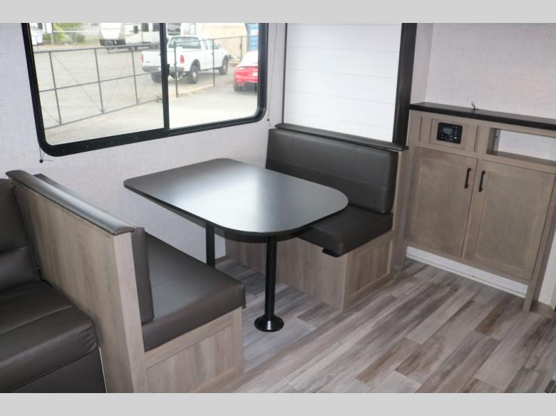You can comfortably sleep up to six people in this trailer thanks to the RV queen bed in the front bedroom, plus the booth dinette and jack-knife sofa in the main living area! The chef of your crew will have a three burner cooktop and microwave oven to prepare meals, and everyone can store their favorite drinks in the 8 cu. ft. 12V refrigerator. The walk-through bath is spacious and includes a radius shower, toilet, a sink, and linen closet and is the full width of the unit. The outside storage will let you bring along camp chairs and games, fishing poles and more, plus the 18' power awning with LED lights will create a nice place to gather in the evenings!