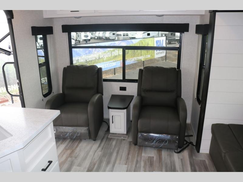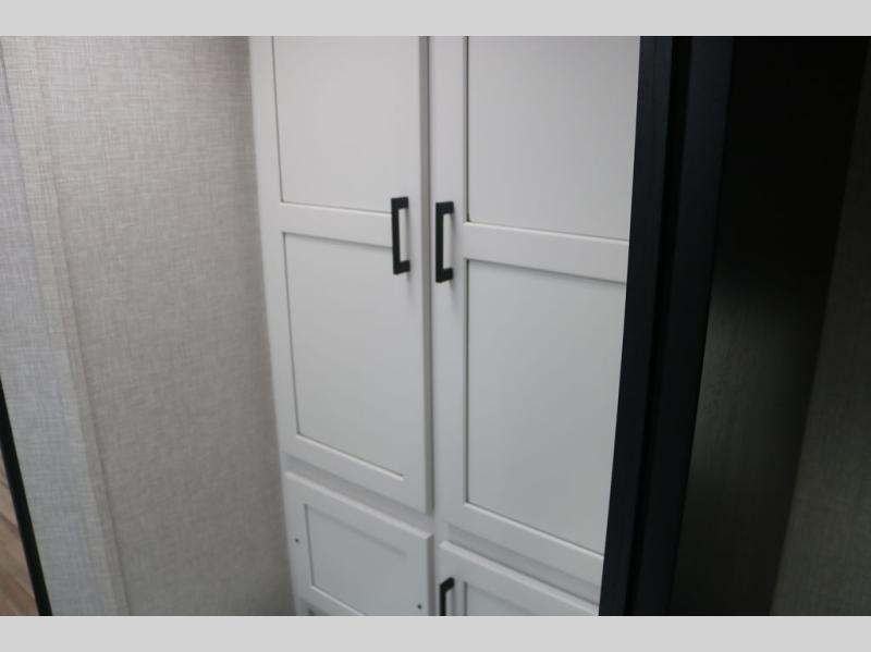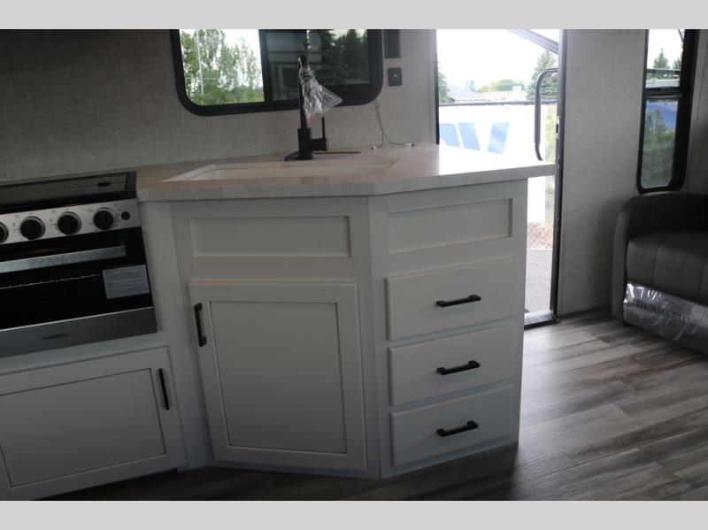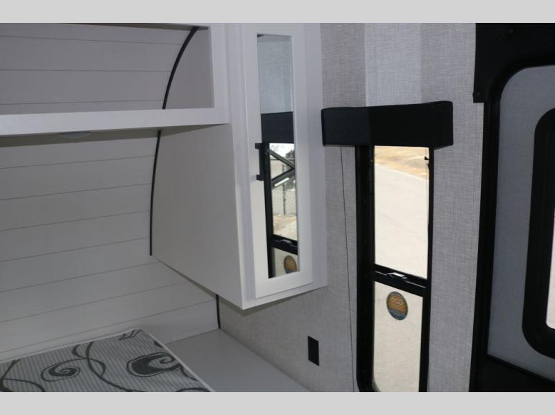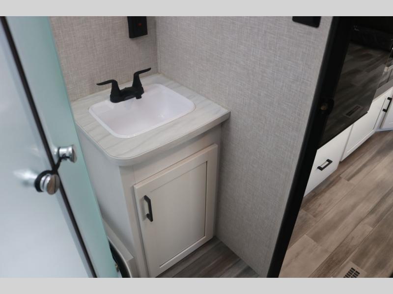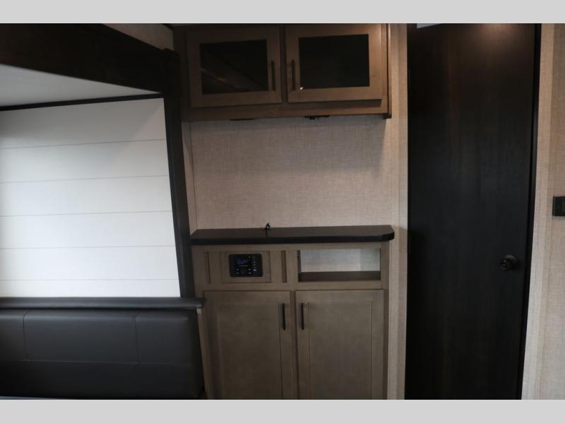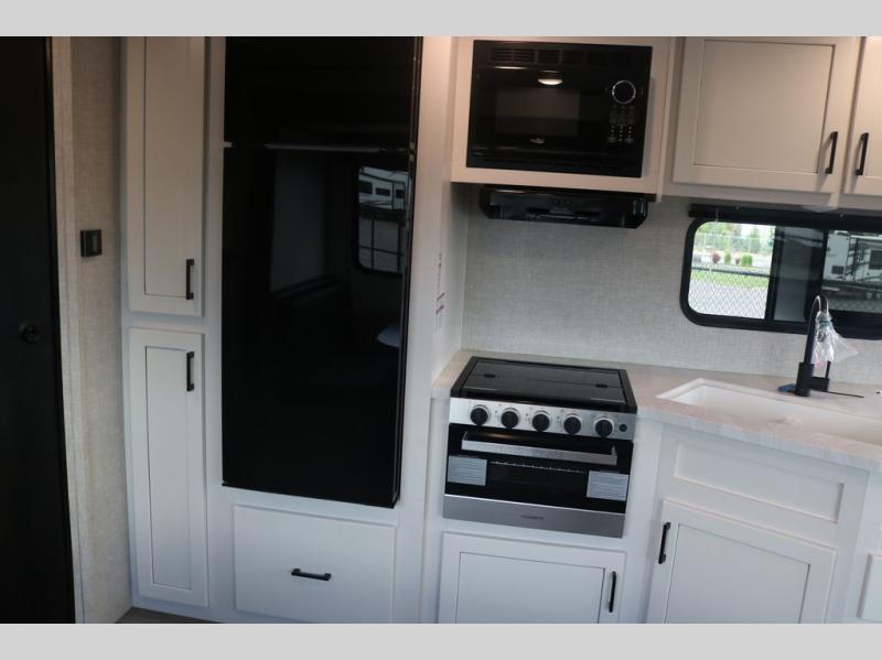 You can comfortably sleep up to six people in this trailer thanks to the RV queen bed in the front bedroom, plus the booth dinette and jack-knife sofa in the main living area! The chef of your crew will have a three burner cooktop and microwave oven to prepare meals, and everyone can store their favorite drinks in the 8 cu. ft. 12V refrigerator. The walk-through bath is spacious and includes a radius shower, toilet, a sink, and linen closet and is the full width of the unit. The outside storage will let you bring along camp chairs and games, fishing poles and more, plus the 18' power awning with LED lights will create a nice place to gather in the evenings!