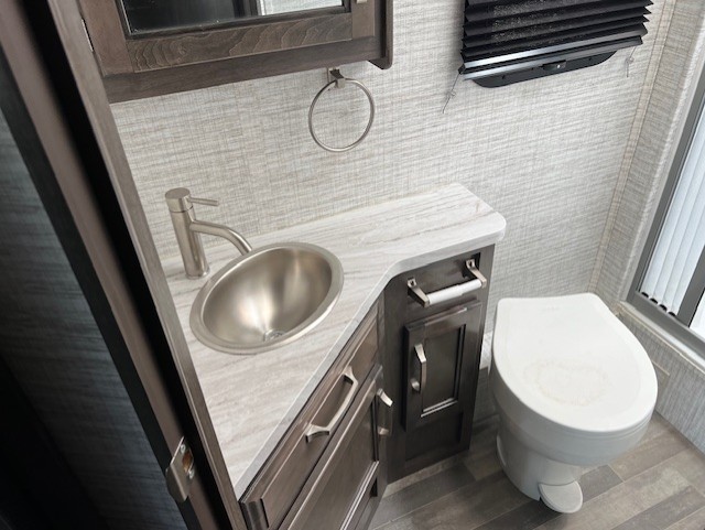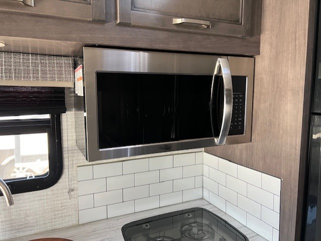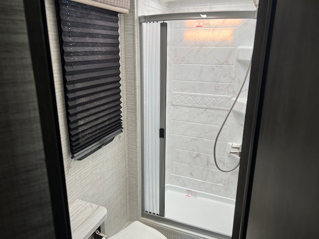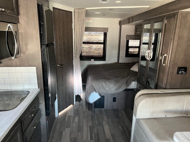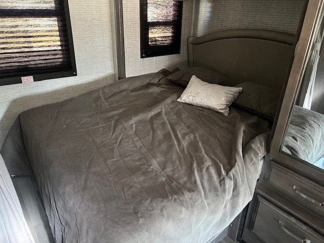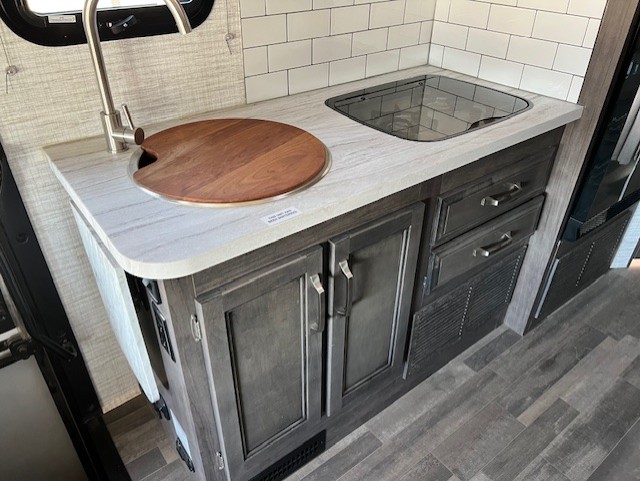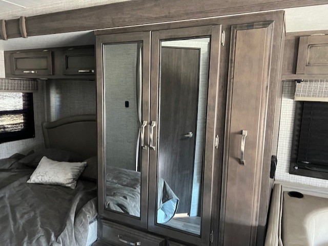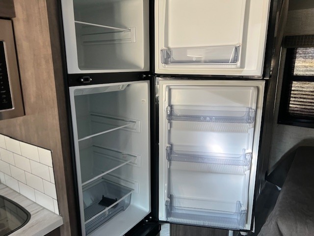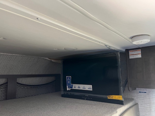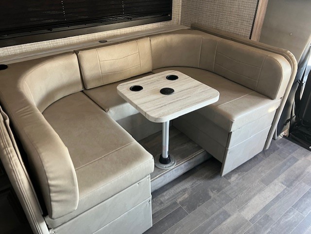 Head across the states in this comfortable coach that can sleep five each night. You will enjoy an RV queen bed just like you have at home, and your guests can sleep on the U-shaped dinette and cab-over bunk. If you're not needing the overhead bunk, just choose the optional front entertainment center with a 32" LED HDTV, and the dinette can also be optioned out for theater seating to make this a couples coach. You can prepare all your meals on the Suburban two burner drop-in cooktop, or use the convection microwave. The flip-up counter will provide more counter space, and all your perishables can be stored in the 10 cu. ft. 12V refrigerator.