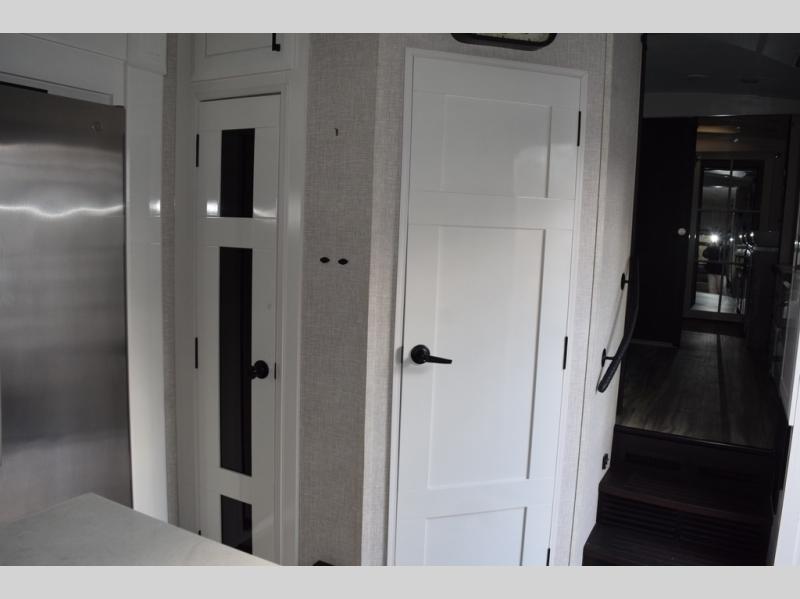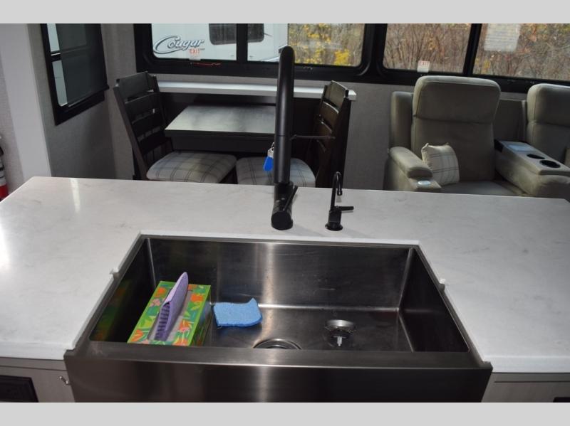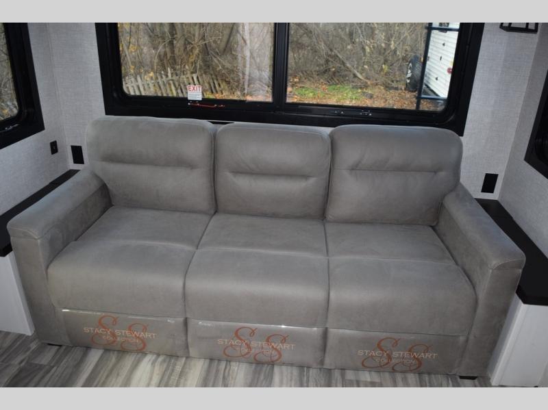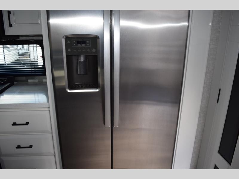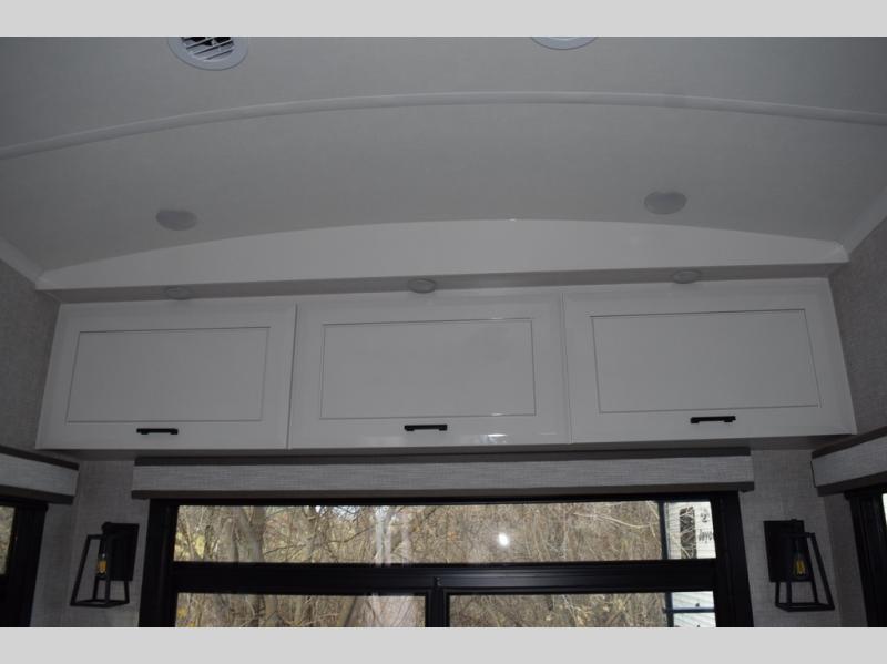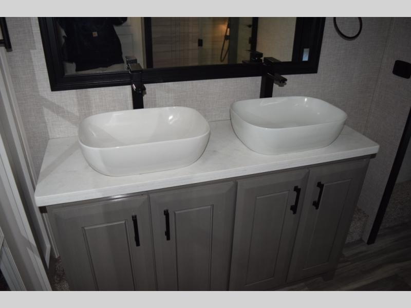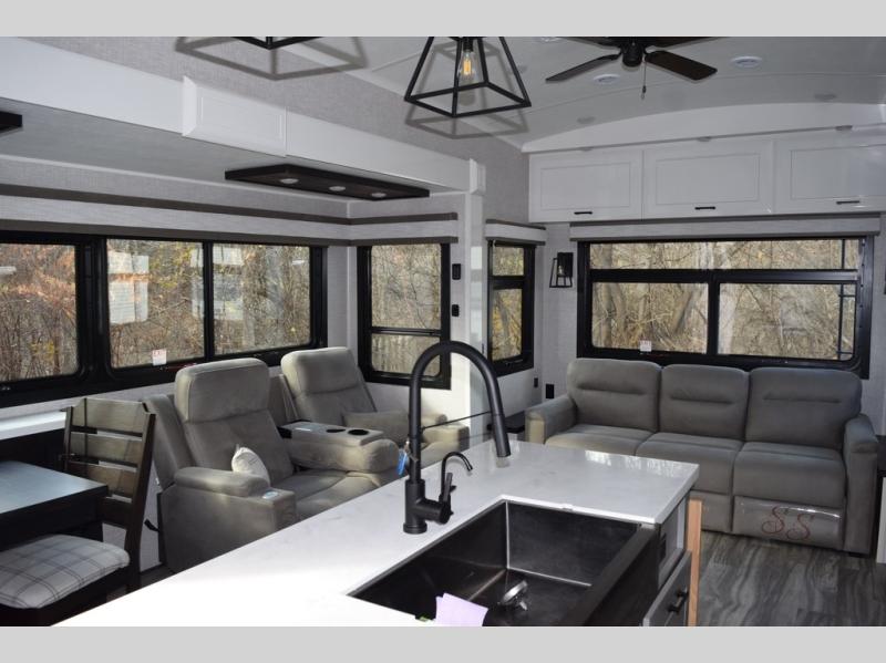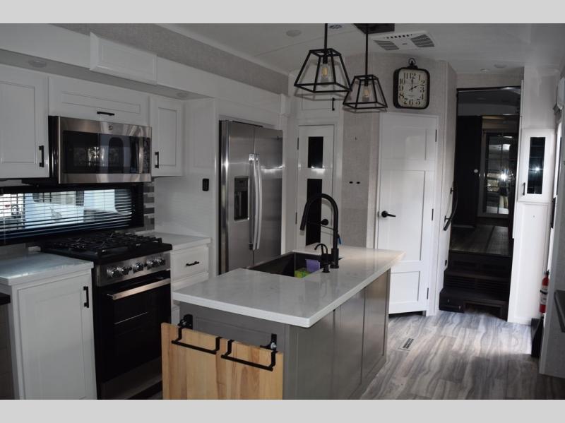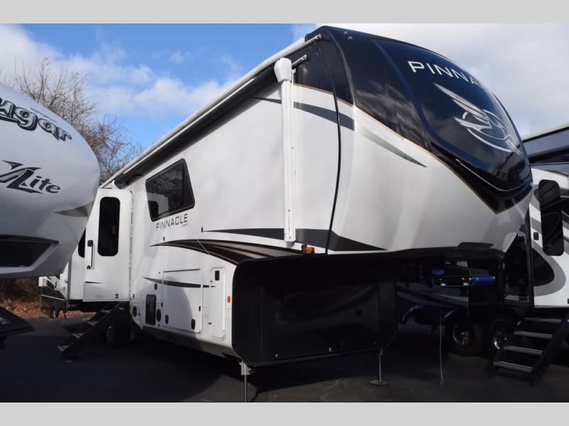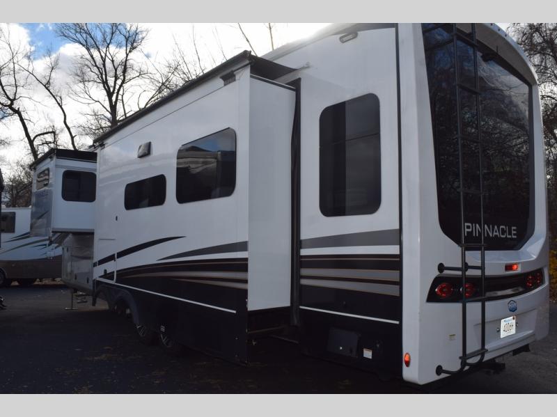 Each Pinnacle fifth wheel features Stronghold VBL lamination for the lightest, yet strongest construction in the RV industry. Add that to the Magnum Truss XL6 roof system and Climate Shield zero-degree tested weather protection and you'll be enjoying your fifth wheel for years to come. Some of the exterior conveniences you will appreciate are the Keyed-Alike lock system, the fully enclosed, universal docking center, and the 6-point hydraulic auto-leveling system for quick and easy set up. The 5 Star Handling Package will make towing a fifth wheel a walk in the park, and the two Whisper Quiet A/C units will keep you comfortable during the hot summer months. Inside, you'll enjoy the farmhouse stainless steel sink, the handcrafted hardwood glazed cabinetry, the vinyl flooring throughout, plus many more comforts. There is even a central vacuum system, a wireless remote control system, USB ports throughout, plus many more conveniences to make each trip enjoyable.