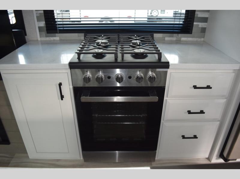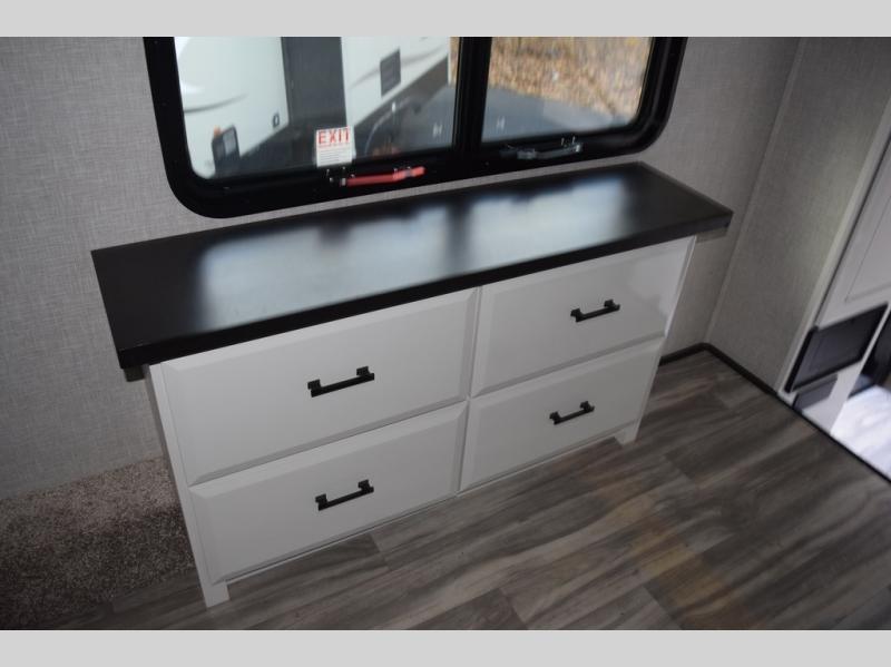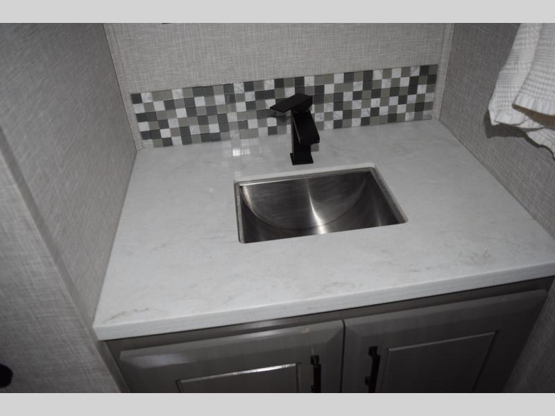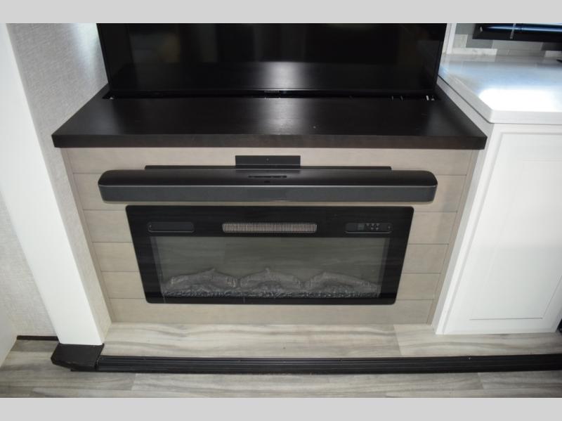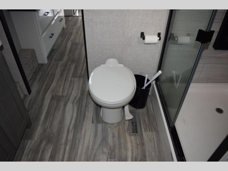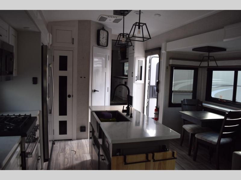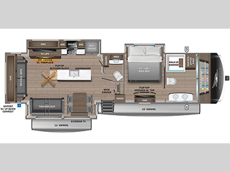 You can't go wrong with this fifth wheel that can sleep four! You will love how much space you have in the main living area thanks to the dual opposing slides, and there is a kitchen island here with a pull-out extension for added prep space. The convenient half bath is right off of the kitchen for quick restroom breaks, and you'll find a shoe garage and a wardrobe just as you enter the unit to keep the RV tidy. Head to the master bedroom for a rest on the king bed slide out, or you may want to watch a show on the 32" bedroom TV. The front master bath may be your favorite feature of this unit. Here, you'll find dual bath sinks, a walk-in shower with a seat, plus a spacious walk-in closet for your clothes. And don't overlook the exterior with its two power awnings, 32" exterior TV, and a Jayport with LP quick connect for your outdoor grill.