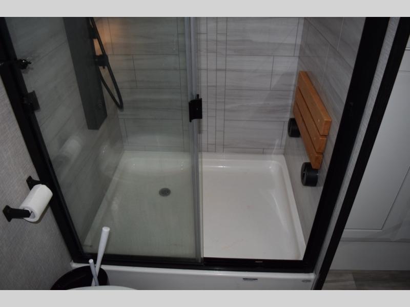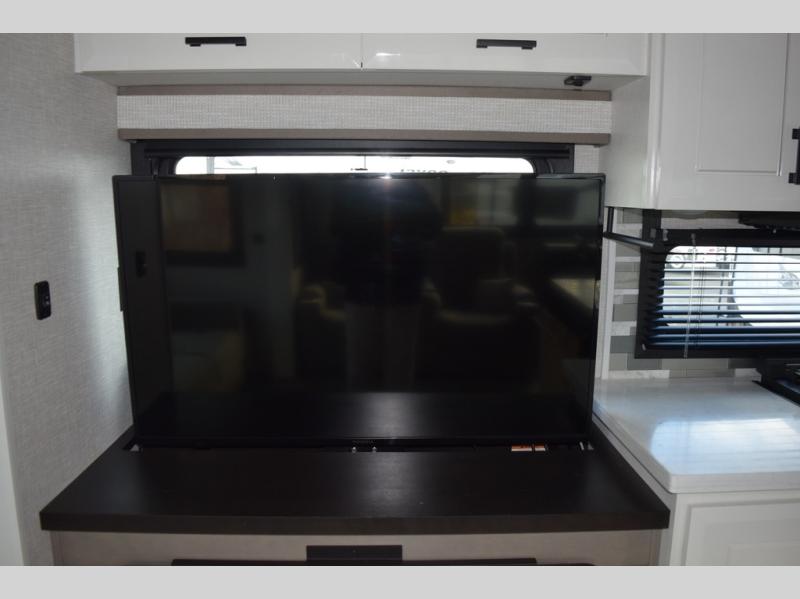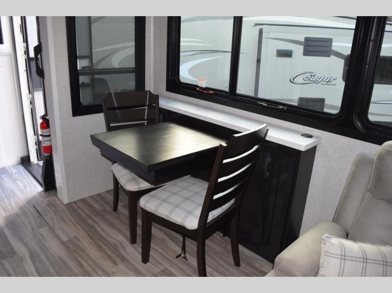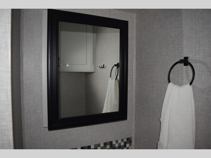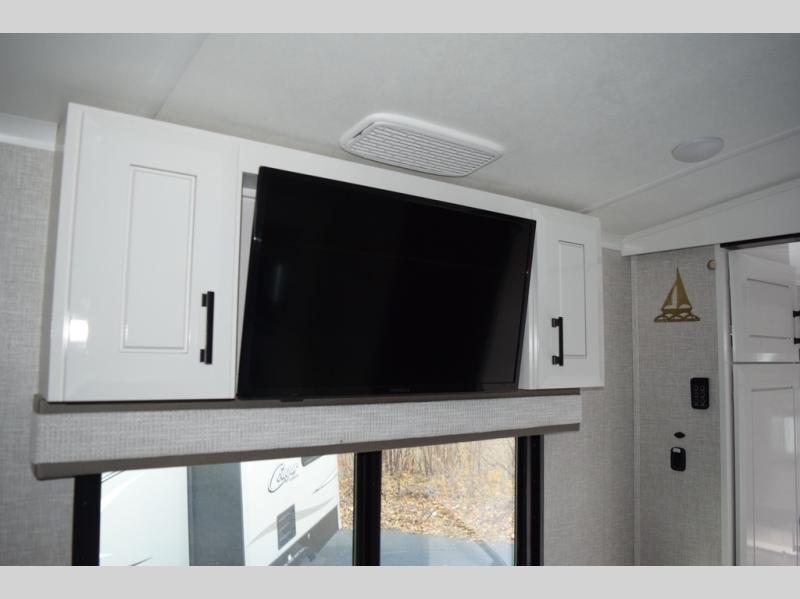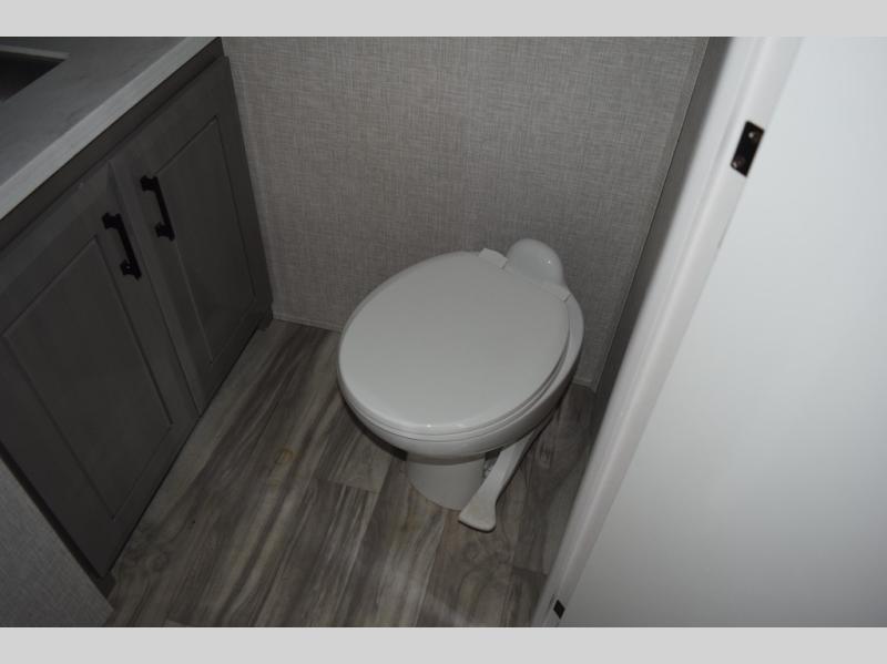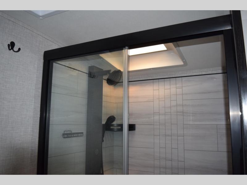 You can't go wrong with this fifth wheel that can sleep four! You will love how much space you have in the main living area thanks to the dual opposing slides, and there is a kitchen island here with a pull-out extension for added prep space. The convenient half bath is right off of the kitchen for quick restroom breaks, and you'll find a shoe garage and a wardrobe just as you enter the unit to keep the RV tidy. Head to the master bedroom for a rest on the king bed slide out, or you may want to watch a show on the 32" bedroom TV. The front master bath may be your favorite feature of this unit. Here, you'll find dual bath sinks, a walk-in shower with a seat, plus a spacious walk-in closet for your clothes. And don't overlook the exterior with its two power awnings, 32" exterior TV, and a Jayport with LP quick connect for your outdoor grill.