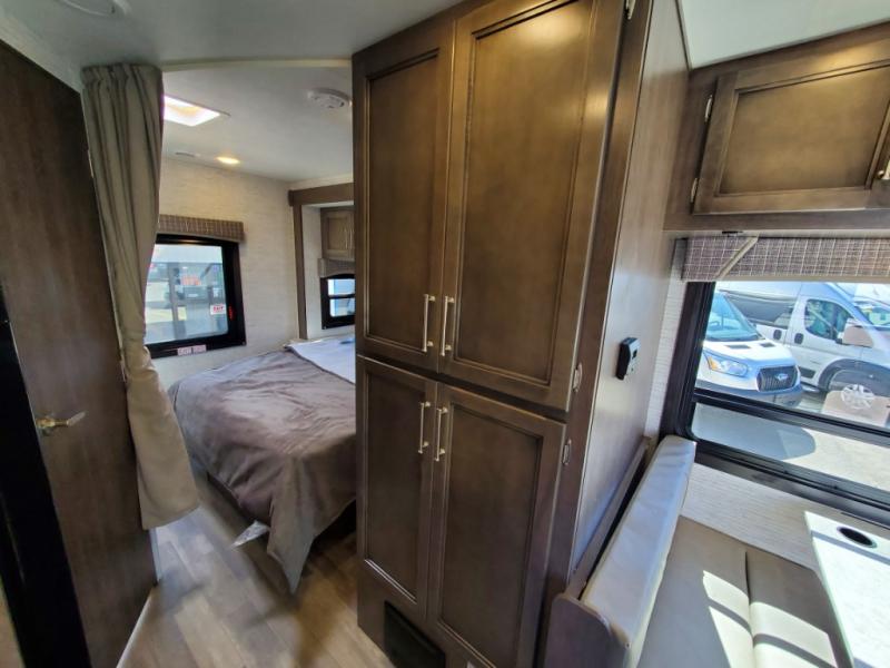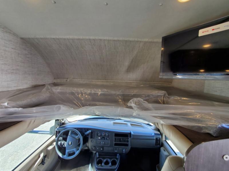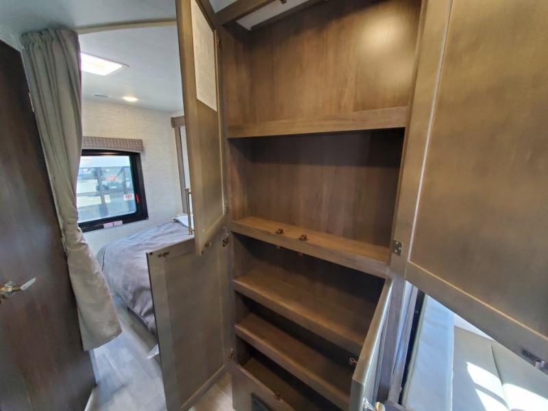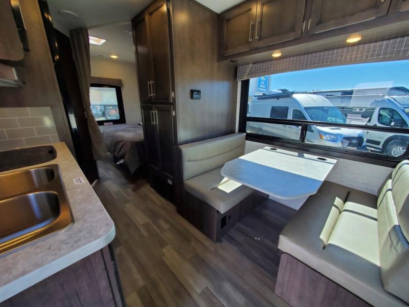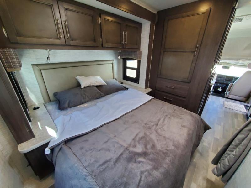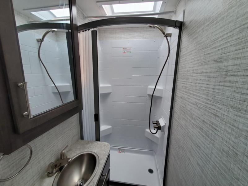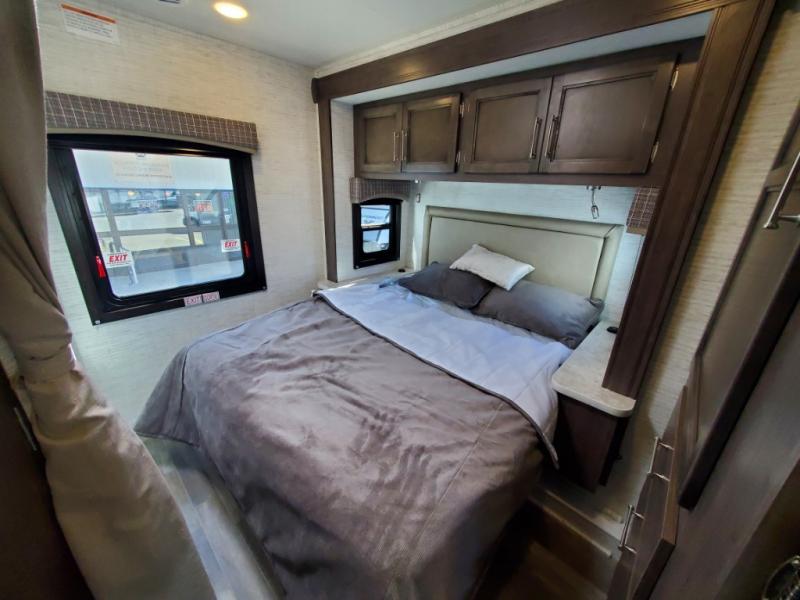 There's a comfortable place to sleep for everyone in this motorhome! From the corner 60" x 70" queen bed that slides out to the bunk over cab, and even the 42" x 70" booth dinette once converted. You can store your favorite snacks and hang up your clothes in the wardrobe/pantry. The chef can prepare delicious meals with the two burner cooktop and if there happens to be any leftovers then they can be stored in the 10 cu. ft. 12V refrigerator. The rear corner bathroom has a 24" x 36" shower that you are sure to enjoy after a long day of traveling!
