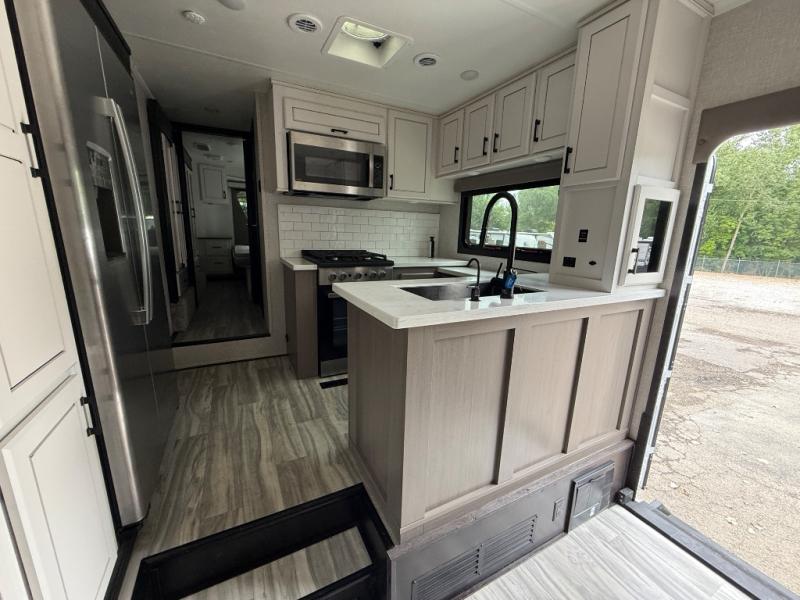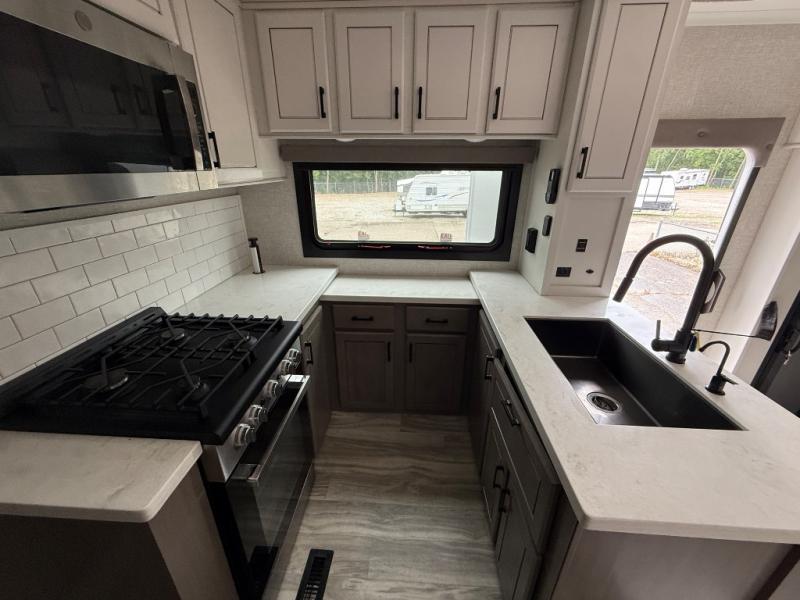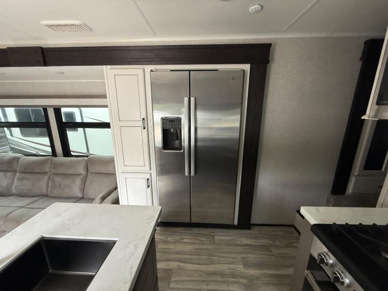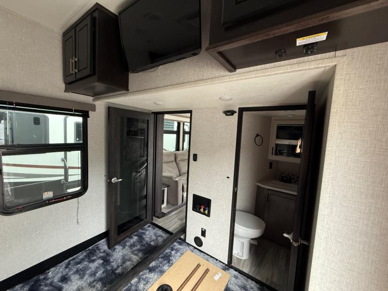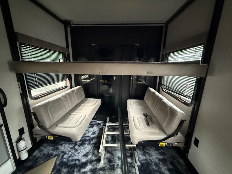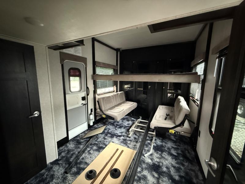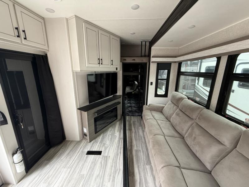It's time to enjoy your toys and outdoor fun in this toy hauler! This separate garage offers an electric queen bed above rear convertible sofas, a second entry door, a half bath plus a place to add a washer/dryer option if you like. Your friends can have their own space when they join you. And the party deck will be a popular hangout everywhere you go! The separate living and kitchen area offers patio doors to get to the side patio party deck with an exterior TV so you can relax above ground while outdoors. Back inside you will have a SuperSofa with heat, massage, recliners, cupholders and LED lighting to enjoy while watching the Smart LED HDTV with a fireplace below. The chef will have a U-shaped countertop with all the kitchen amenities such as a GE Profile Series 30 in. residential convection microwave with built in air fryer, and the 17 cu.ft. 12V refrigerator is just a few steps away. Everyone can take turns getting cleaned up in the inventive side-aisle bath with a walk-in shower. The front master bedroom has a walk-around king bed for all-around comfort, plus a slide out with a dresser and two wardrobes that stretches into the hallway.