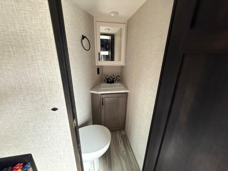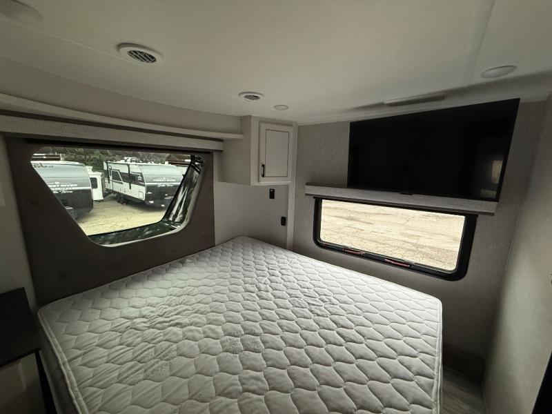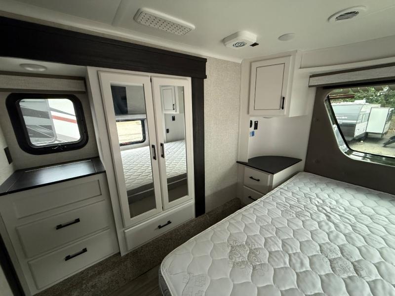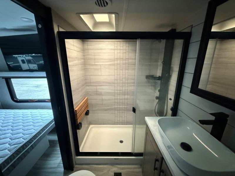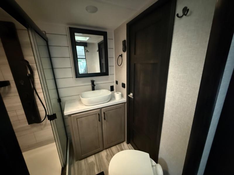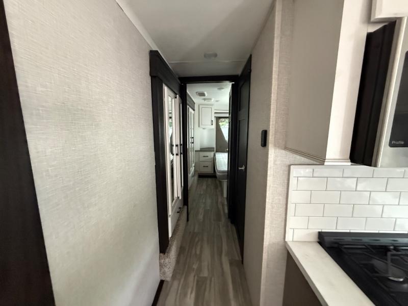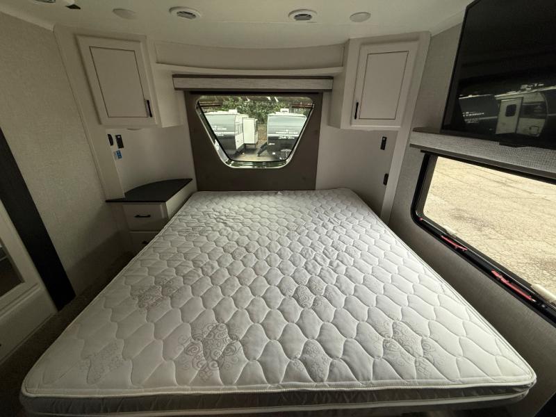 It's time to enjoy your toys and outdoor fun in this toy hauler! This separate garage offers an electric queen bed above rear convertible sofas, a second entry door, a half bath plus a place to add a washer/dryer option if you like. Your friends can have their own space when they join you. And the party deck will be a popular hangout everywhere you go! The separate living and kitchen area offers patio doors to get to the side patio party deck with an exterior TV so you can relax above ground while outdoors. Back inside you will have a SuperSofa with heat, massage, recliners, cupholders and LED lighting to enjoy while watching the Smart LED HDTV with a fireplace below. The chef will have a U-shaped countertop with all the kitchen amenities such as a GE Profile Series 30 in. residential convection microwave with built in air fryer, and the 17 cu.ft. 12V refrigerator is just a few steps away. Everyone can take turns getting cleaned up in the inventive side-aisle bath with a walk-in shower. The front master bedroom has a walk-around king bed for all-around comfort, plus a slide out with a dresser and two wardrobes that stretches into the hallway.
