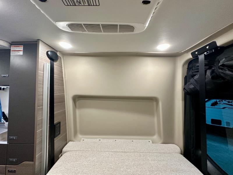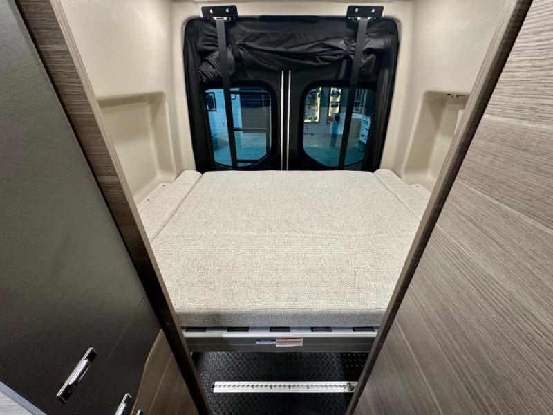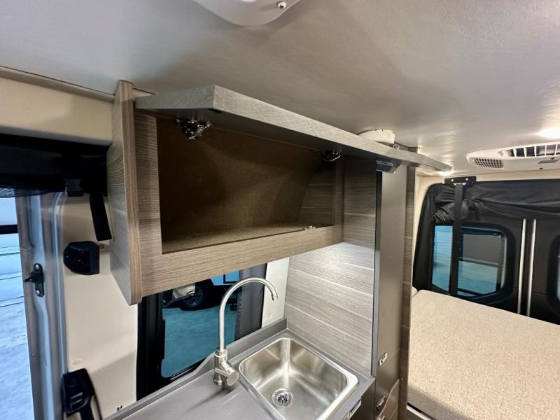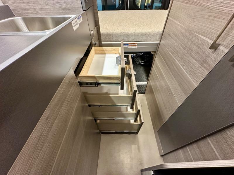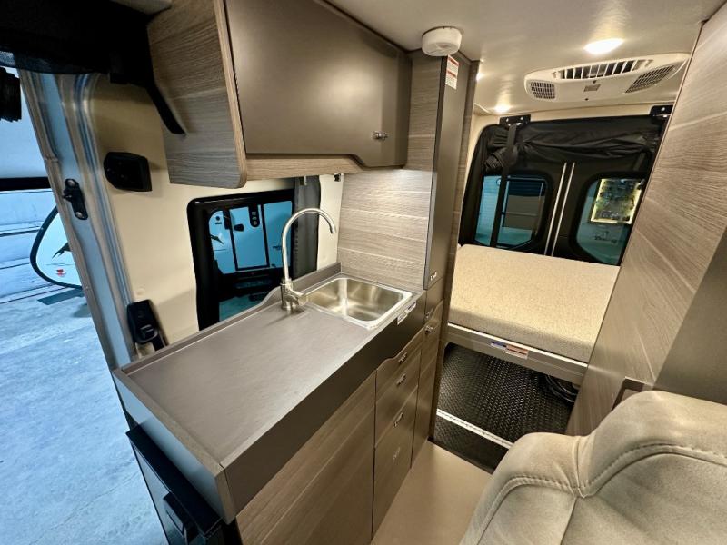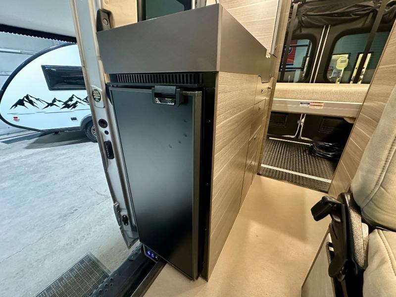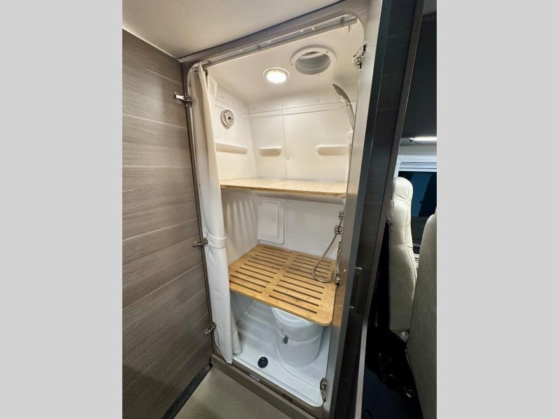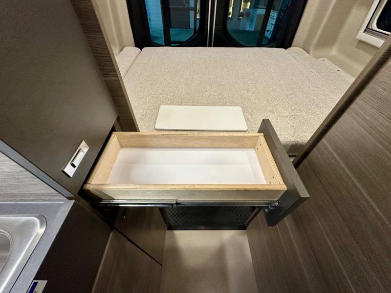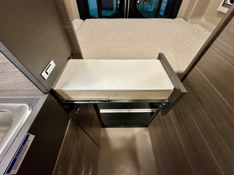 Take some time to get away with your favorite person in this Terrain Class B diesel motorhome! Not only is there room to sleep two with the power lift bed that has a 750-LB capacity, but there is also room to seat a total of four people on the two heated power swivel cab seats and the two additional bucket seats with slide and recline features in front of the removable/adjustable table. You'll love cooking in the kitchen with a portable induction cooktop, stainless steel sink, plus a pantry and 3 cu. ft. DC refrigerator for food storage. The wet bath is very functional with its removable bamboo shelf, powered roof vent, and retractable clothes line.